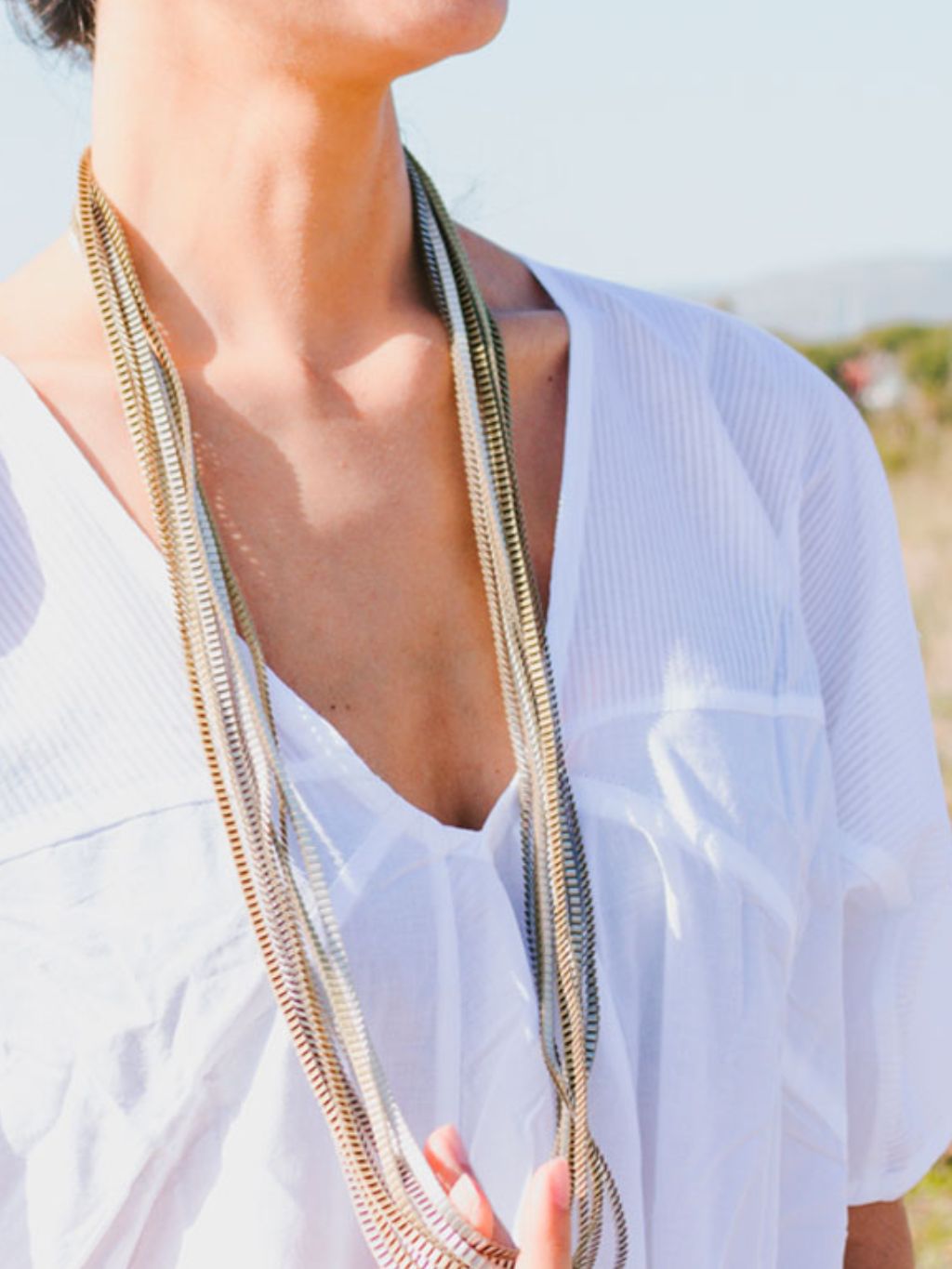 Collar largo de Alexandra Tsoukala hecho de tejido plisado, lo que le da ligereza, elasticidad y durabilidad. Se puede llevar largo o dar dos vueltas, y llevar doble.