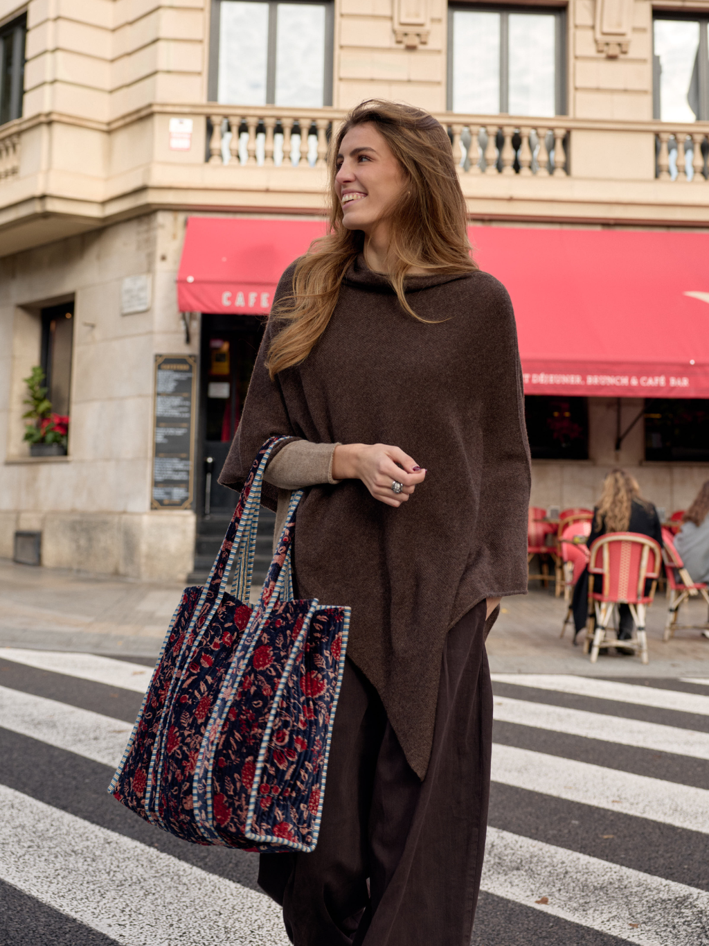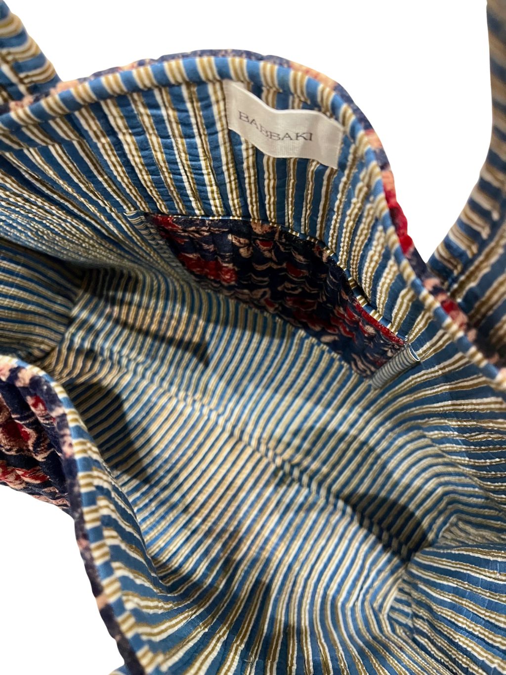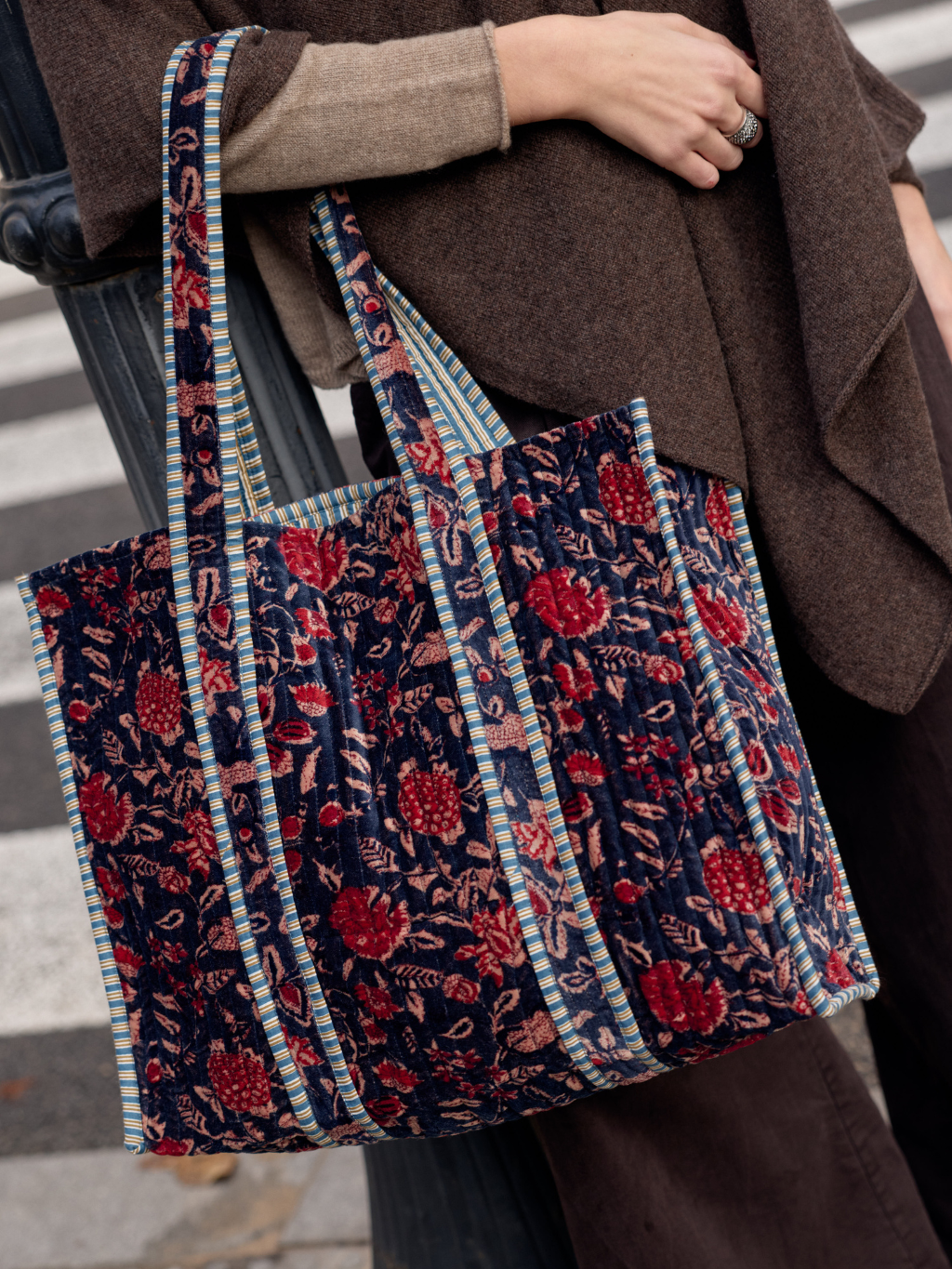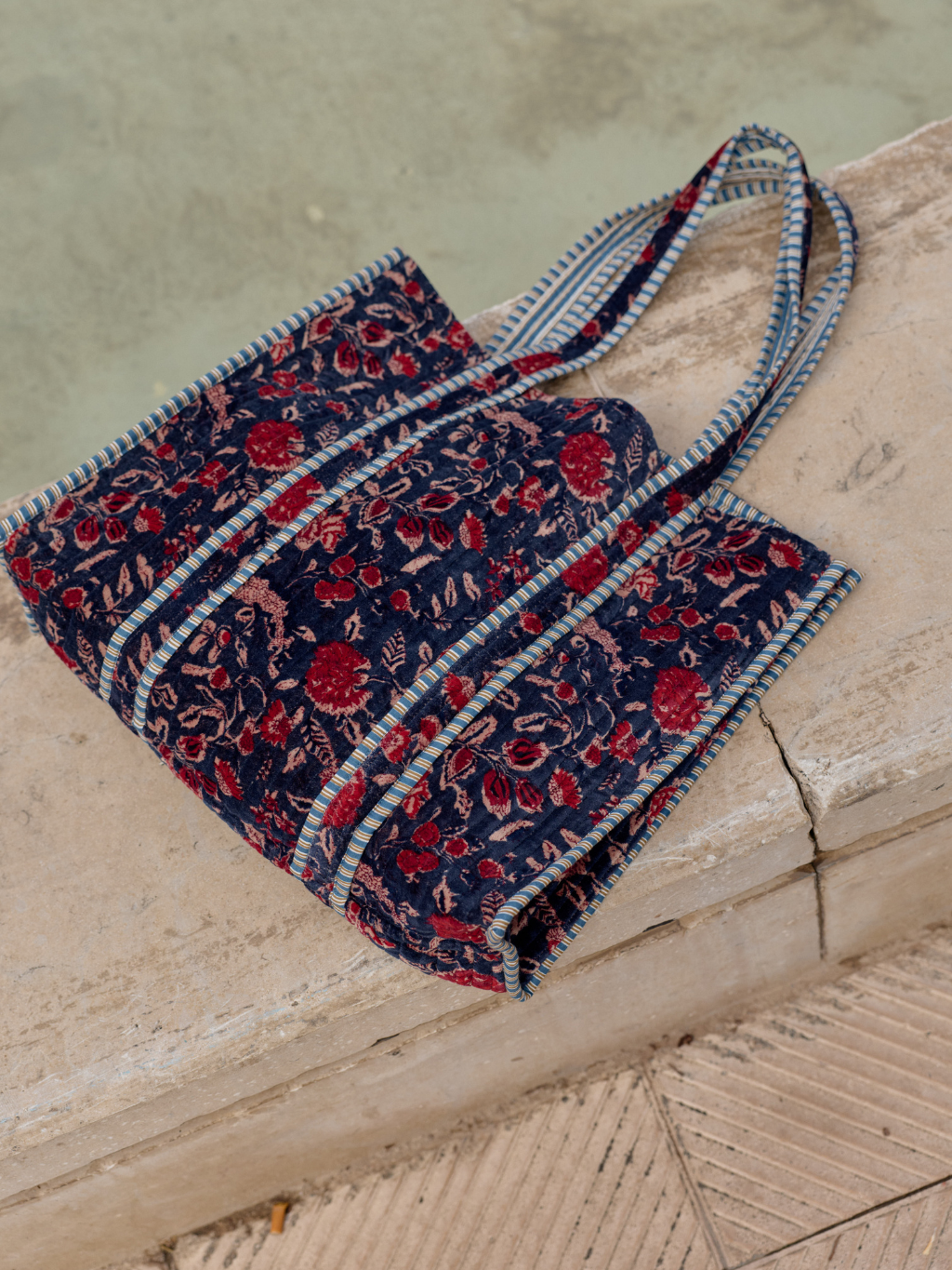 Bolso de terciopelo en color azul con estampado en burdeos y marrones. Interior forrado en estampado de rayas y bolsillo interior. Medidas: 37cm x 44cm x 13cm