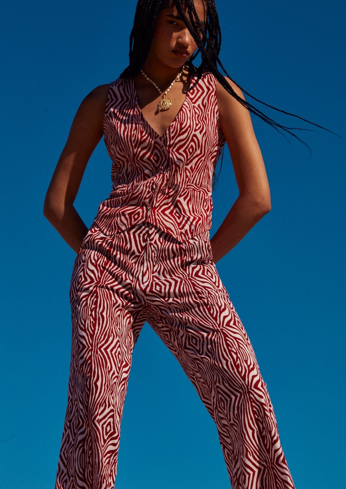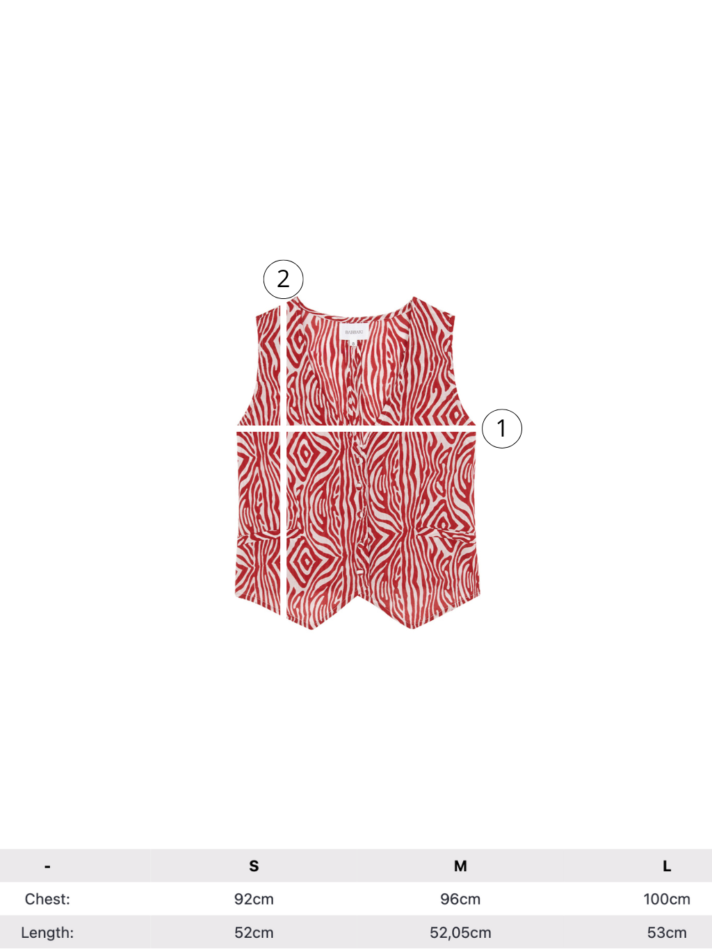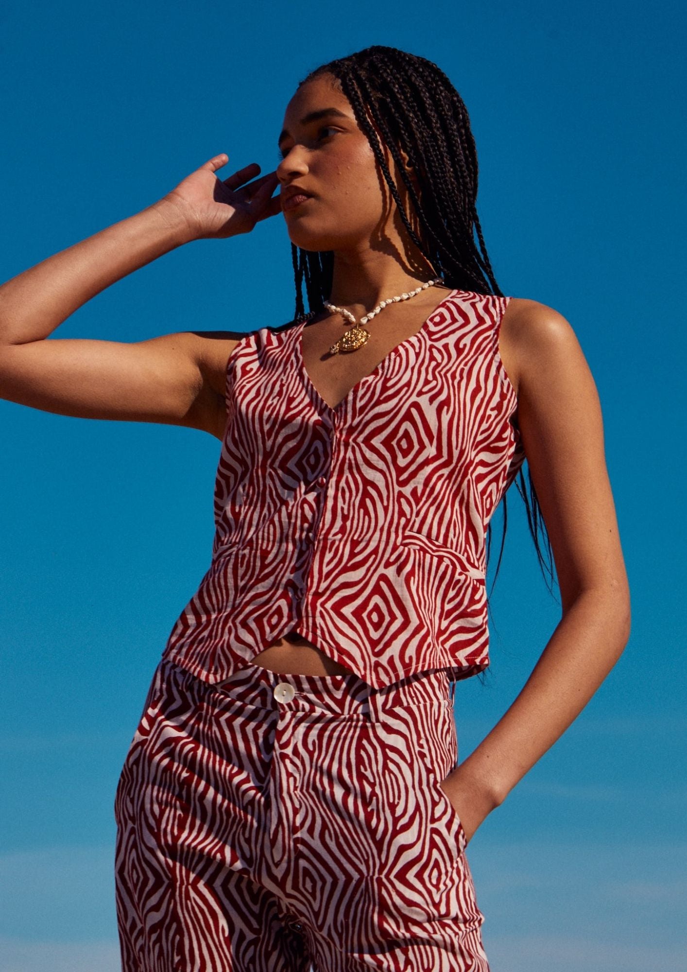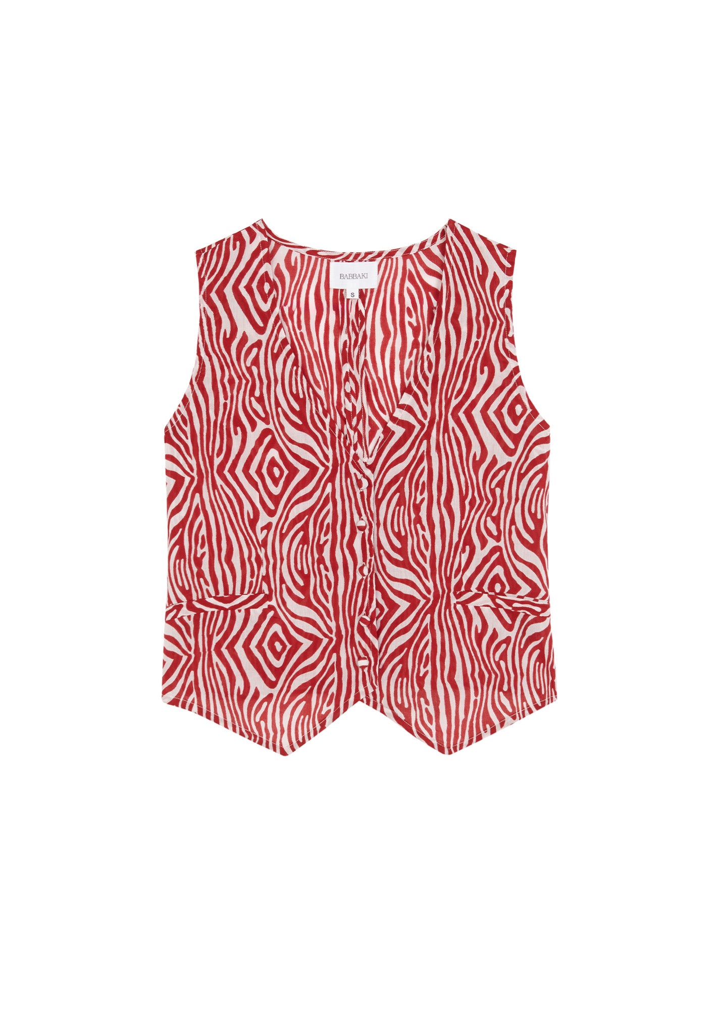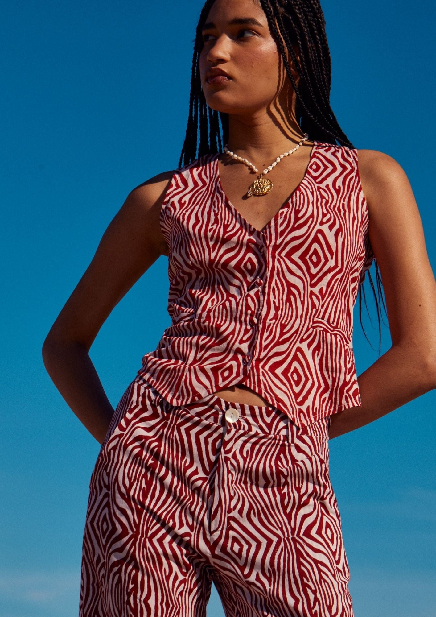 Chaleco con estampado animal print rojo. Con escote pico y botones forrados. El diseño contiene un bolsillo a cada lado.