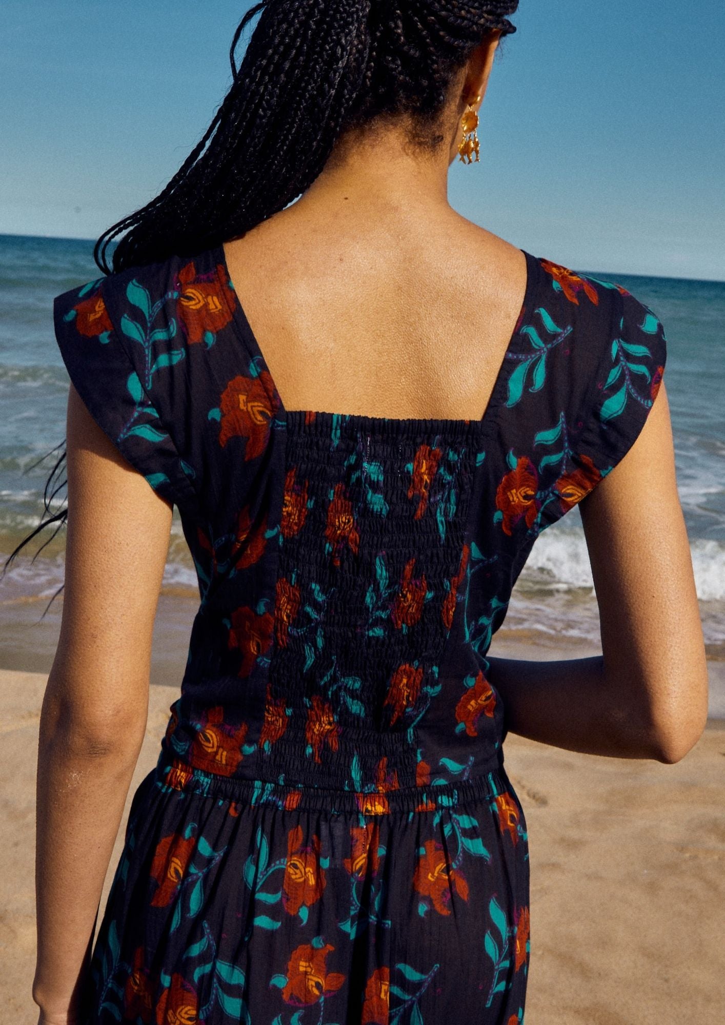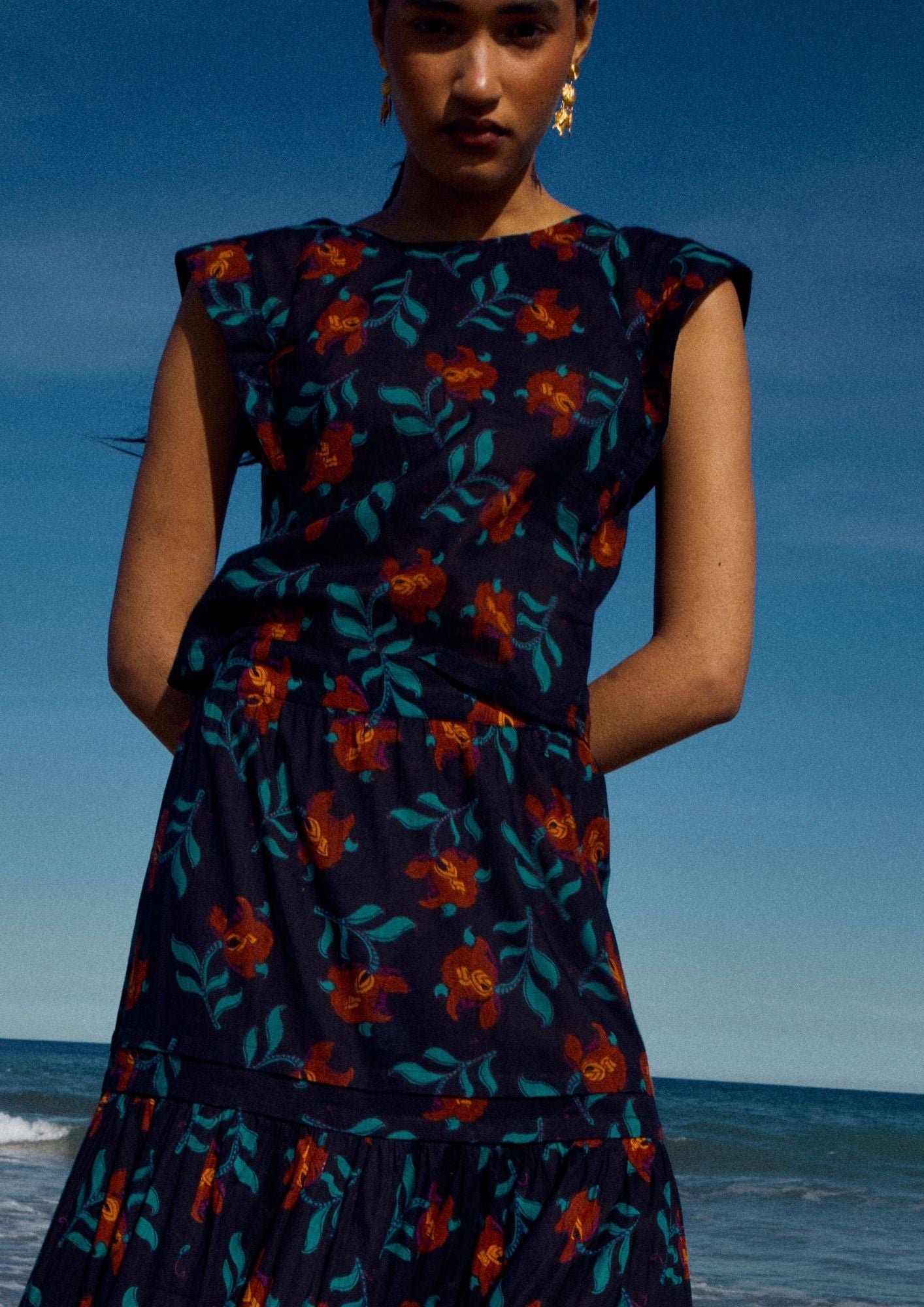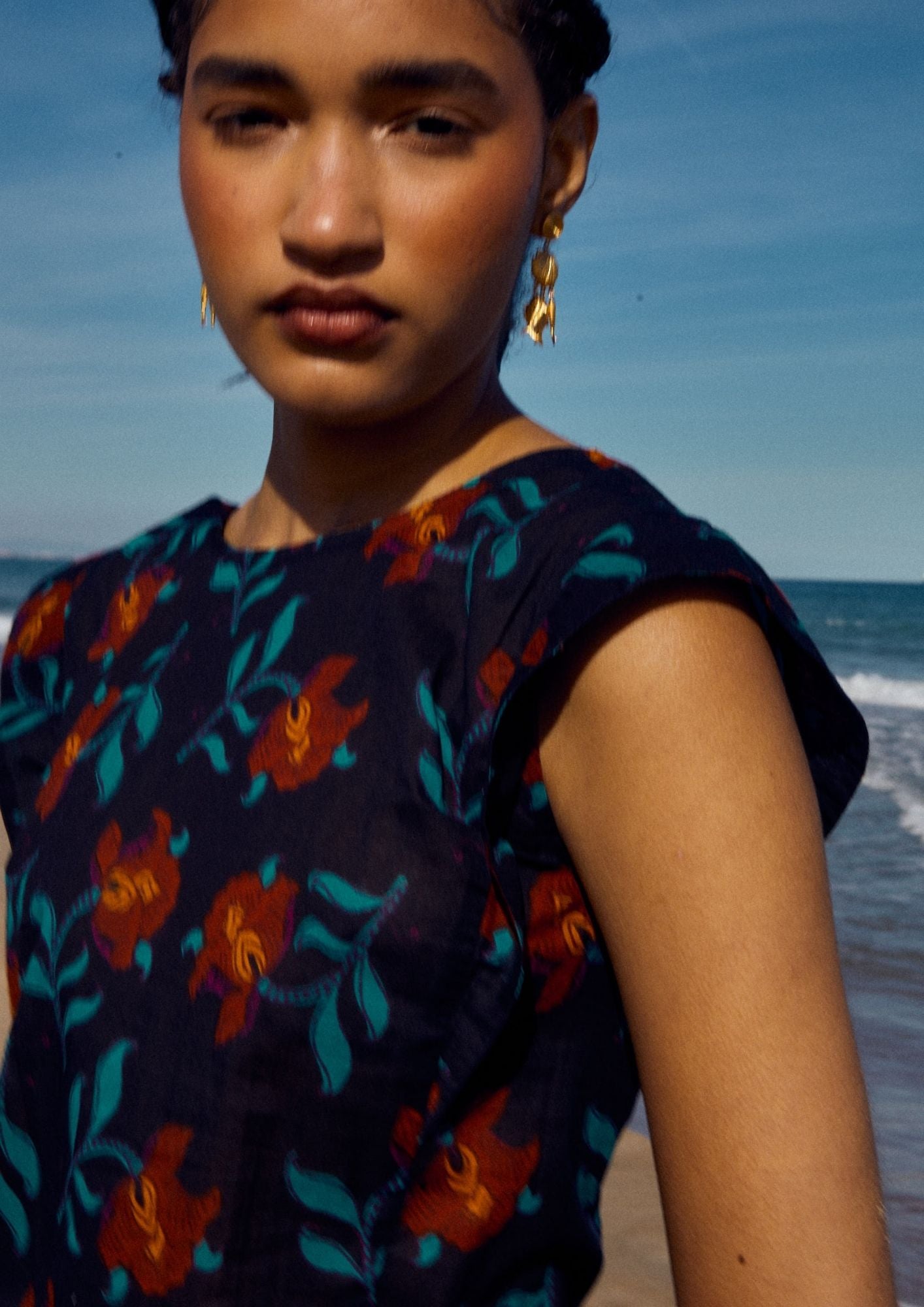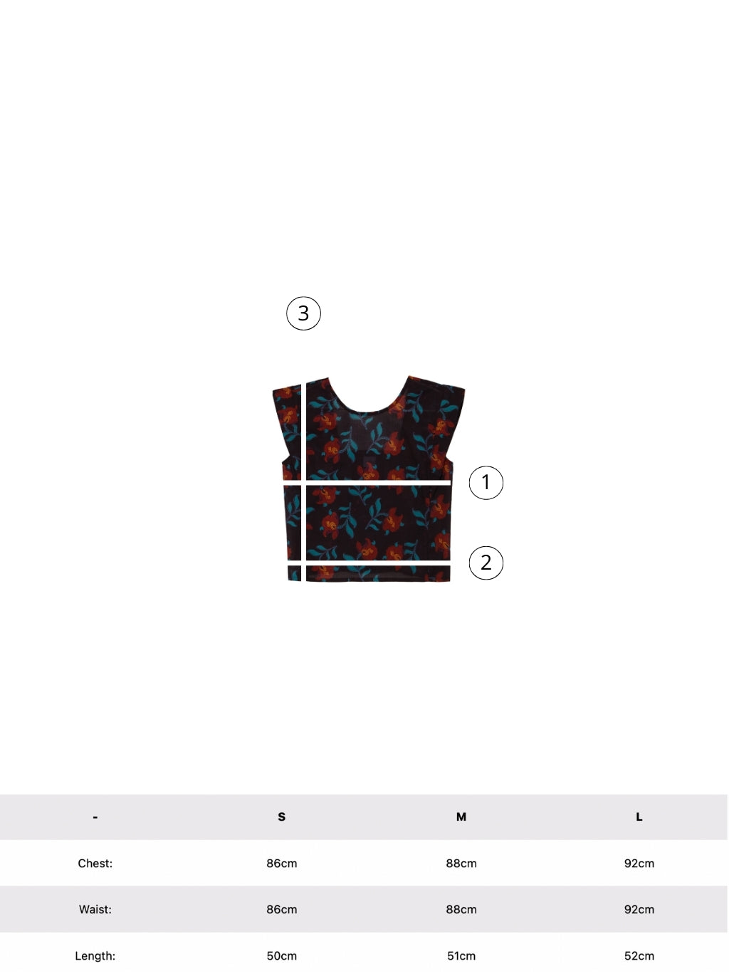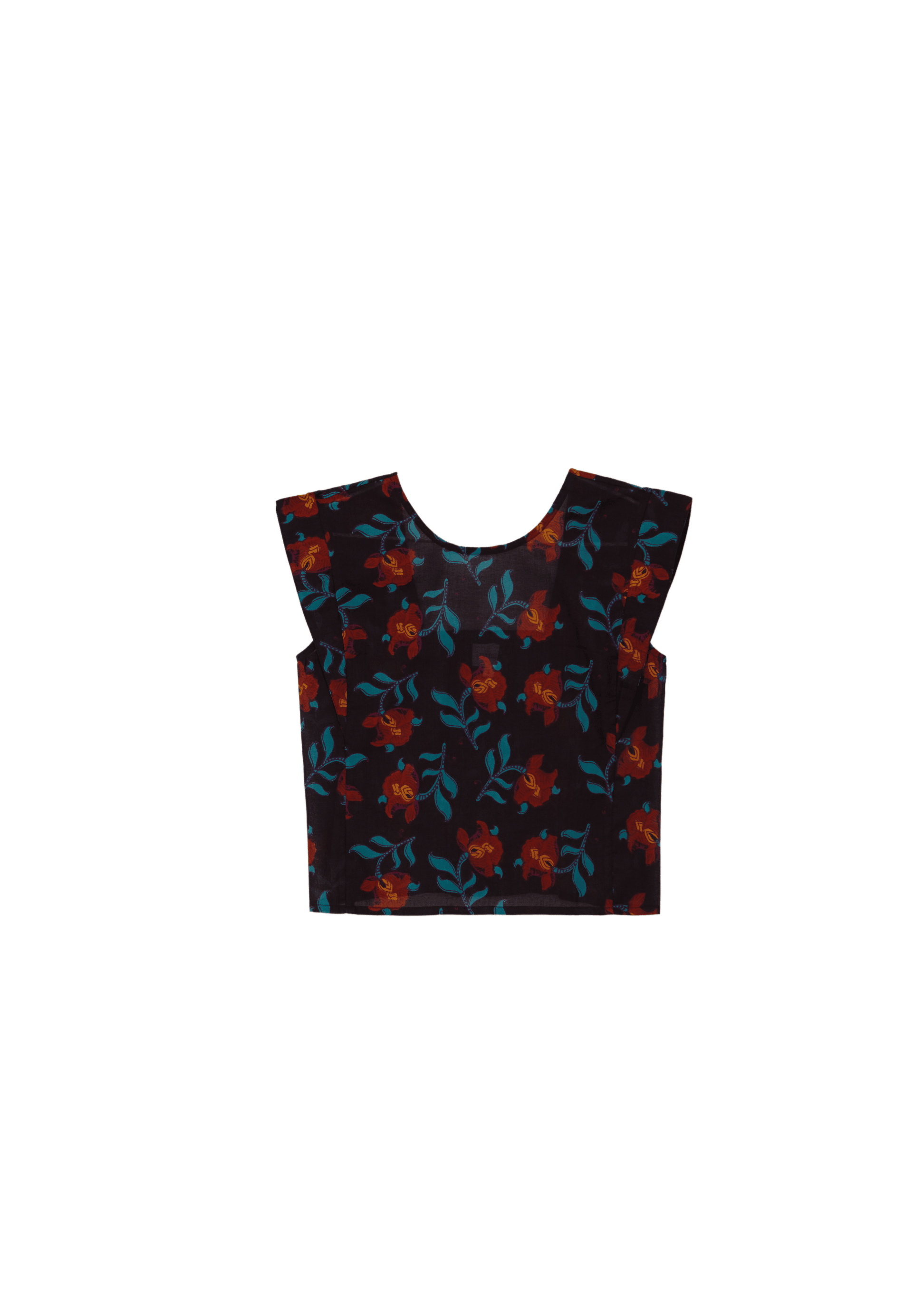 Top sin mangas con un corte recto y cuello redondeado. Diseño floral que combina colores vibrantes, predominando los tonos rojizos y anaranjados en las flores obre un fondo negro. Detalle de nido de abeja en la espalda.