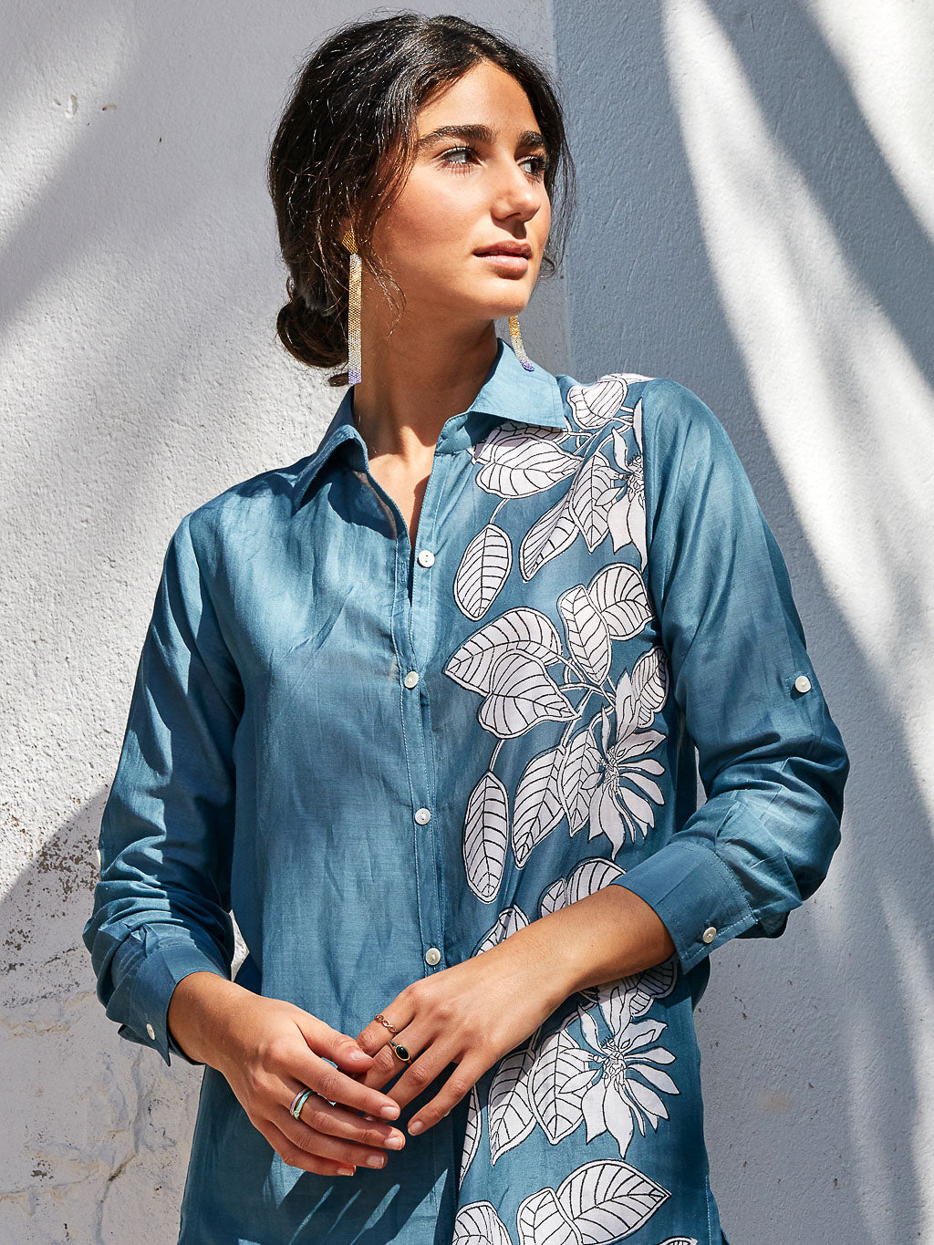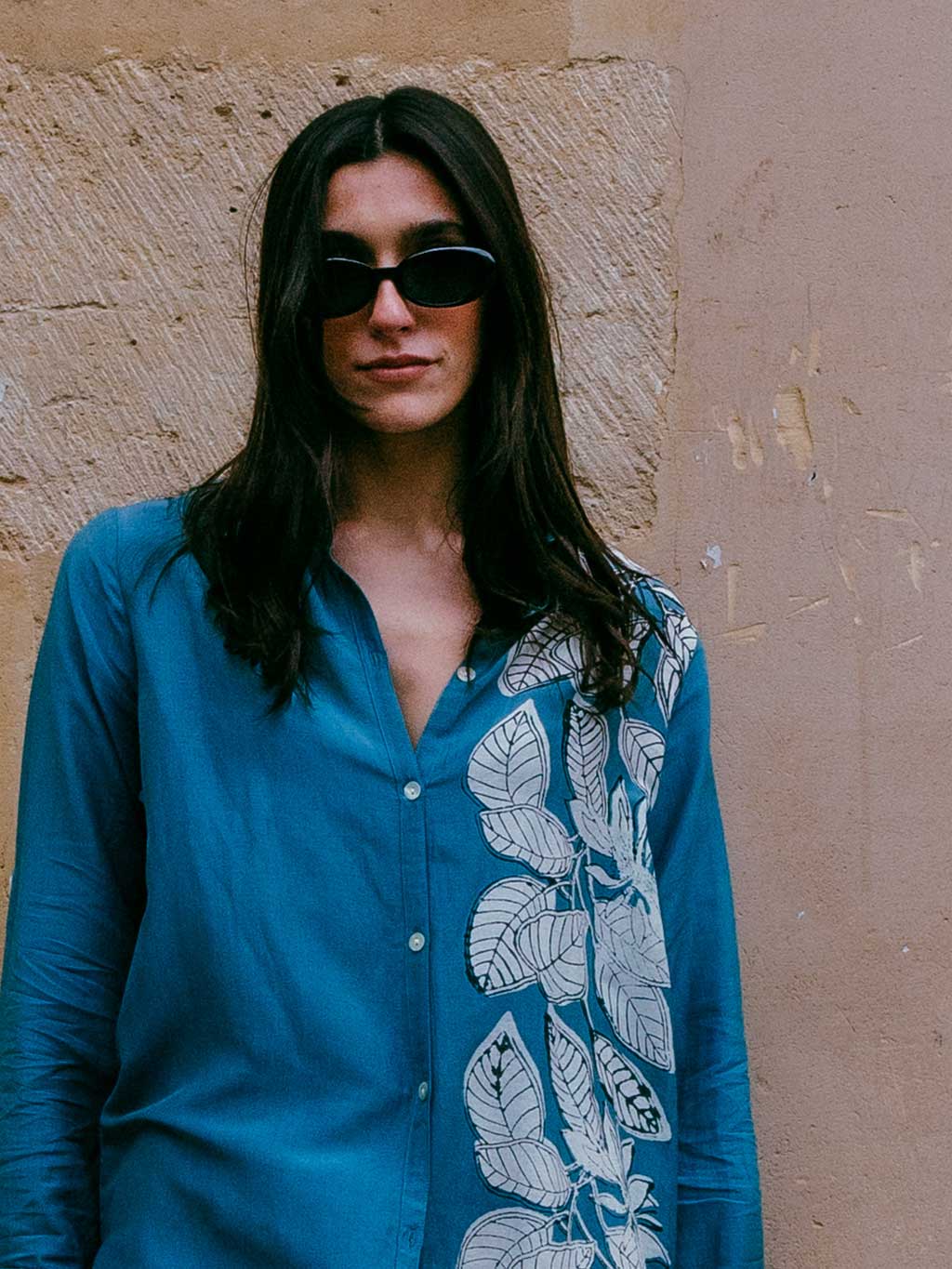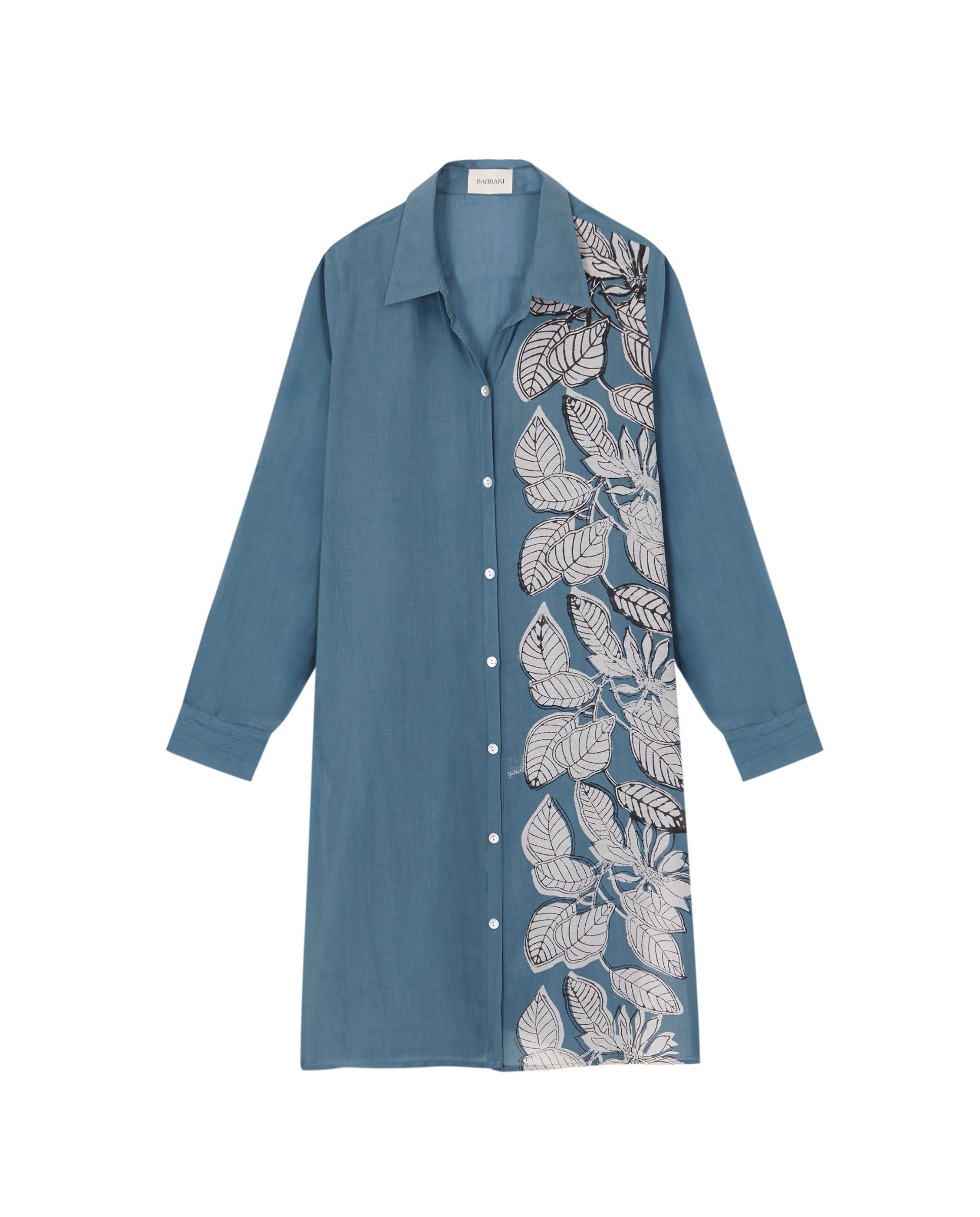 Camisa larga de seda 70% y algodón 30%. Manga larga y print posicional de motivos vegetales.