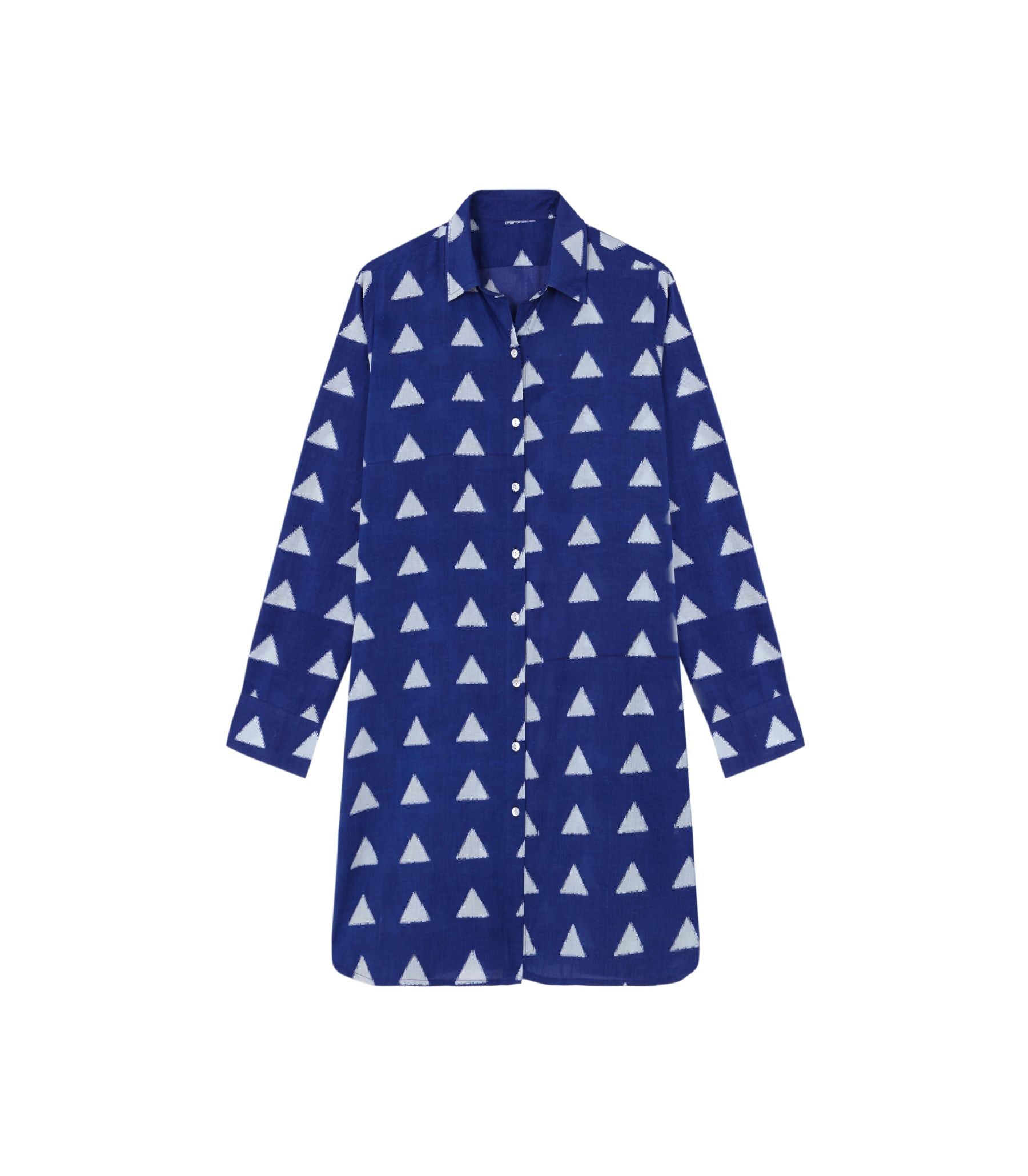 Vestido camisero de algodón con print de rayas en tonos amarillos y azules. Cuello camisa, cierre con botones delantero y mangas largas ajustables con trabilla.