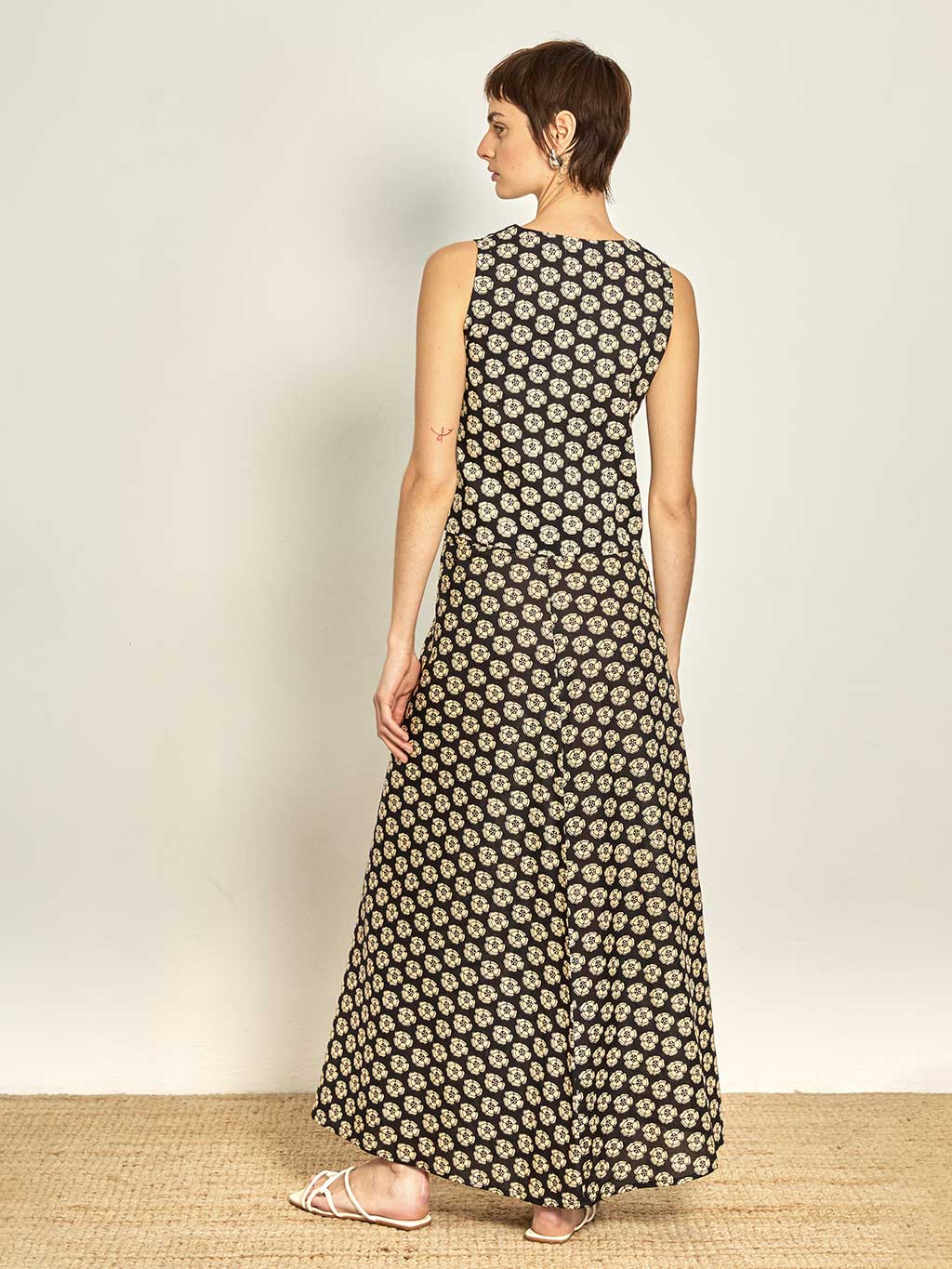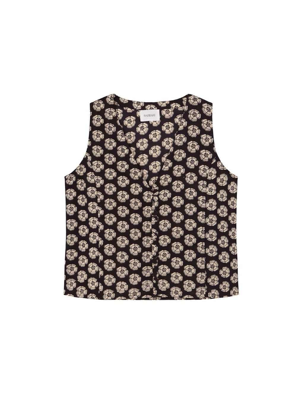 Chaleco de print floral en blanco sobre base negra. Con escote pico y botones forrados.