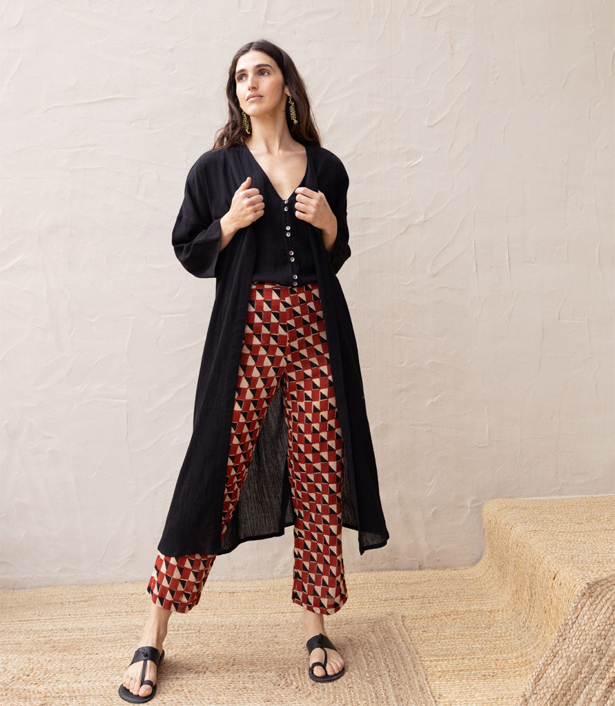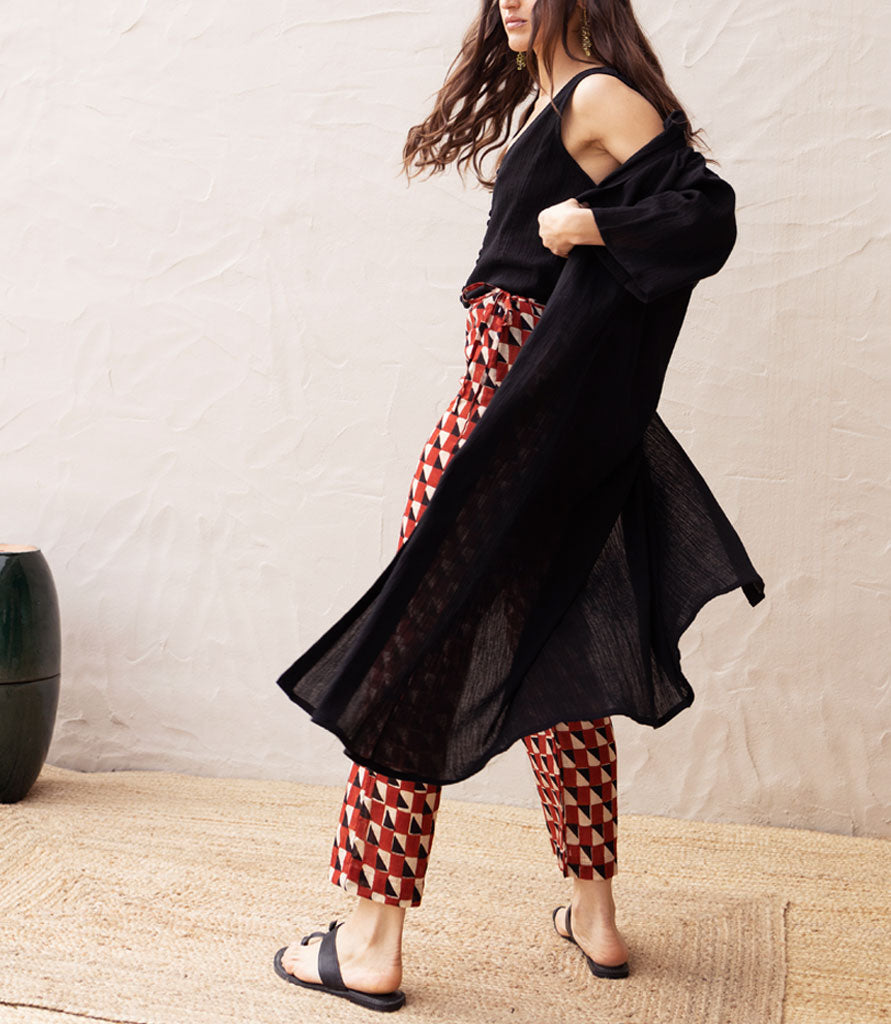 Kimono negro en tejido arrugado de algodón. Tejido suave y ligero. Cierre de pompones.