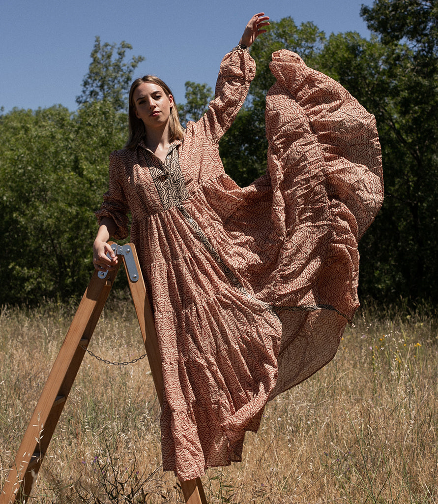 Maxi vestido étnico estampado a mano con colores naturales. Manga larga con botón, cuello camisero y suaves fruncidos.