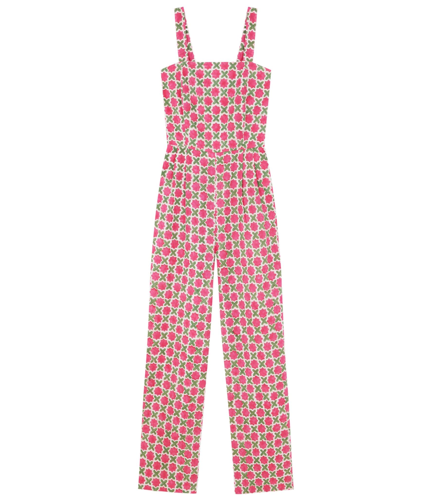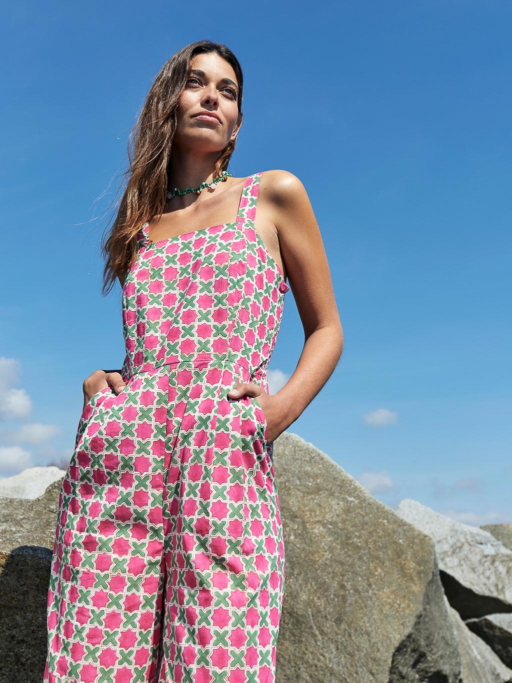 Mono largo estampado con tirante ancho. Bolsillos laterales y espalda con nido de abeja.