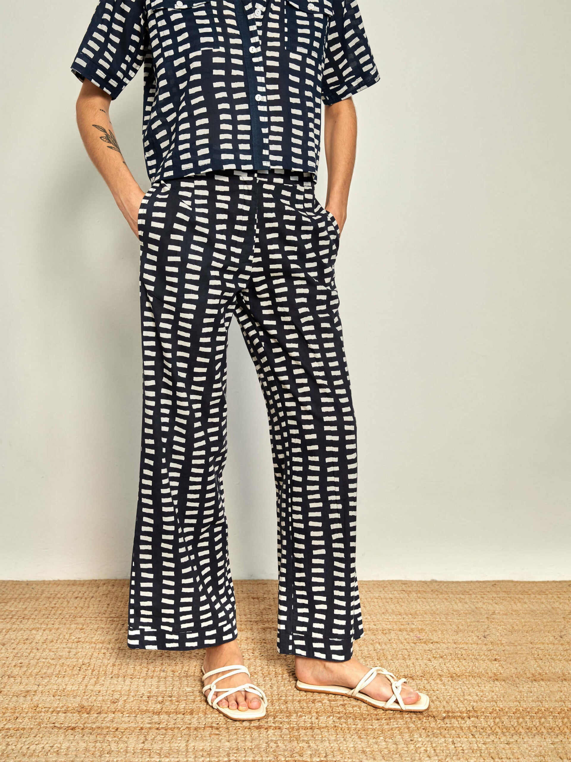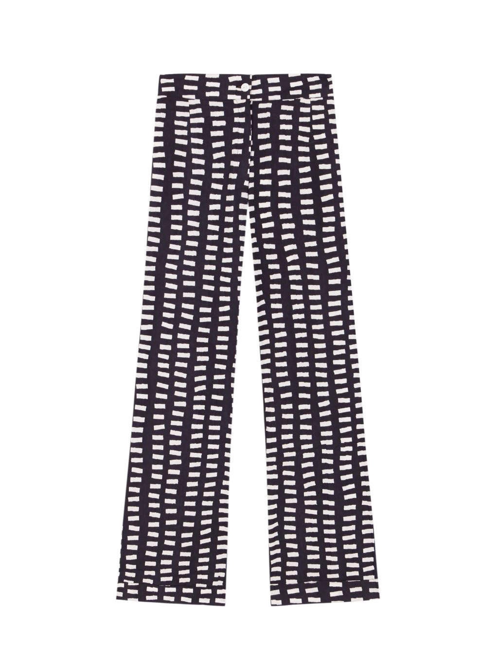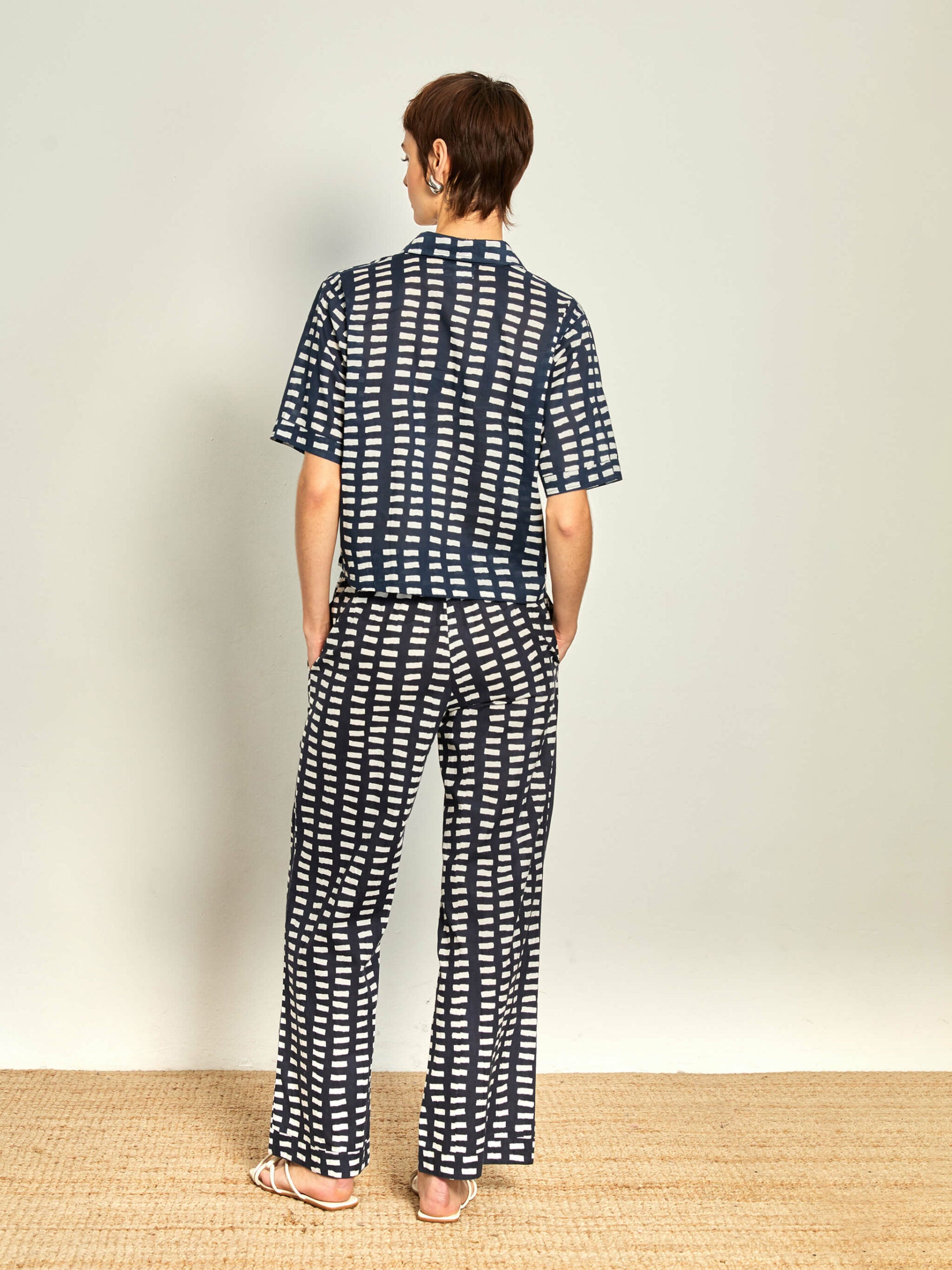 Pantalón fluido de algodón con estampado geométrico en fondo azul noche. Cinturilla con goma trasera, cierre frontal de botón y cremallera. Tiene bolsillos.