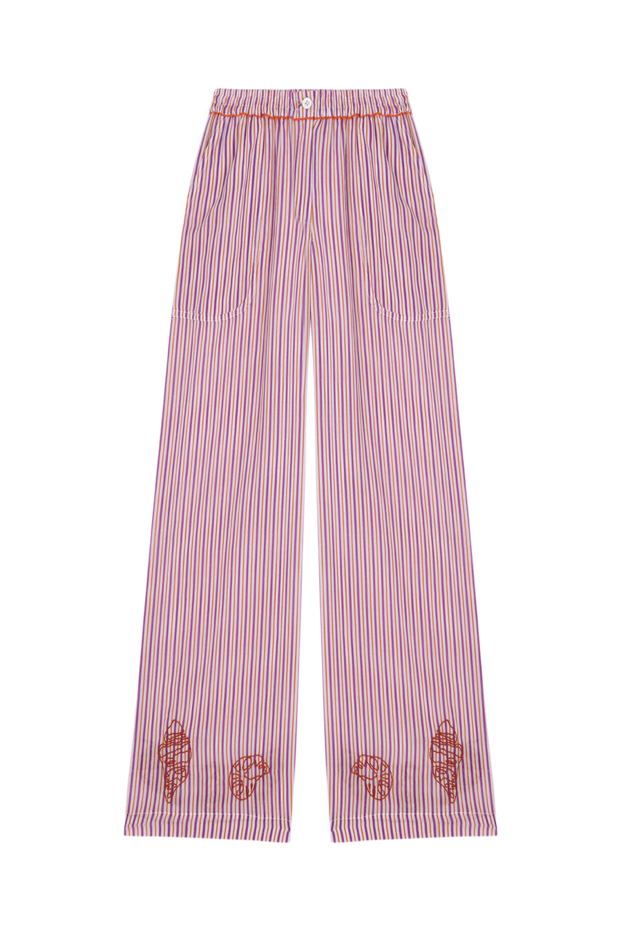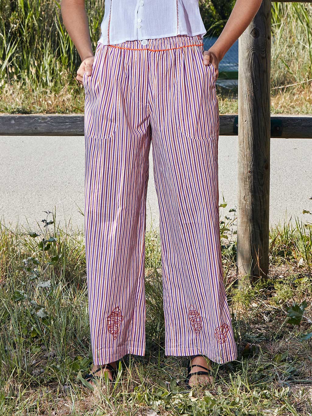 Pantalón fluido en estampado de rayas. Cierre delantero con botón y cremallera. Cintura trasera con goma para mejor adaptación. Tejido 100% algodón. Detalles marinos bordados con hilo naranja en bajos.