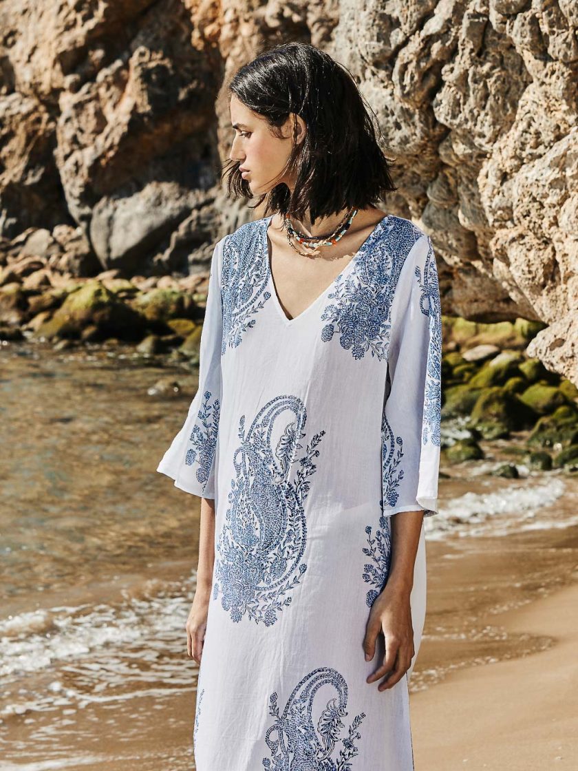 Túnica larga con estampado paisley, escote V, bolsillos y corte en los laterales.