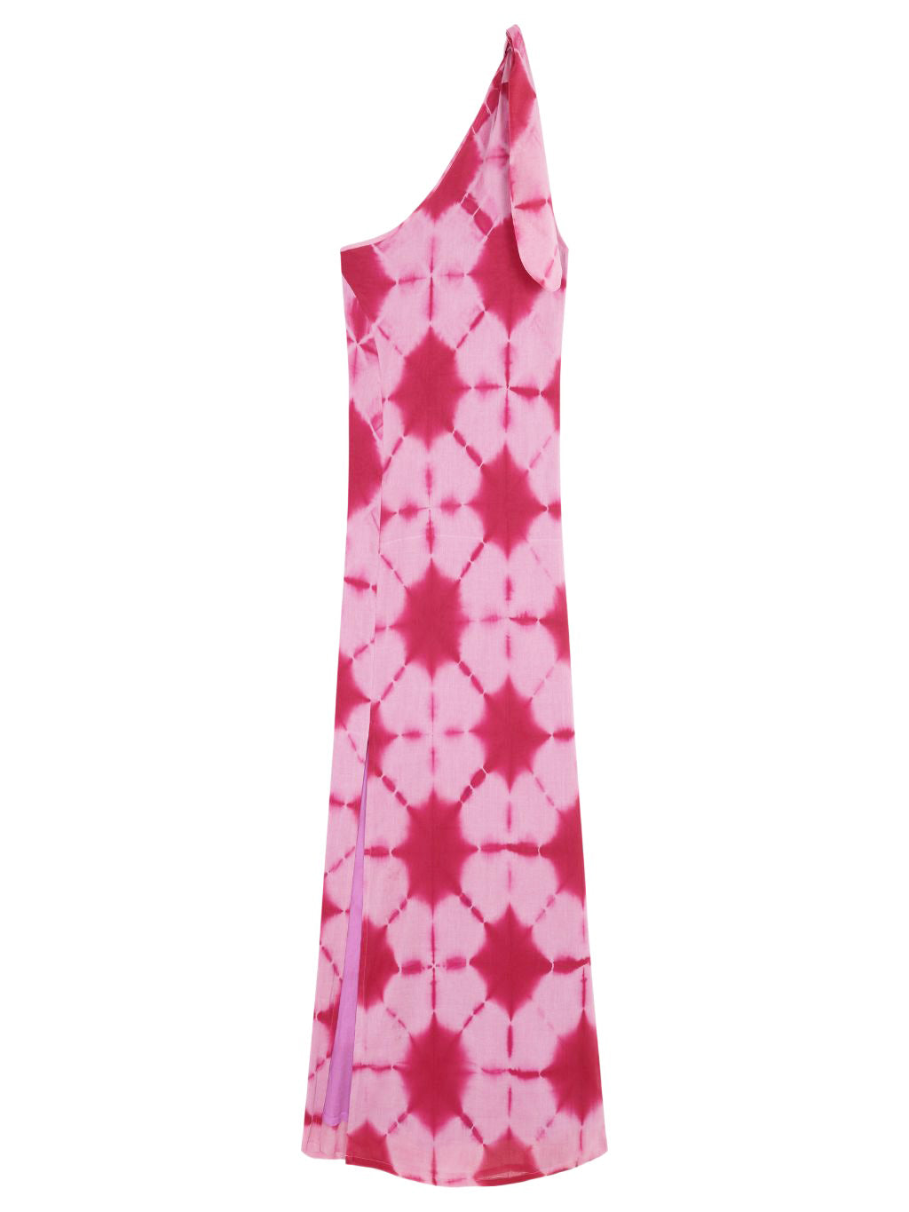 Vestido largo de un tirante con nudo en hombro para una mejor regulación. Bajo con corte lateral. Forro interior del mismo largo que el vestido.