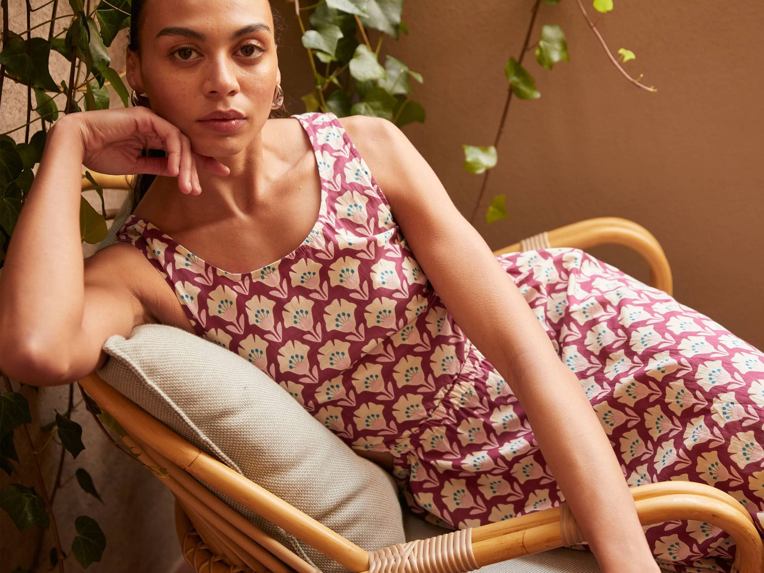 Estampado a mano con tintes naturales, utilizando la técnica artesana del blockprint, lo cual convierte a cada prenda en única.