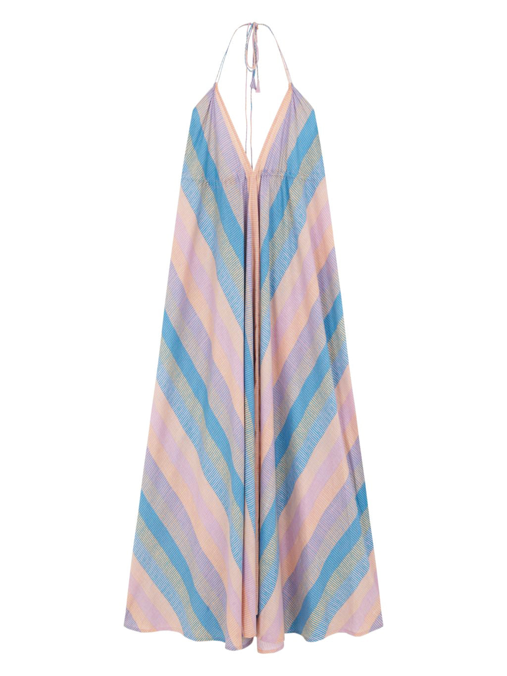 Vestido largo de cuello halter y escote pico. Finos tirantes regulables cruzados en la espalda. Estampado de rayas multicolor.