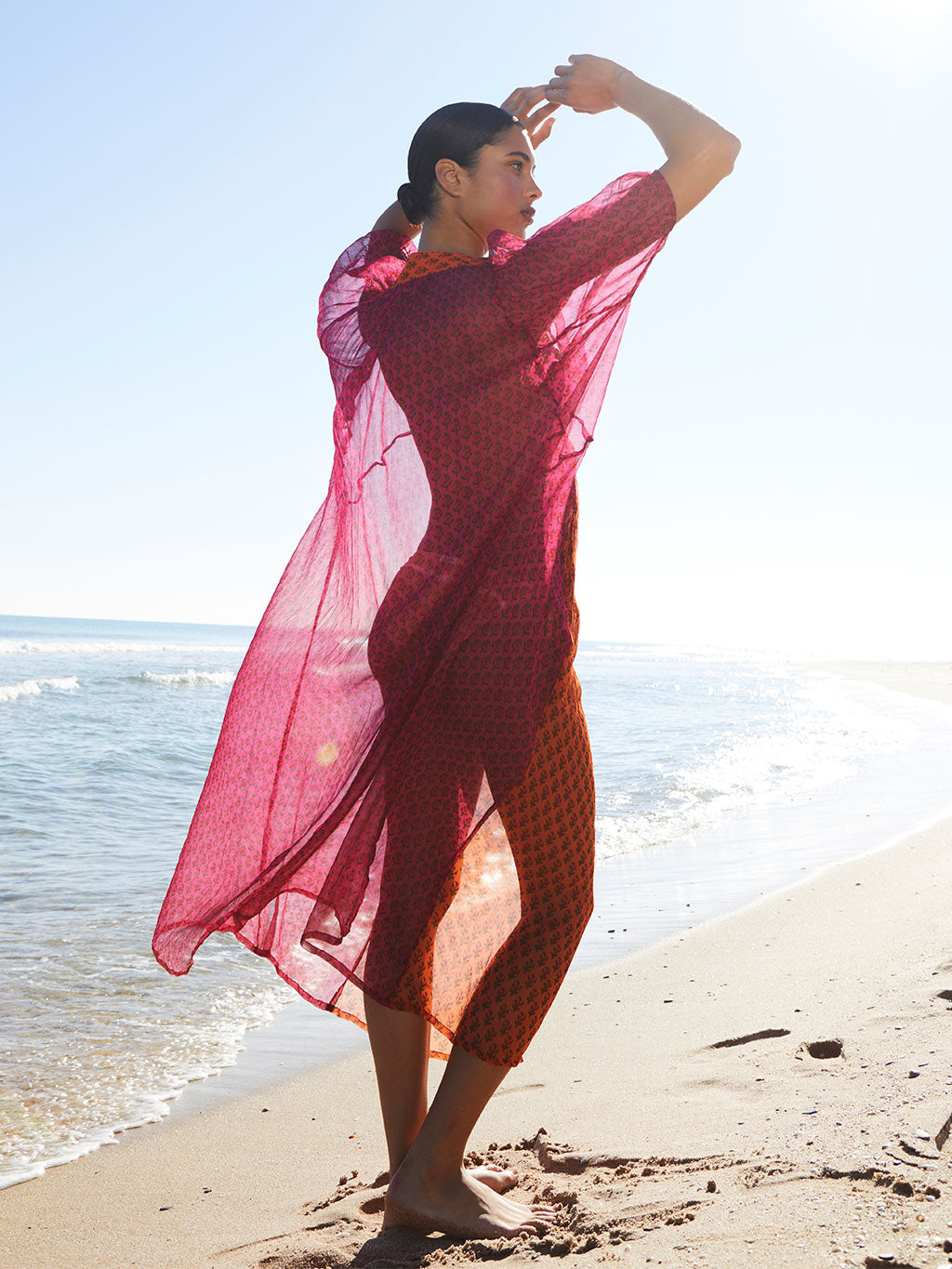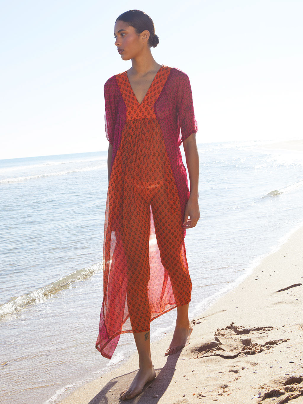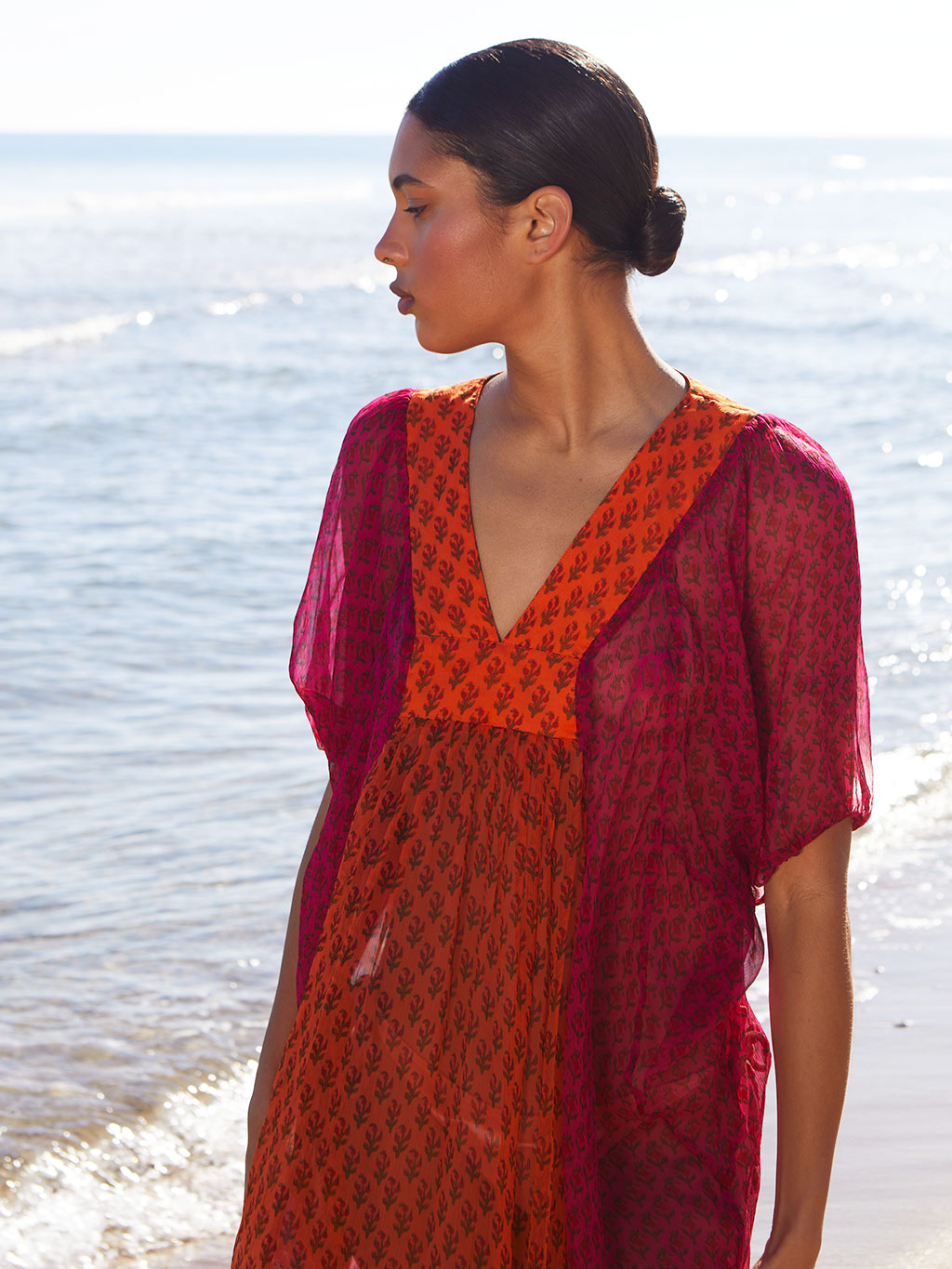 Maxi vestido super ligero, confeccionado con chiffon, un tejido que juega con las transparencias. Con manga globo y escote en V.