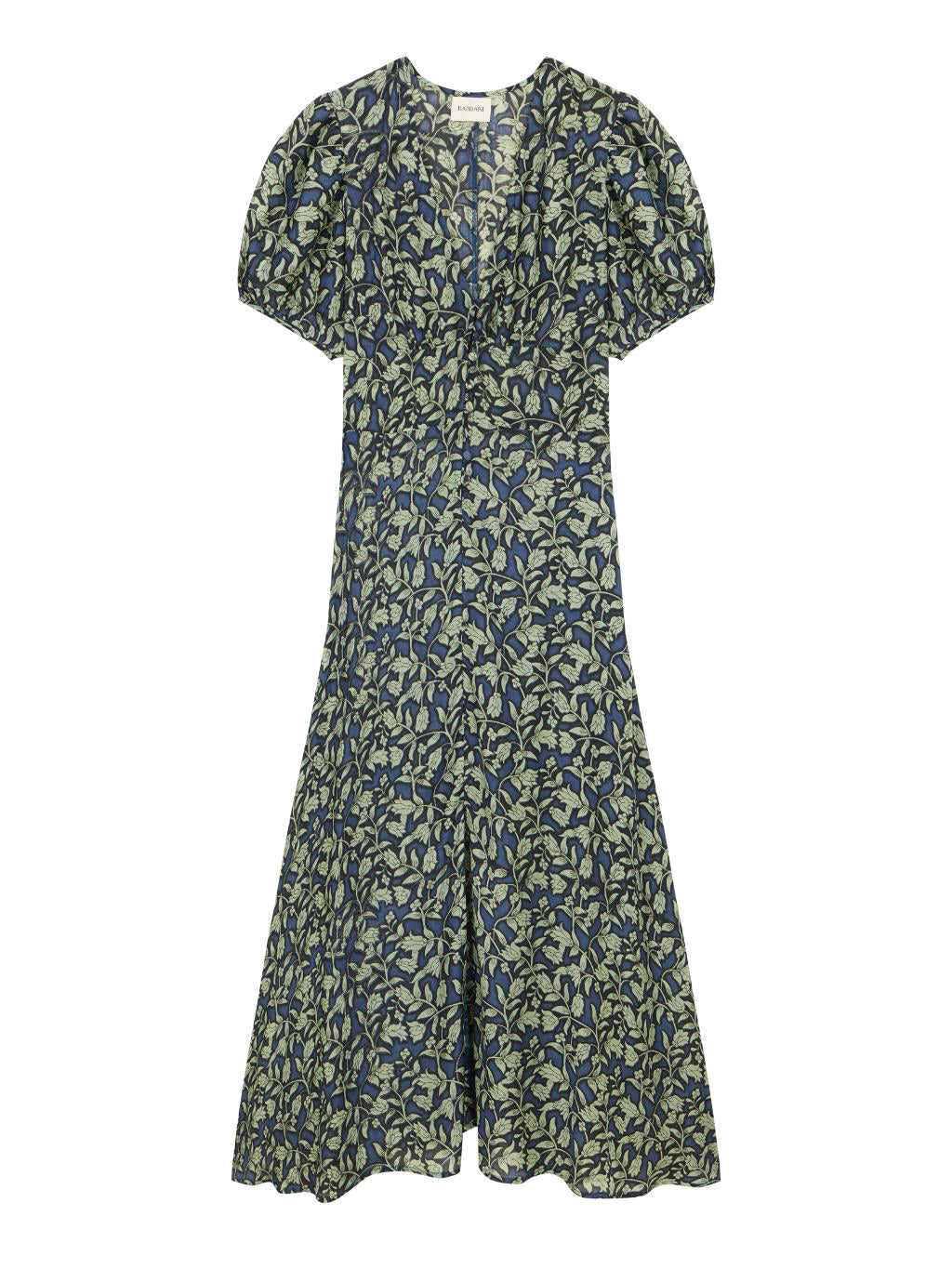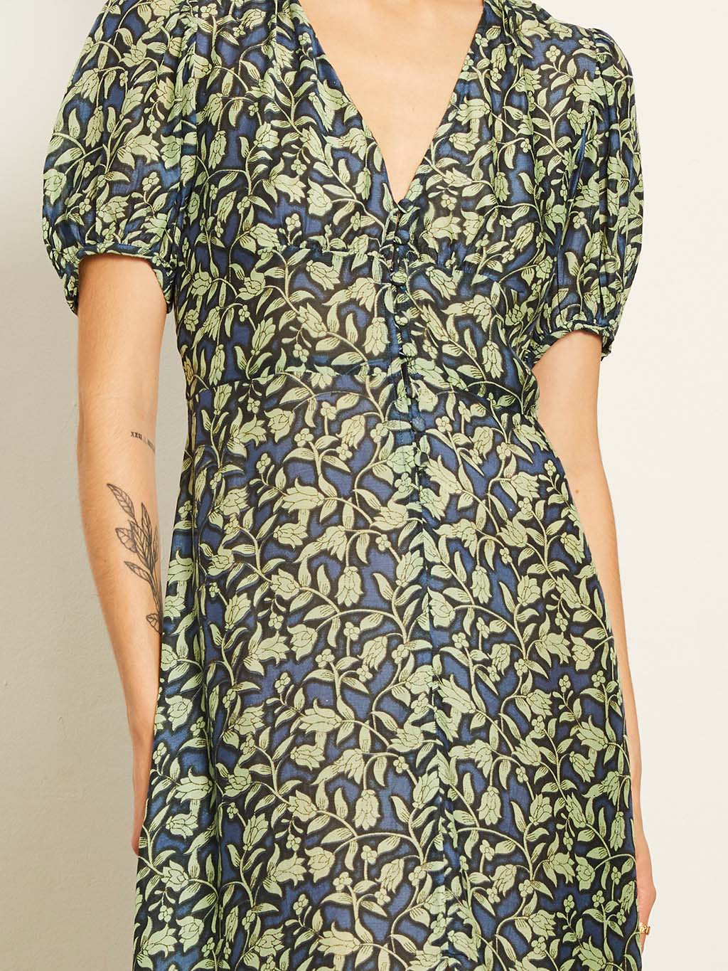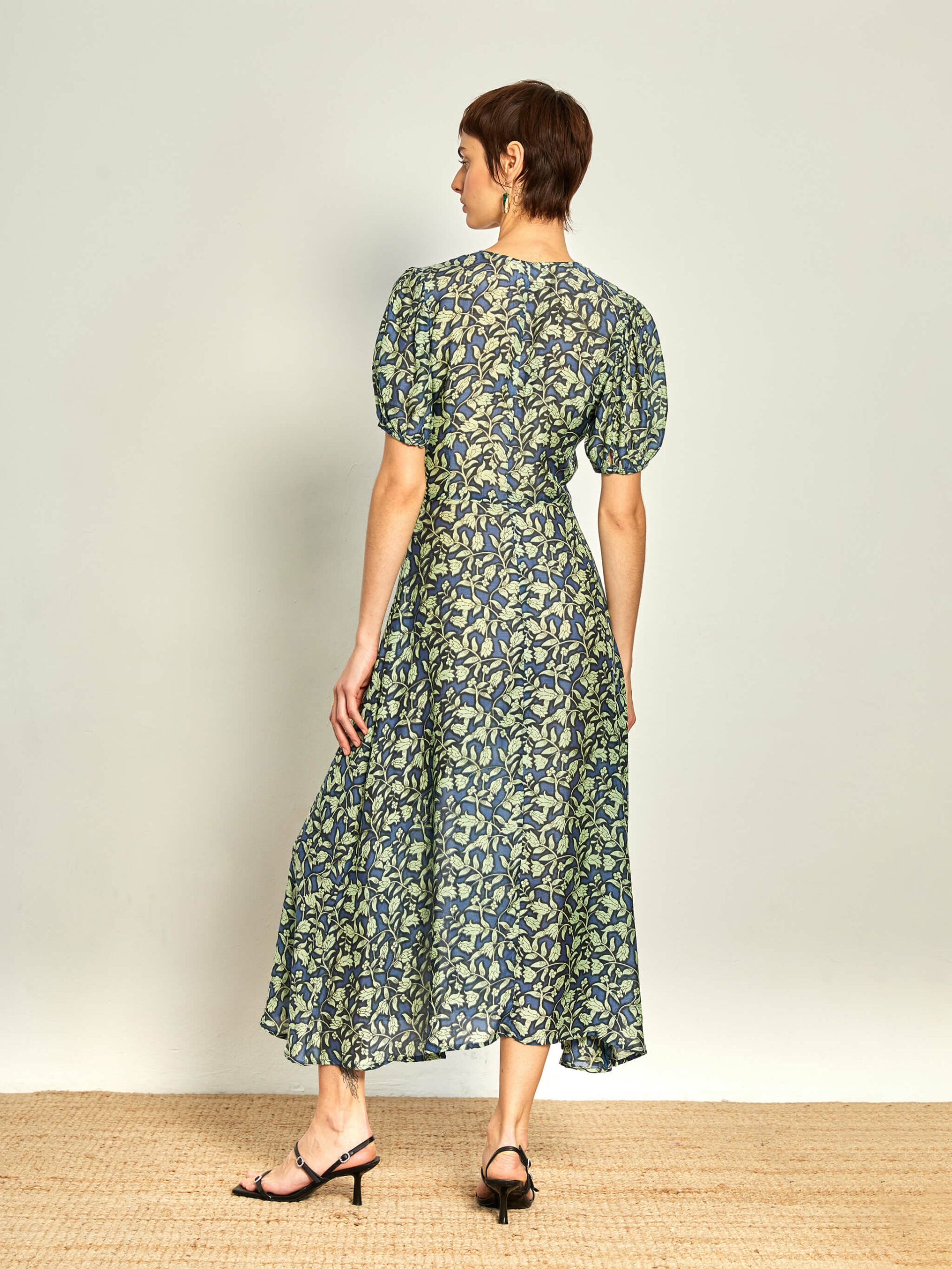 Vestido midi de manga corta abullonada en estampado floral de tonos verdes y azules, escote v, acabado con botones forrados y apertura frontal.