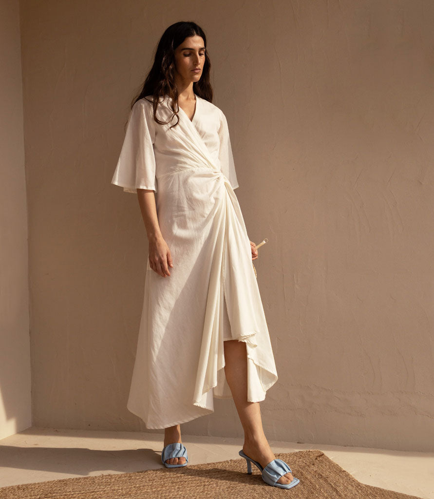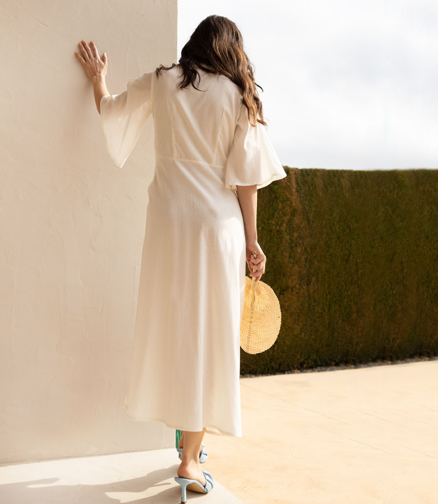 Vestido blanco largo evasé con nudo delantero y escote pico cruzado con manga mariposa y forro. Cierre con cremallera lateral. 100% algodón