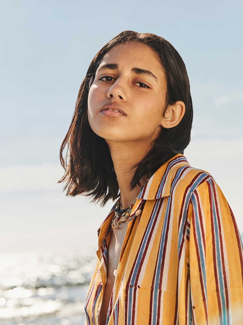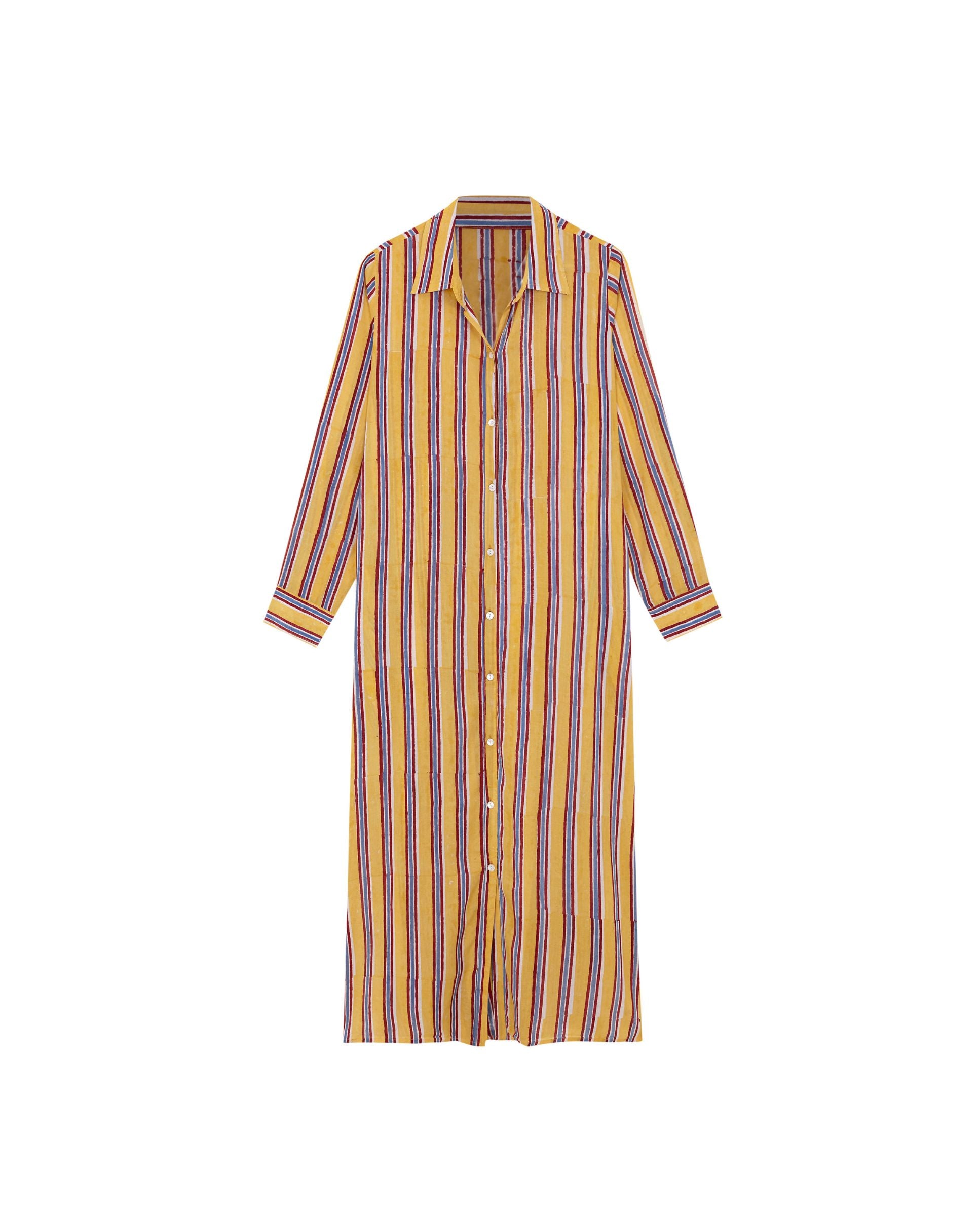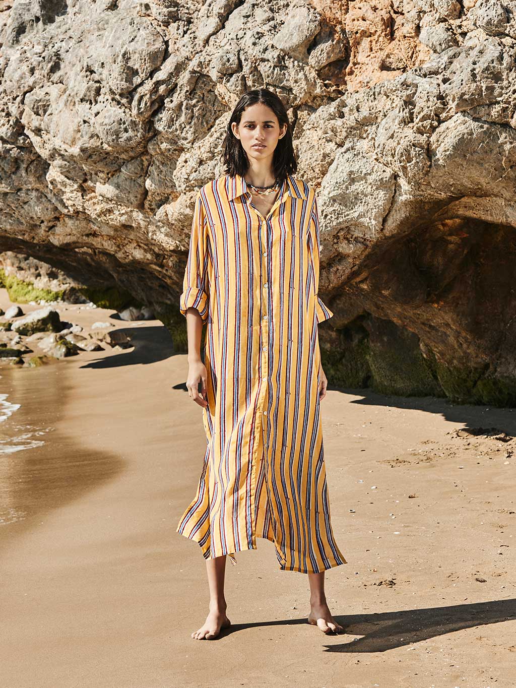 Vestido camisero con estampado de rayas con amarillo como tono predominante. Cierre frontal con botones, bajo con aberturas laterales y bolsillos invisibles. Incluye trabilla para las mangas.
