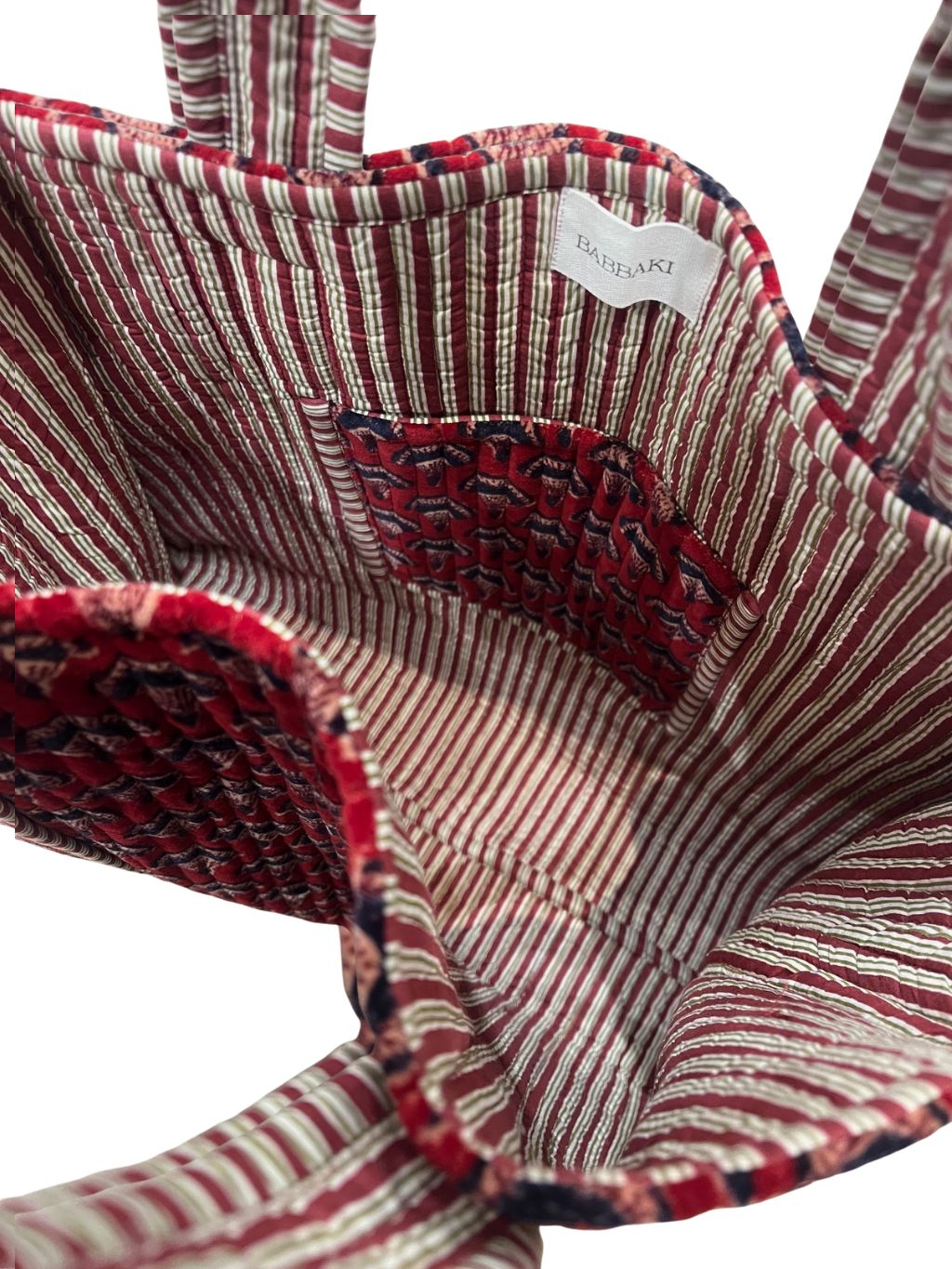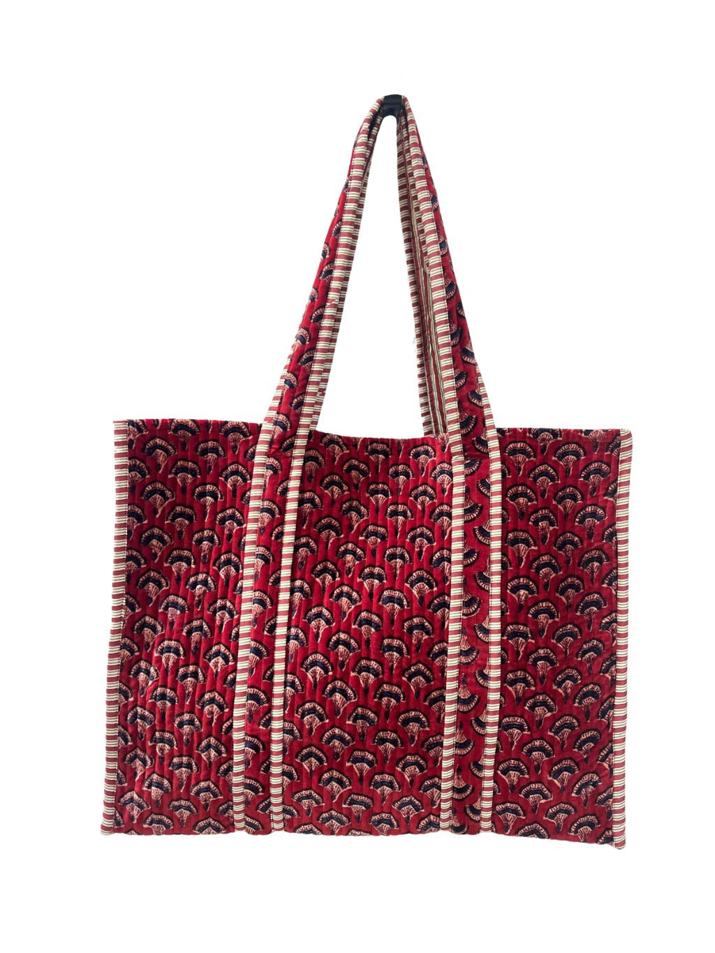 Bolso de terciopelo en color burdeos con estampado en negro y marrón. Interior forrado en estampado de rayas y bolsillo interior. Medidas: 37cm x 44cm x 13cm