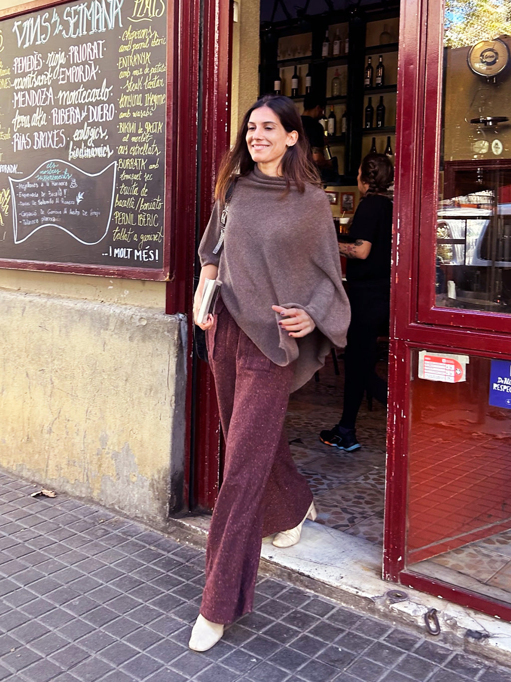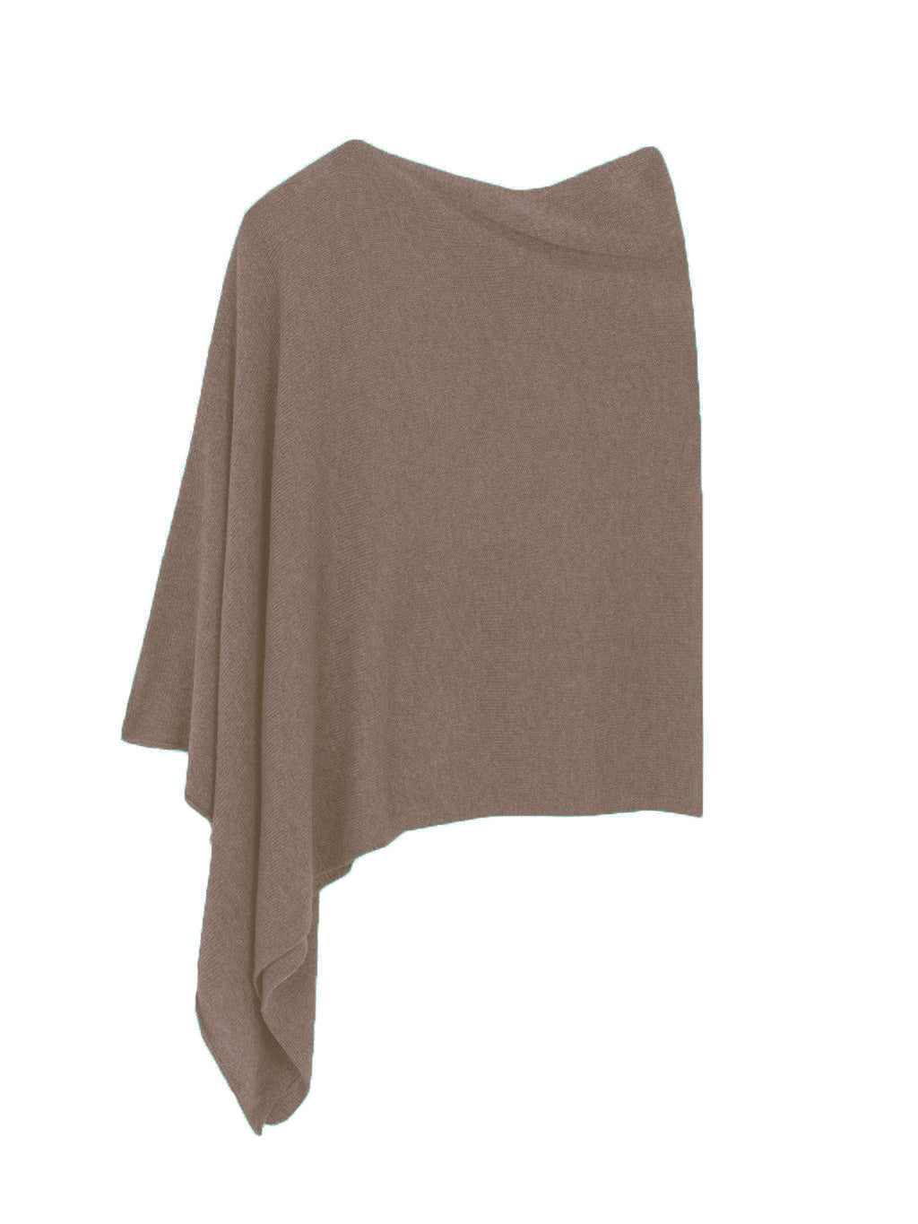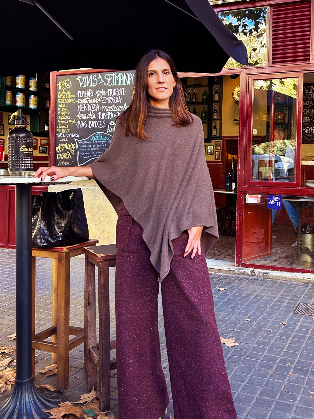 Poncho de puro Cashmere obtenido de las cabras Hircus del desierto del Gobi en Mongolia y tejido y teñido en Italia. Tacto cálido y suave. Color marrón leña.