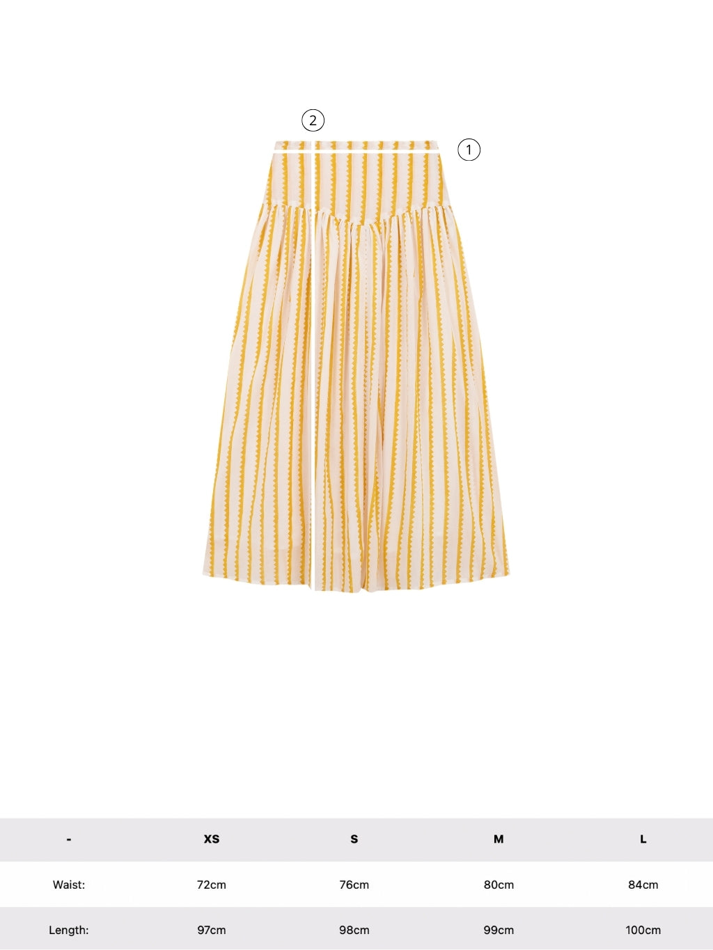 Falda midi de talle alto con estampado de rayas y forro ligero de algodón. Cierre con cremallera lateral.