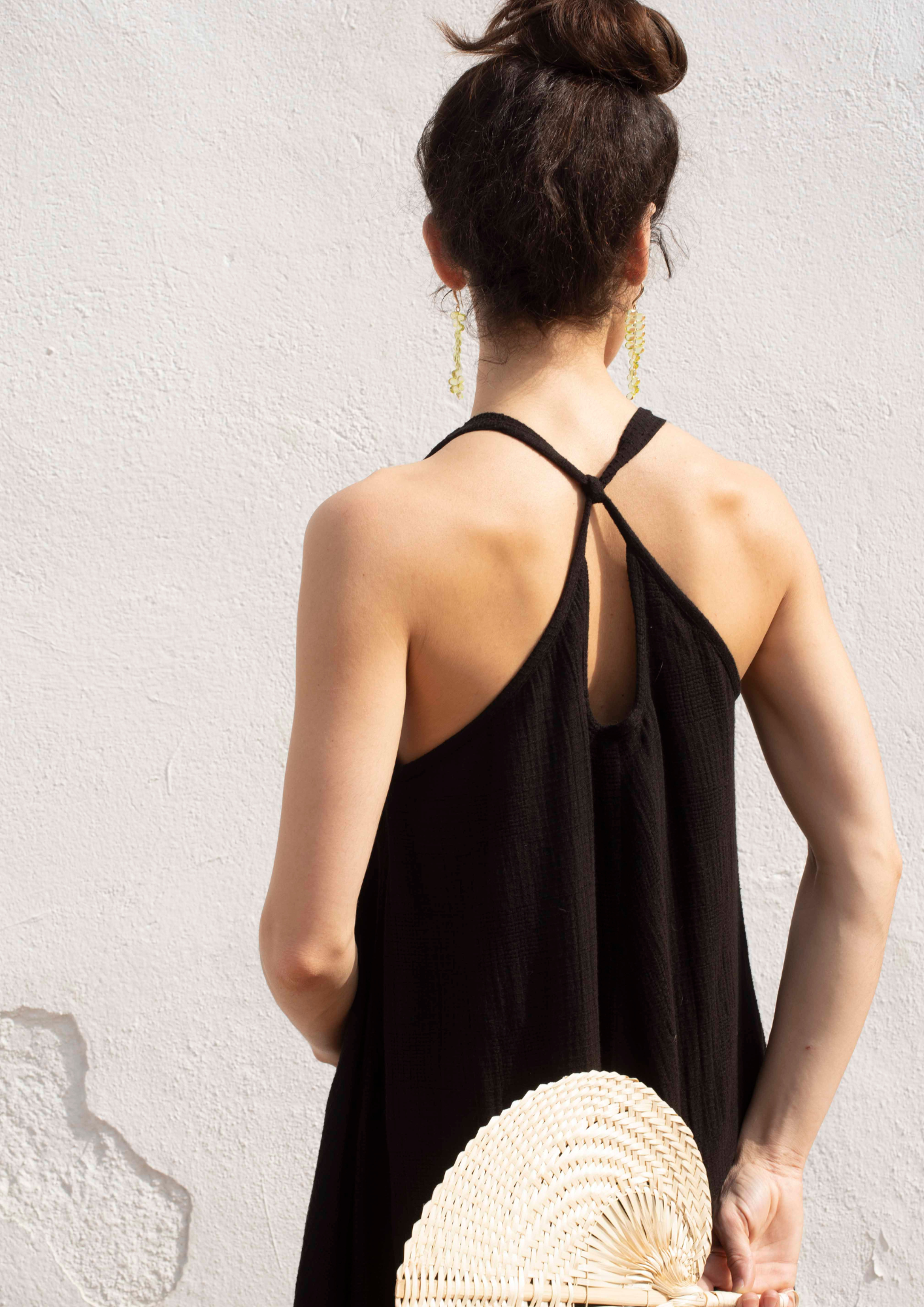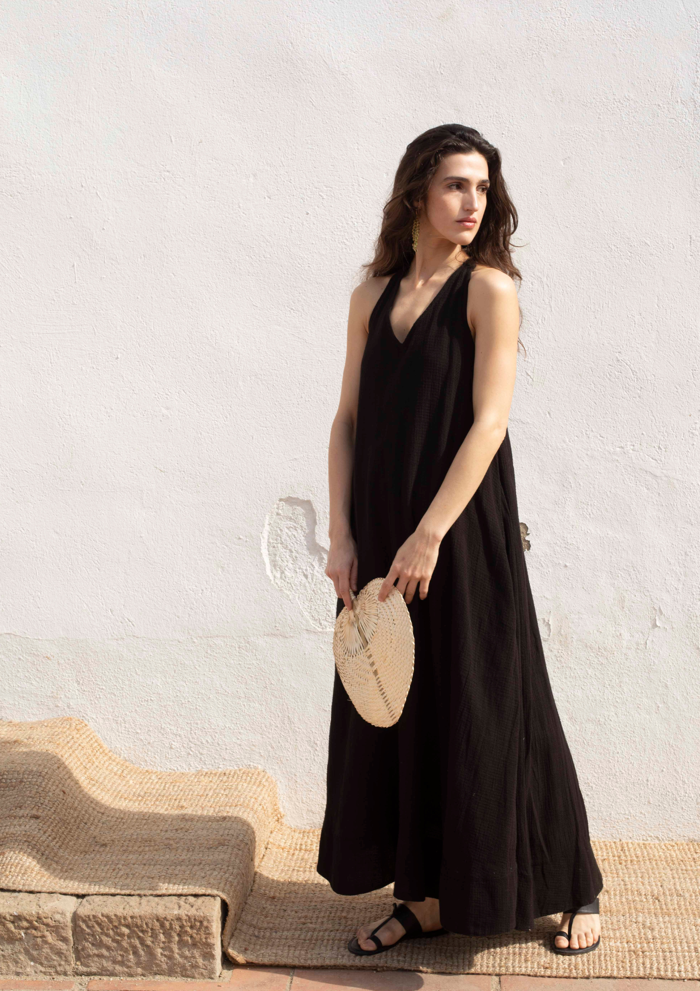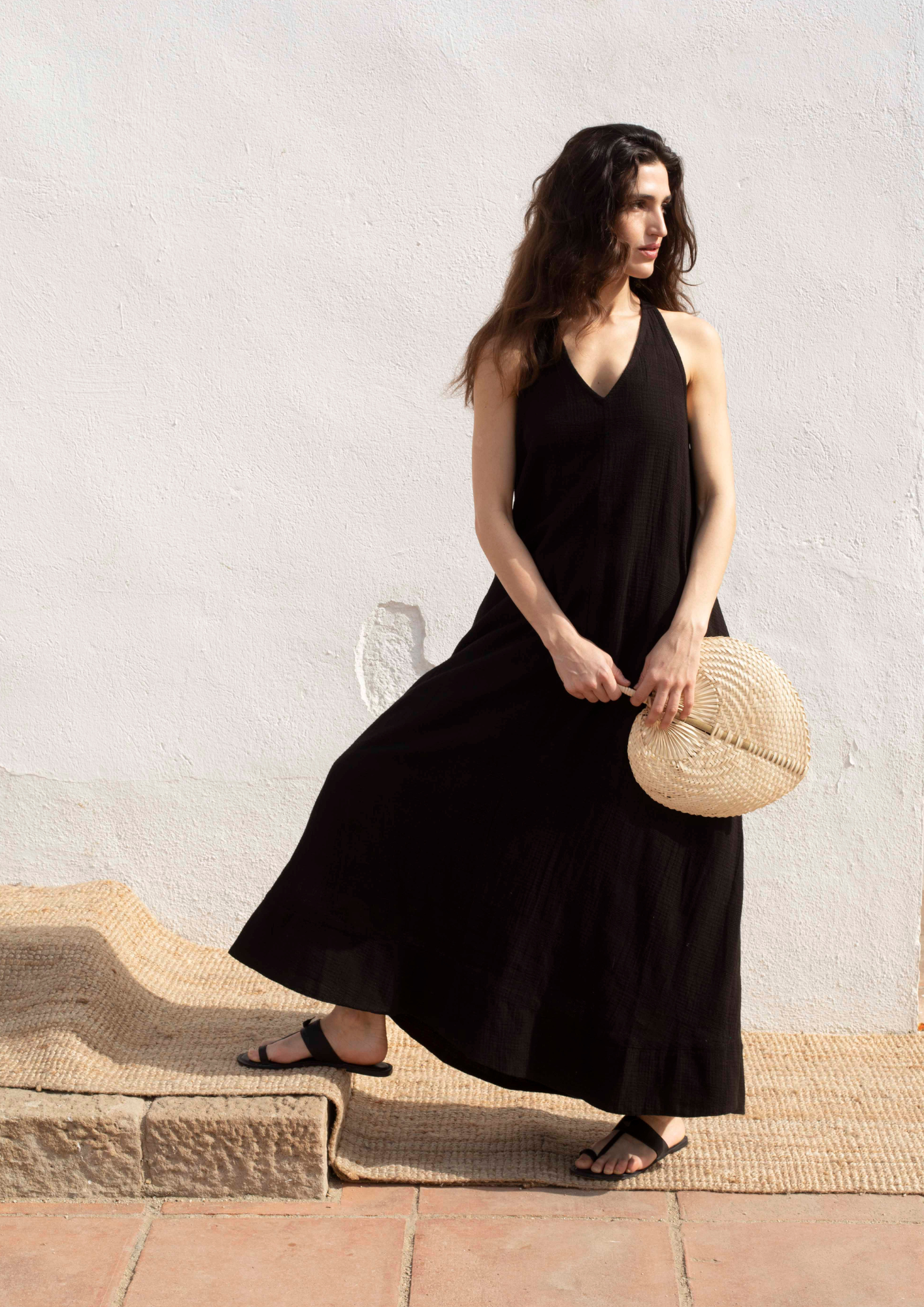 Vestido largo con escote halter y espalda en forma de X. Incluye forro y bolsillos invisibles.