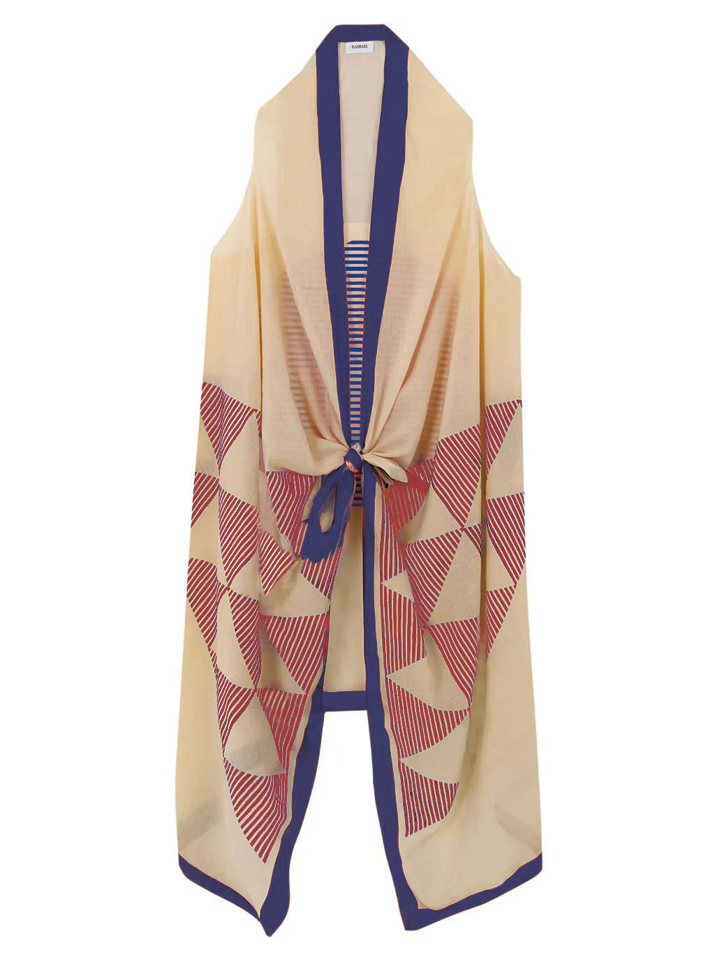 Sleeveless open kaftan dress with an asymmetrical hem. It can be worn over a swimsuit, as a sarong dress, or over other garments as a vest dress.