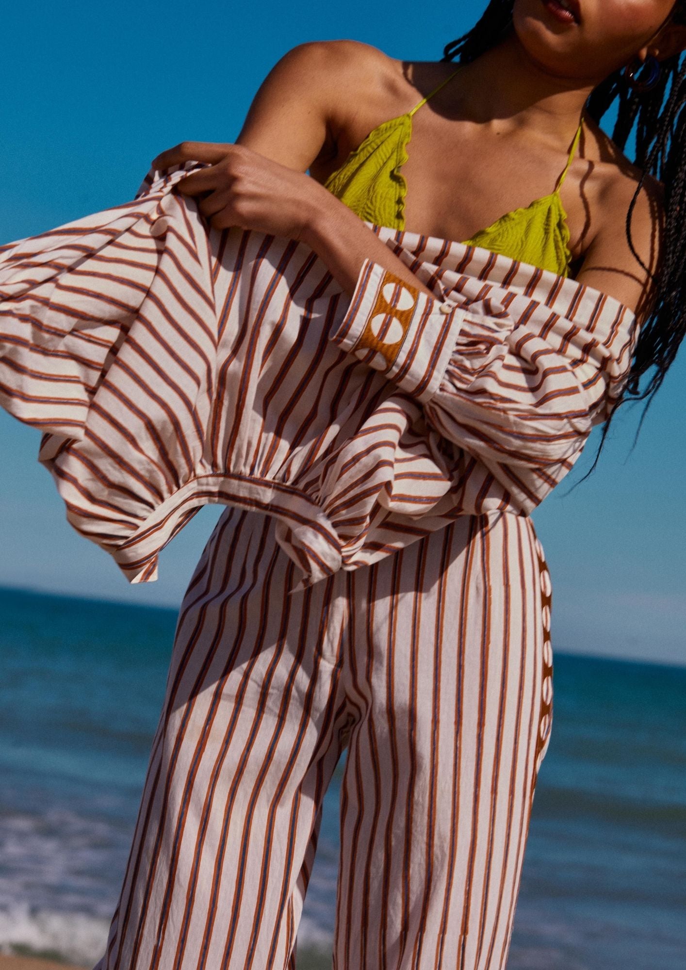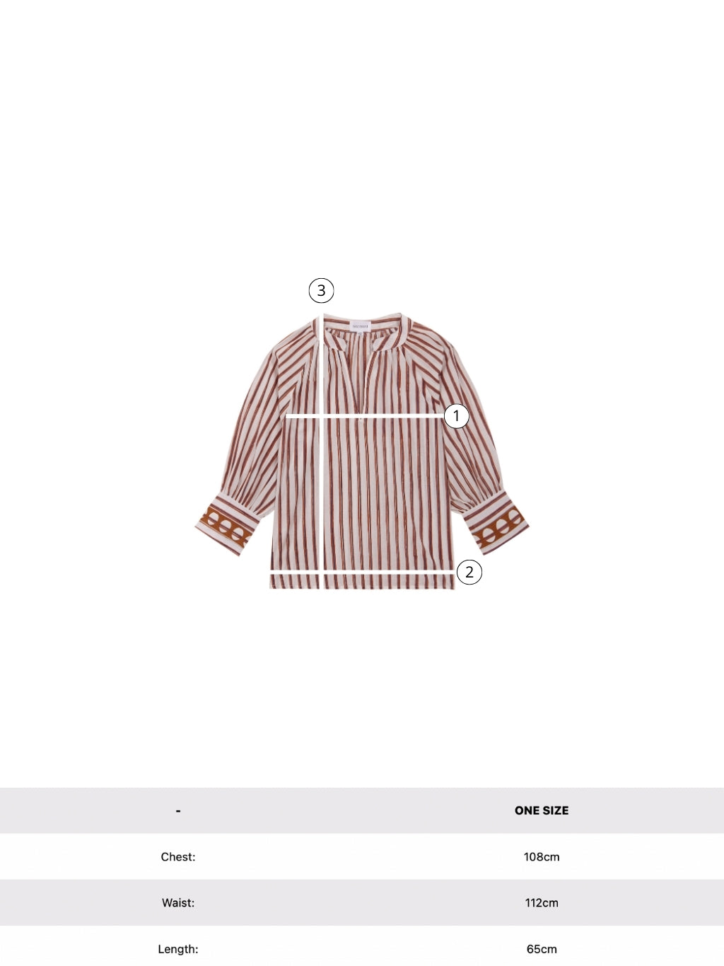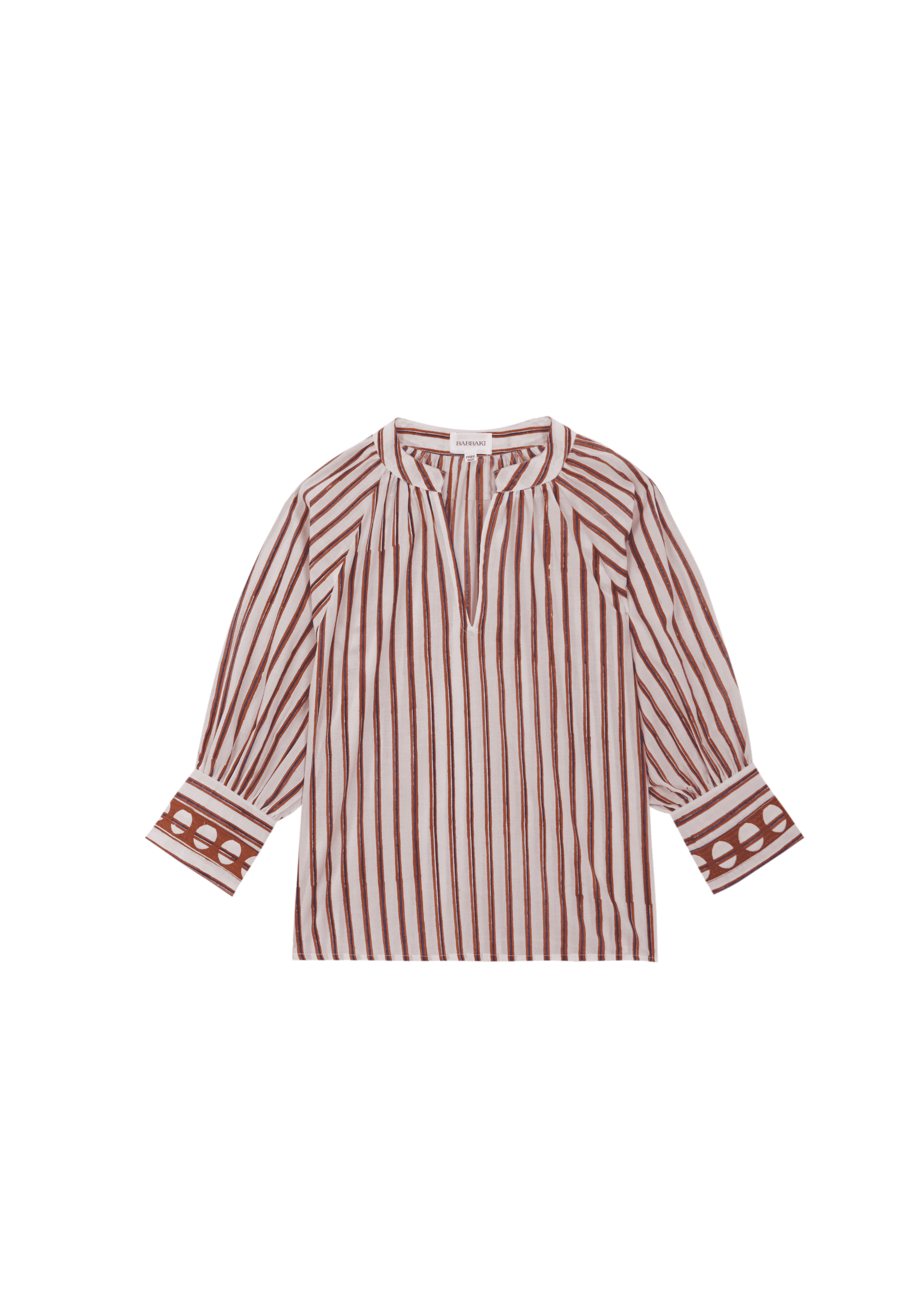Blusa de cuello mao y mangas abullonadas. Estampado rayas azul y marrón sobre fondo blanco, con detalles bordados en puños.