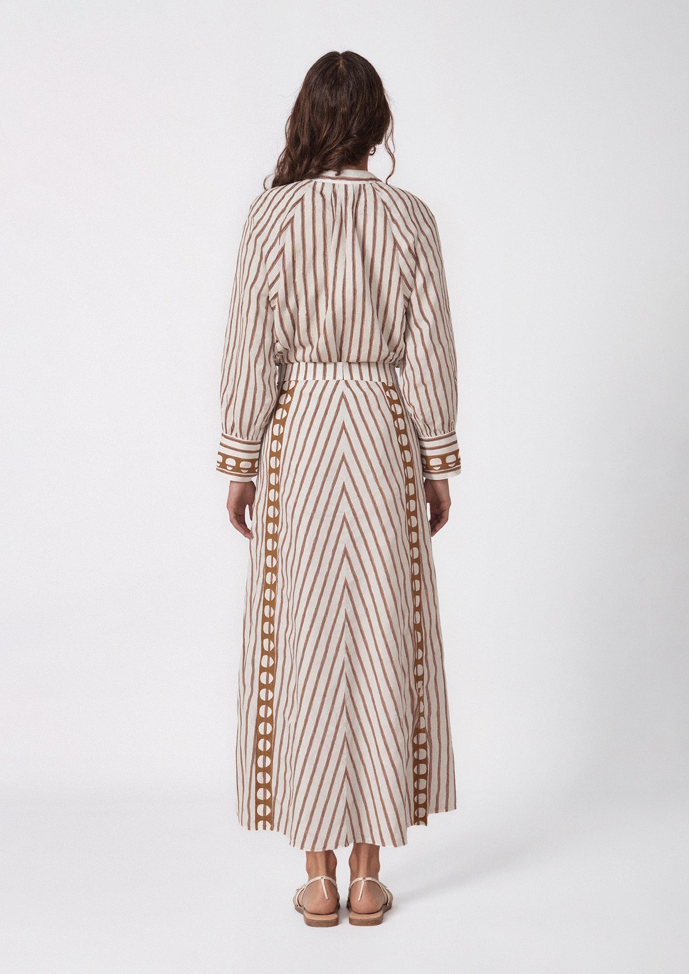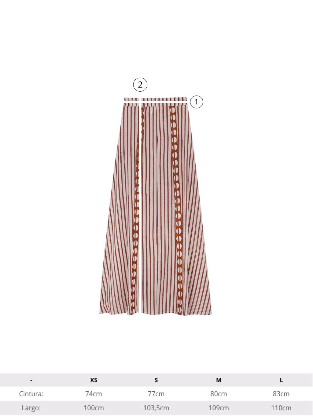 Falda larga de tiro alto en algodón estampado. Print de rayas azul y marrón sobre fondo blanco con detalles bordados. Cierre lateral con cremallera oculta en costura.