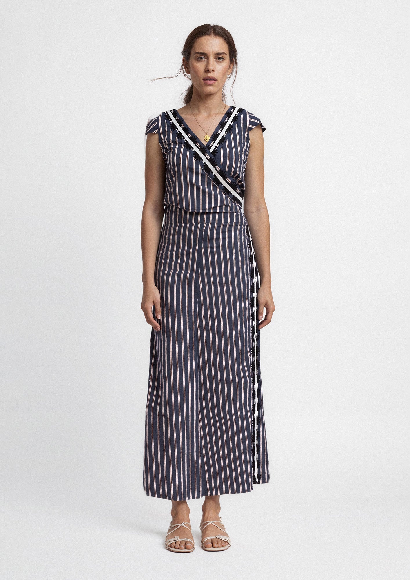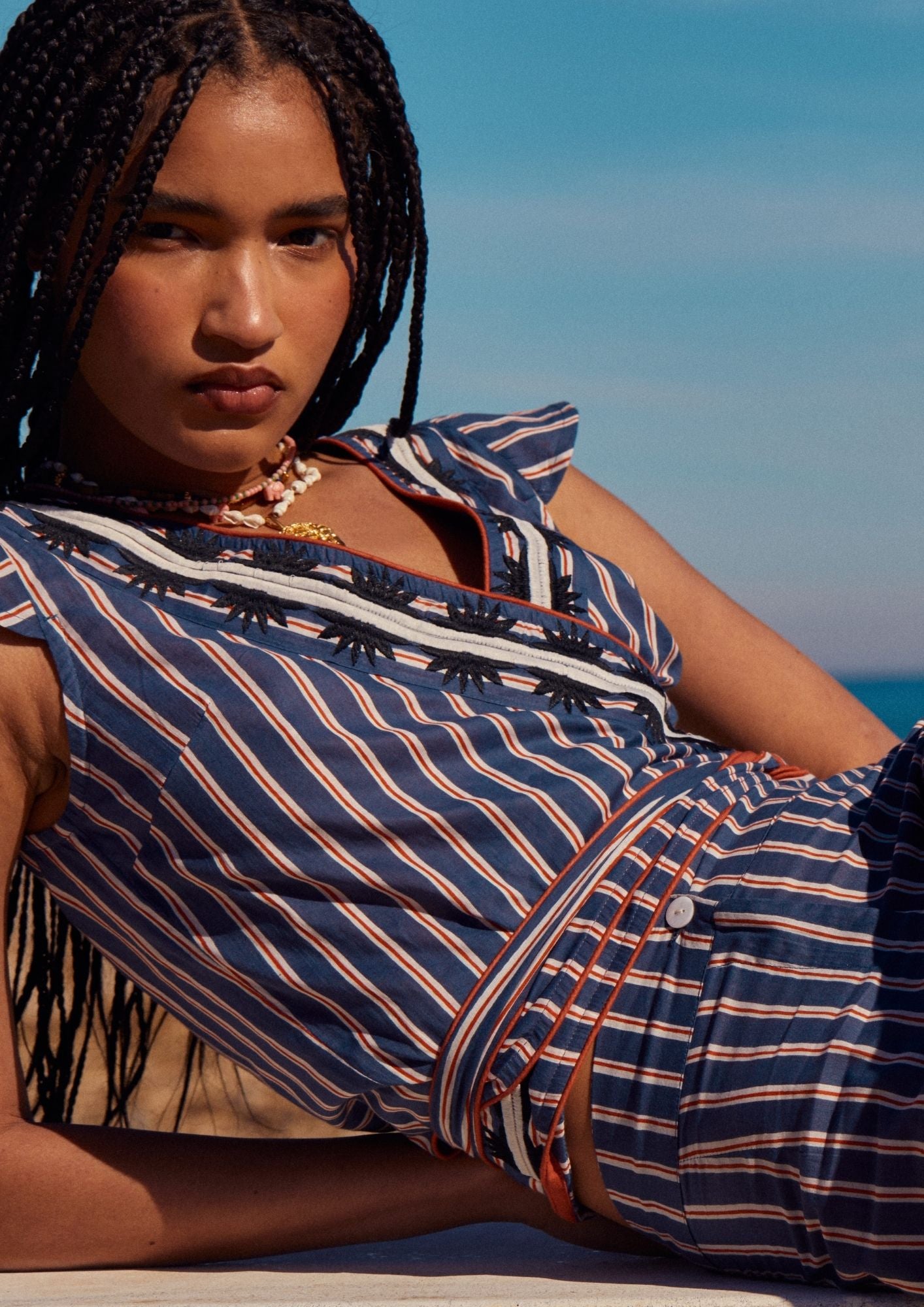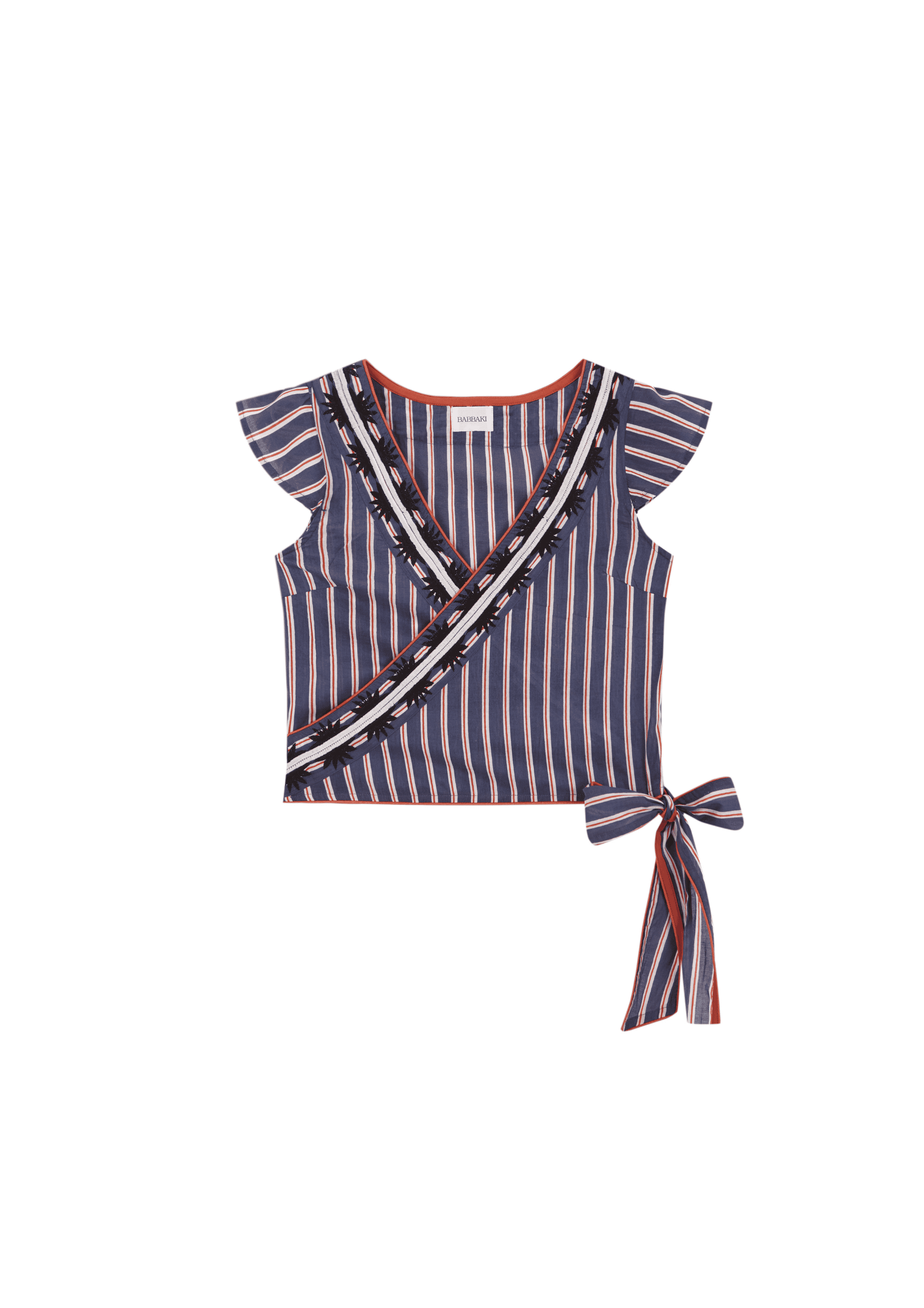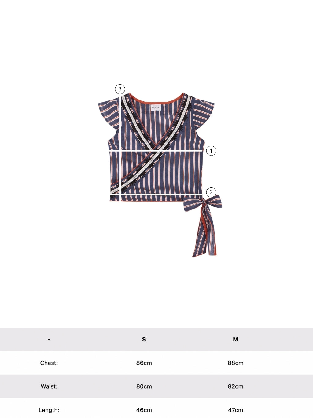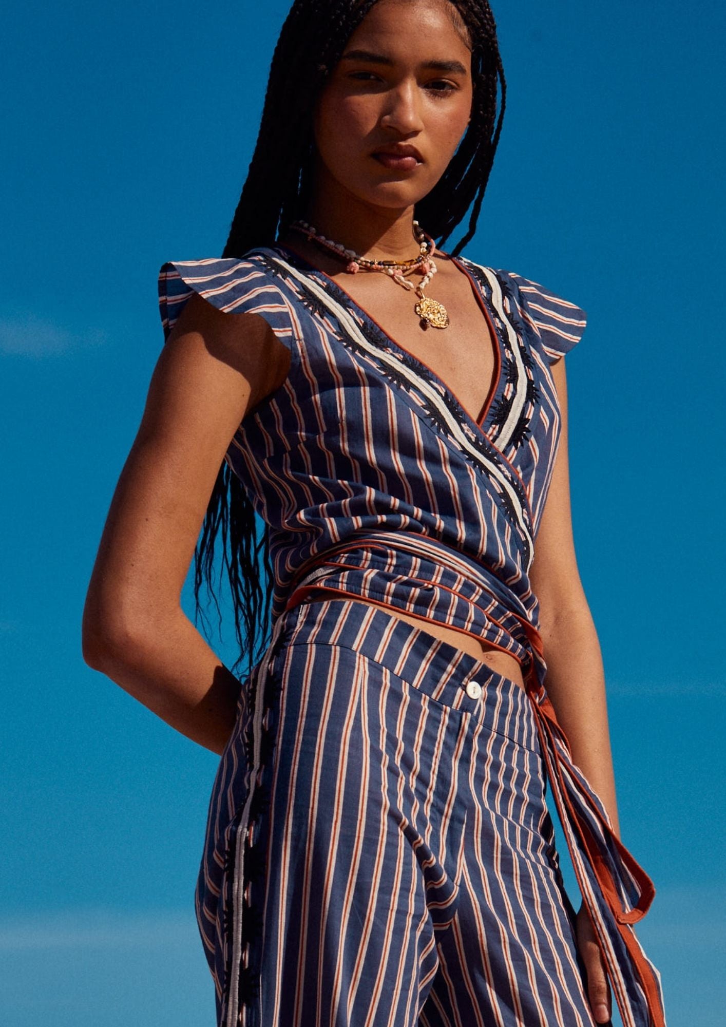 Top de corte recto con escote en pico, cierre cruzado con lazada y detalle en hombros. Estampado de rayas con vivo a contraste.