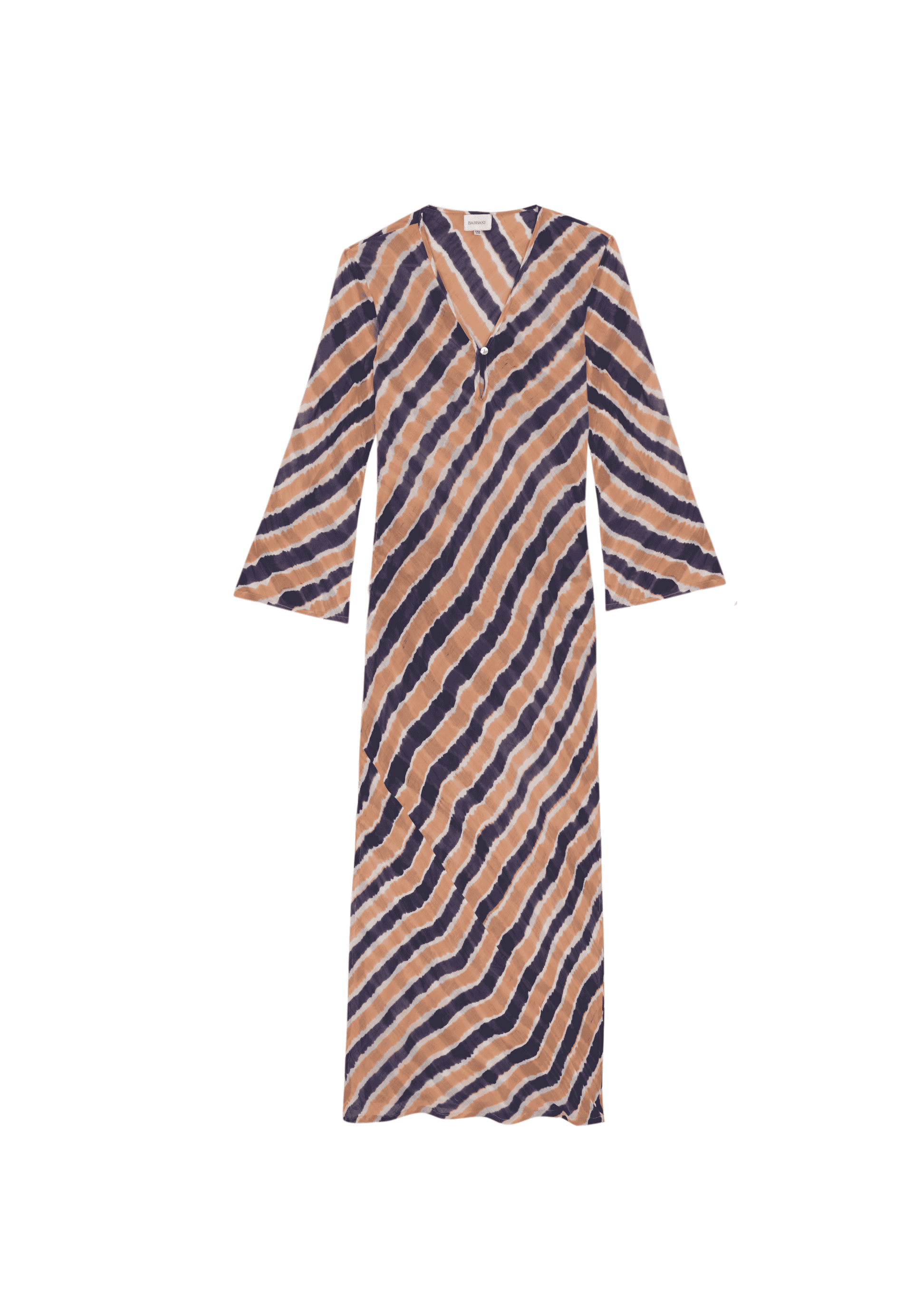 Estampado artesanalmente con la técnica del tie dye en tonos marrón y azul.