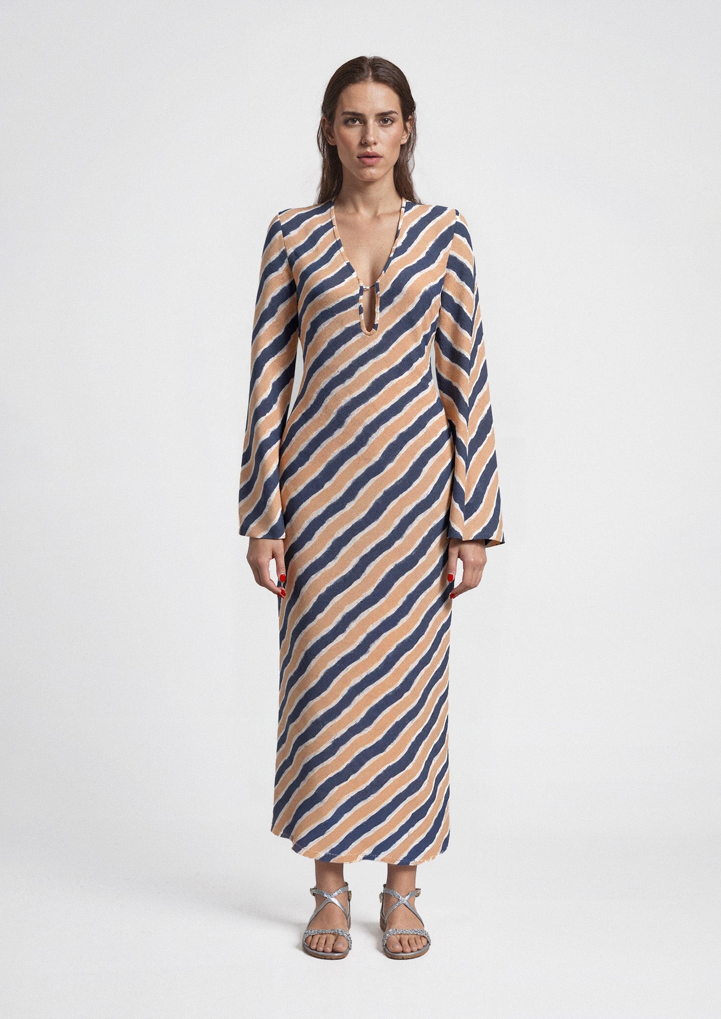 Túnica larga de escote pronunciado y mangas ligeramente acampanadas. Corte al bies que proporciona un efecto envolvente sobre el cuerpo.