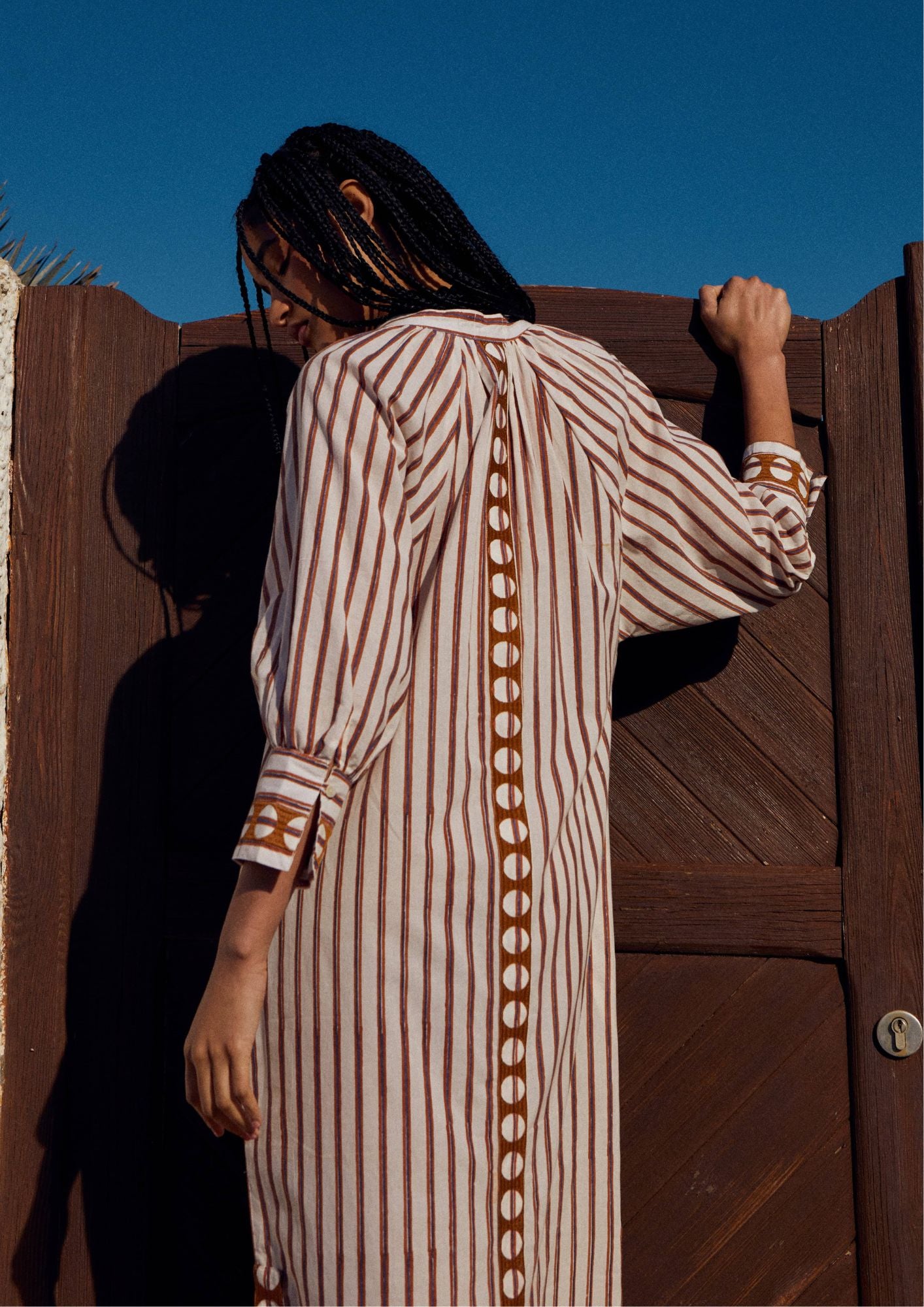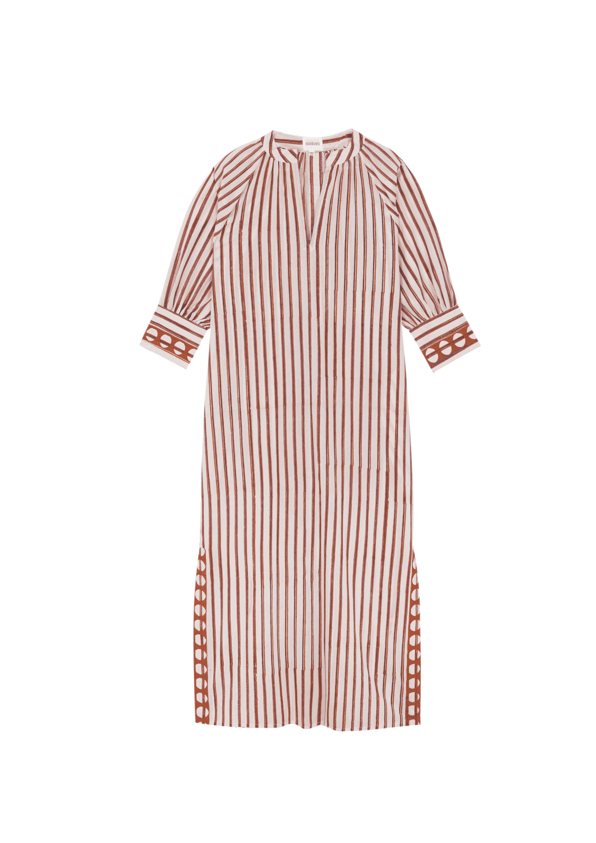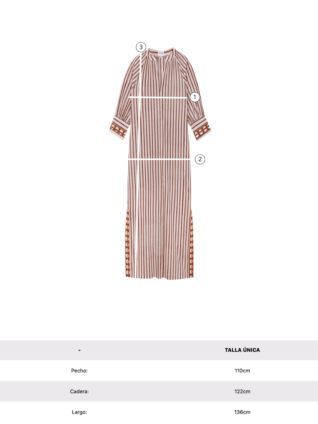 Vestido largo fluido de escote pico con manga francesa abullonada. Estampado rayas azul y marrón sobre fondo blanco,