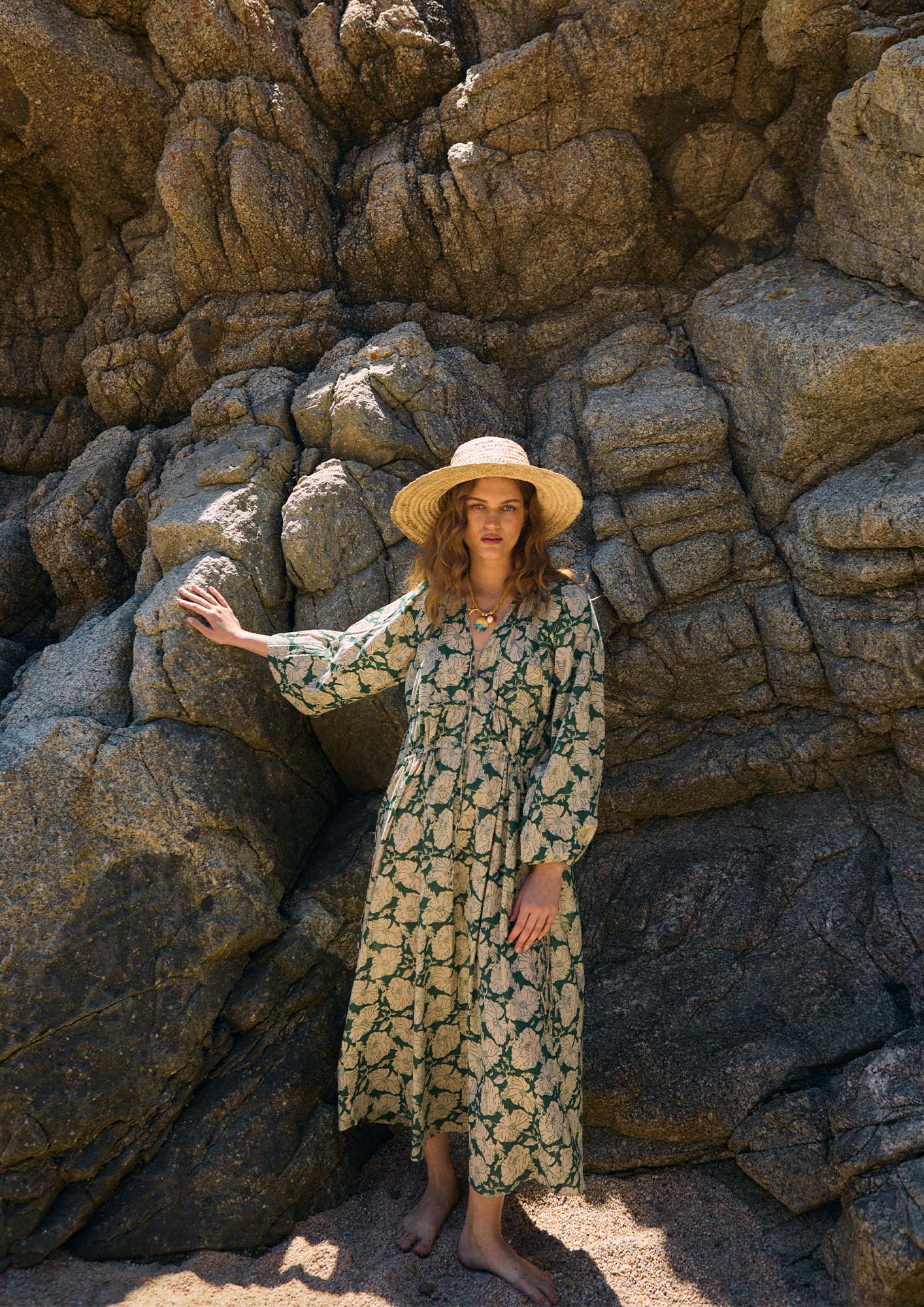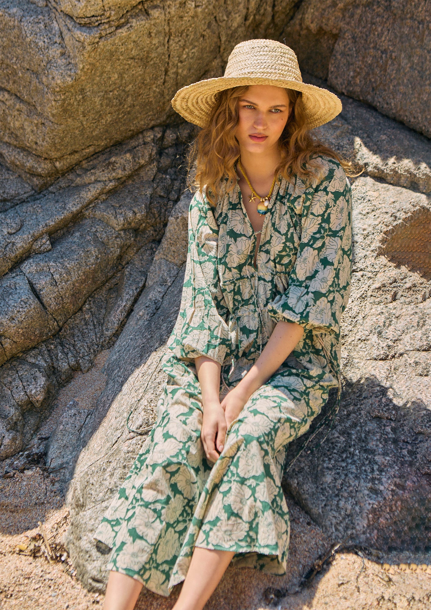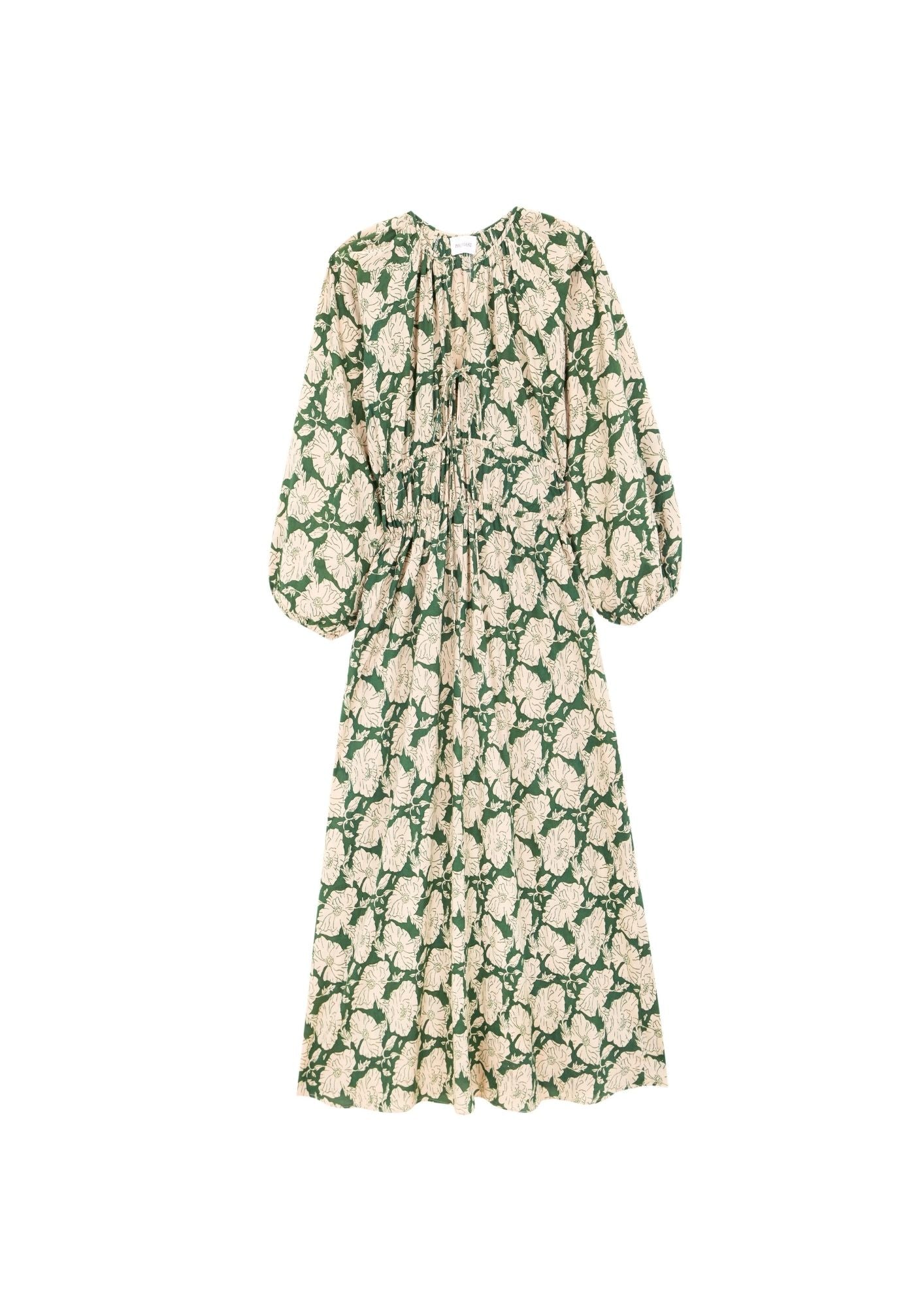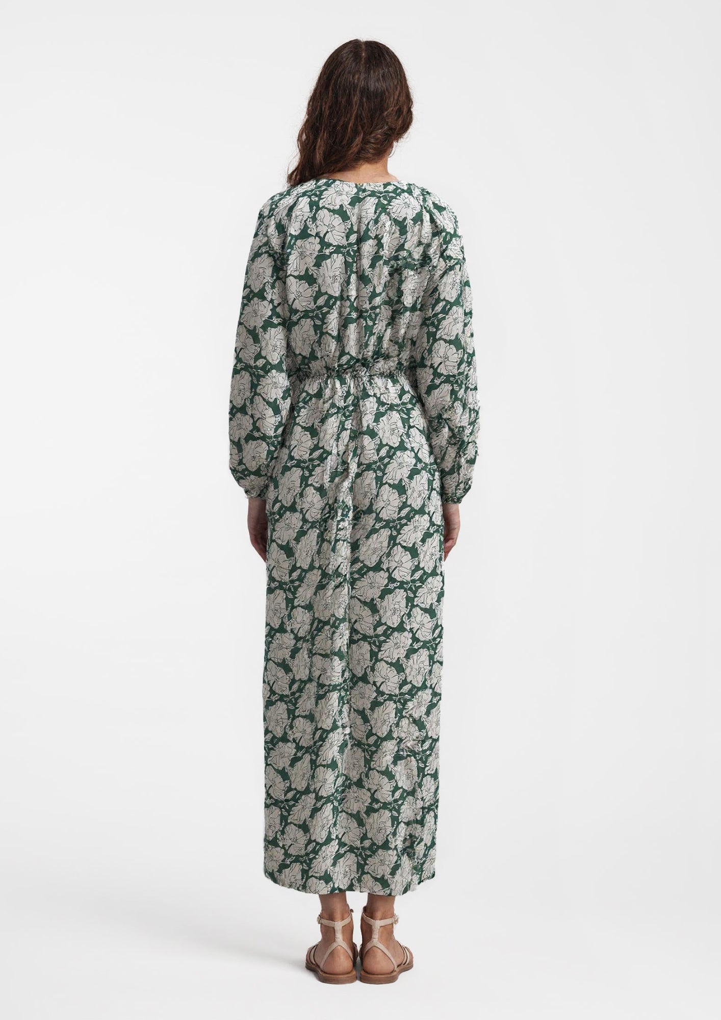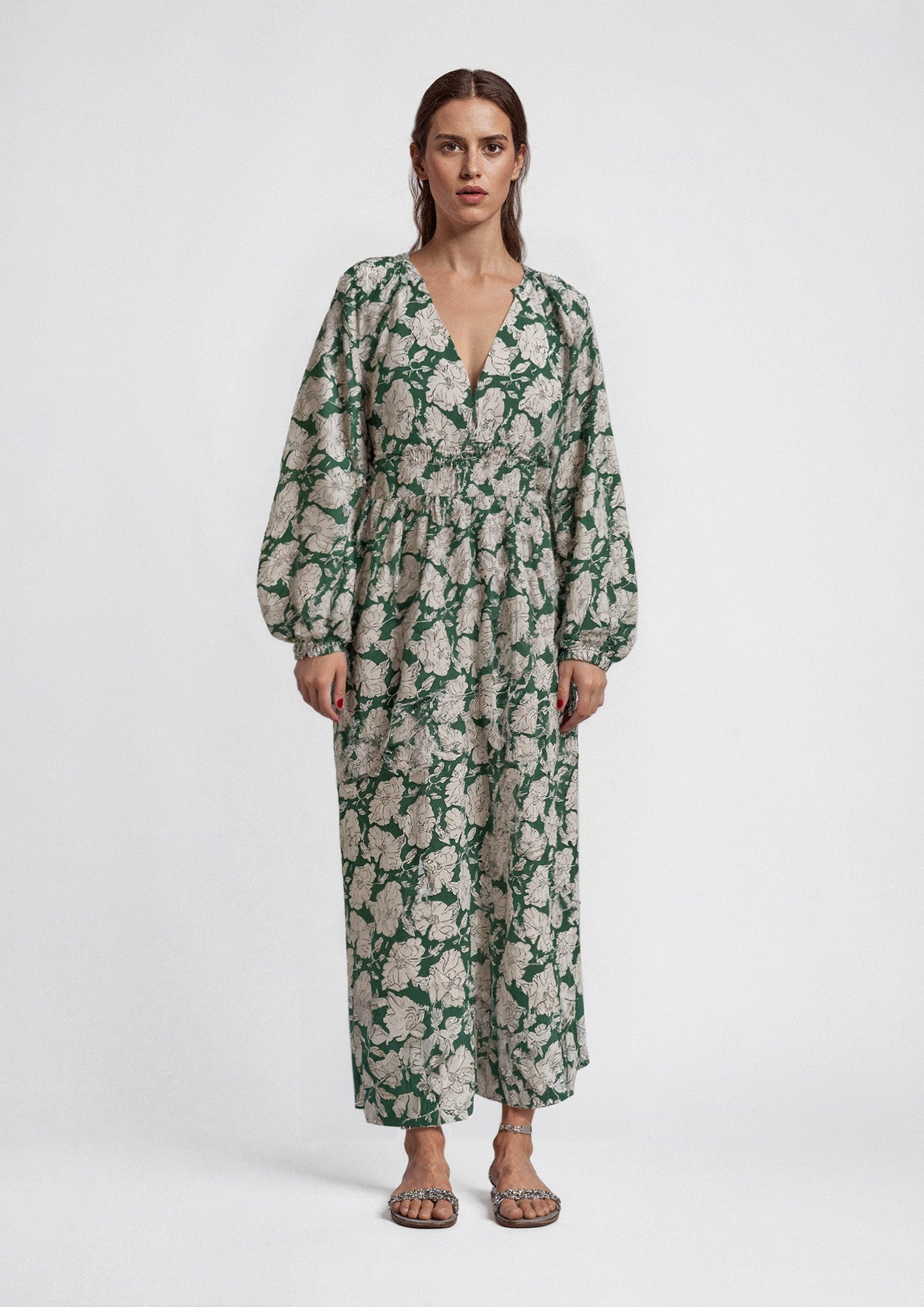 Vestido largo de estilo bohemio, con un estampado floral en tonos verdes y beige. Presenta un diseño de manga larga abullonada, con puños elásticos que aportan un toque de volumen. Escote redondo y cierre en la parte delantera mediante pequeños botones ocultos.