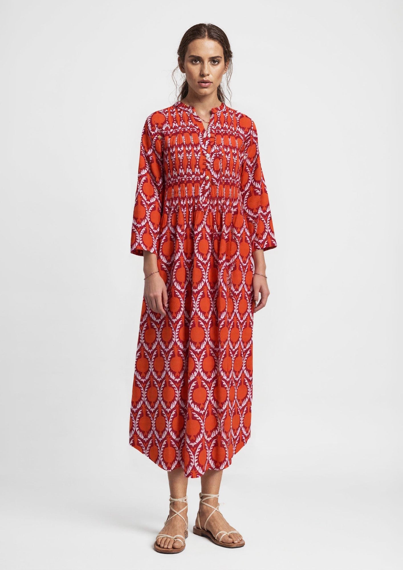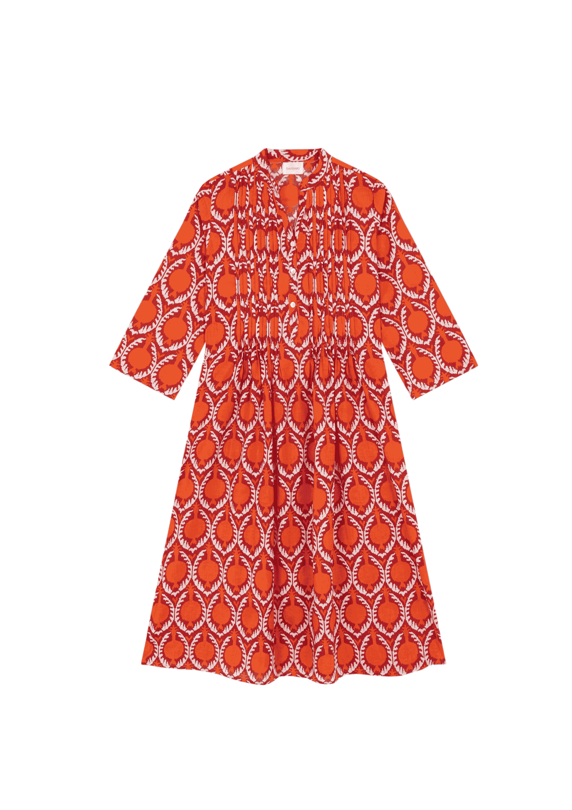 Vestido ligero con estampado de granadas. Cuello mao y escote de pico con pliegues y bolsillos. Cierre frontal con botones.
