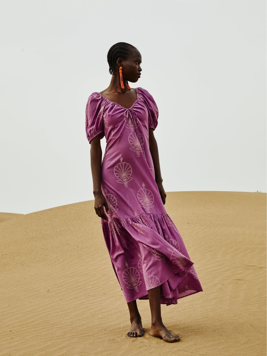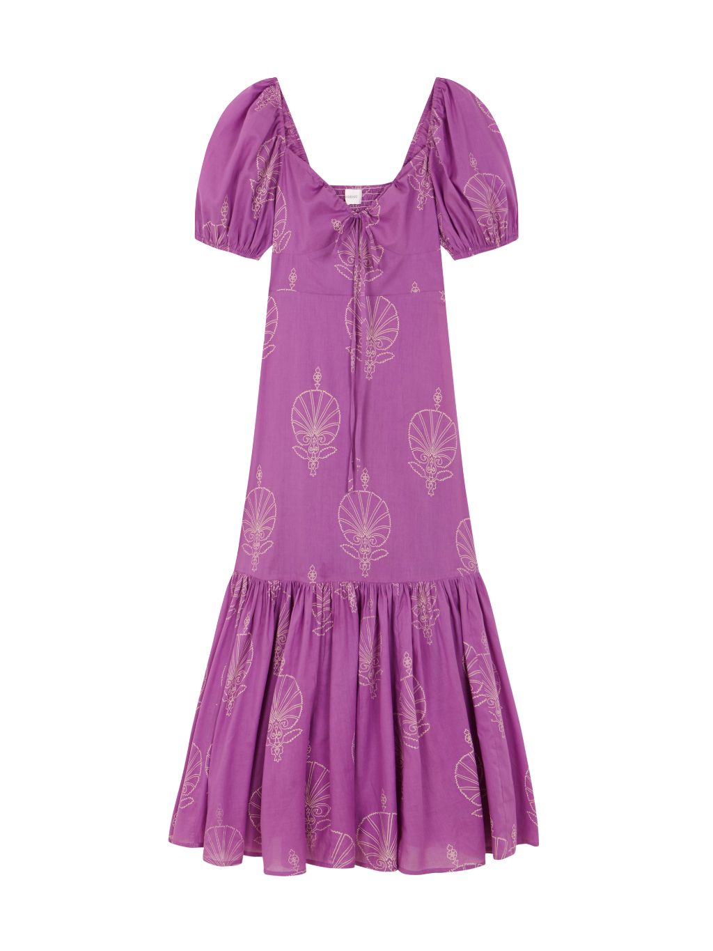 Vestido largo de manga corta abullonada. Escote fruncido con lazo y espalda de nido de abeja para una mejor adaptación. Volante en el bajo.