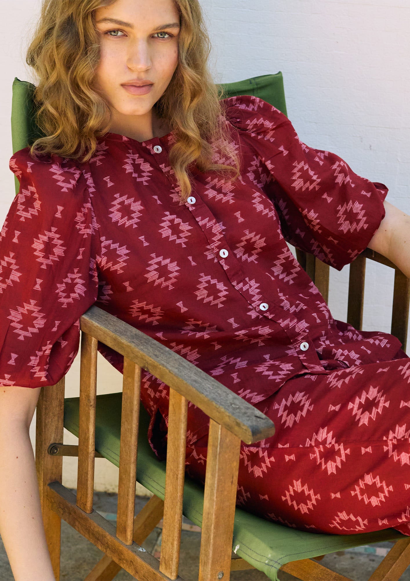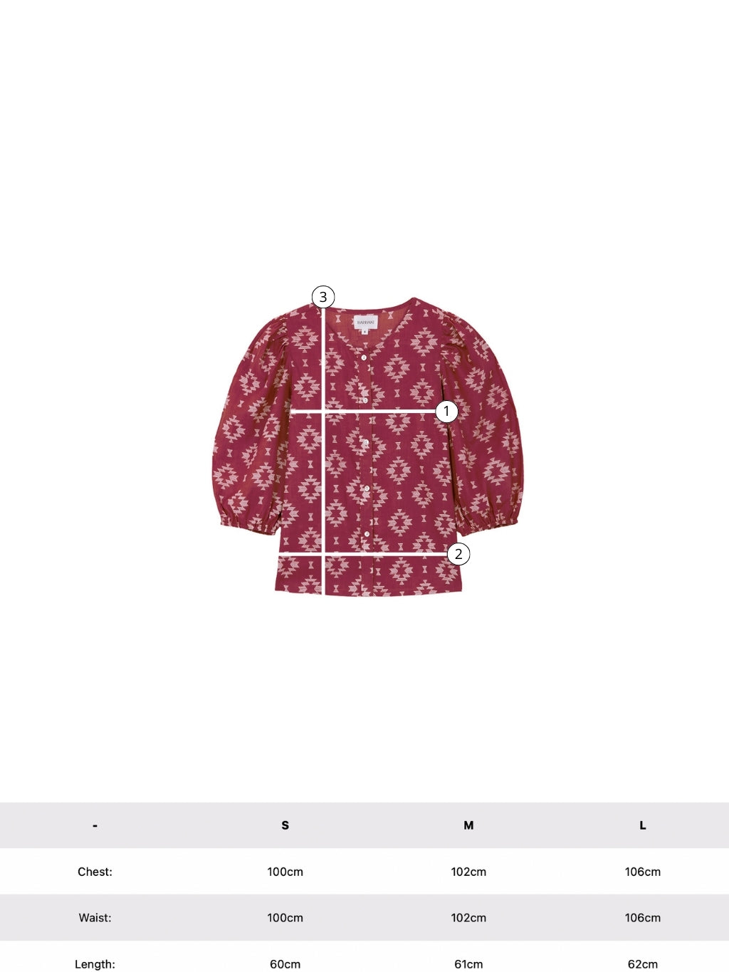 Blusa de algodón estampada en tie-dye de tonos azules. Manga abullonada.