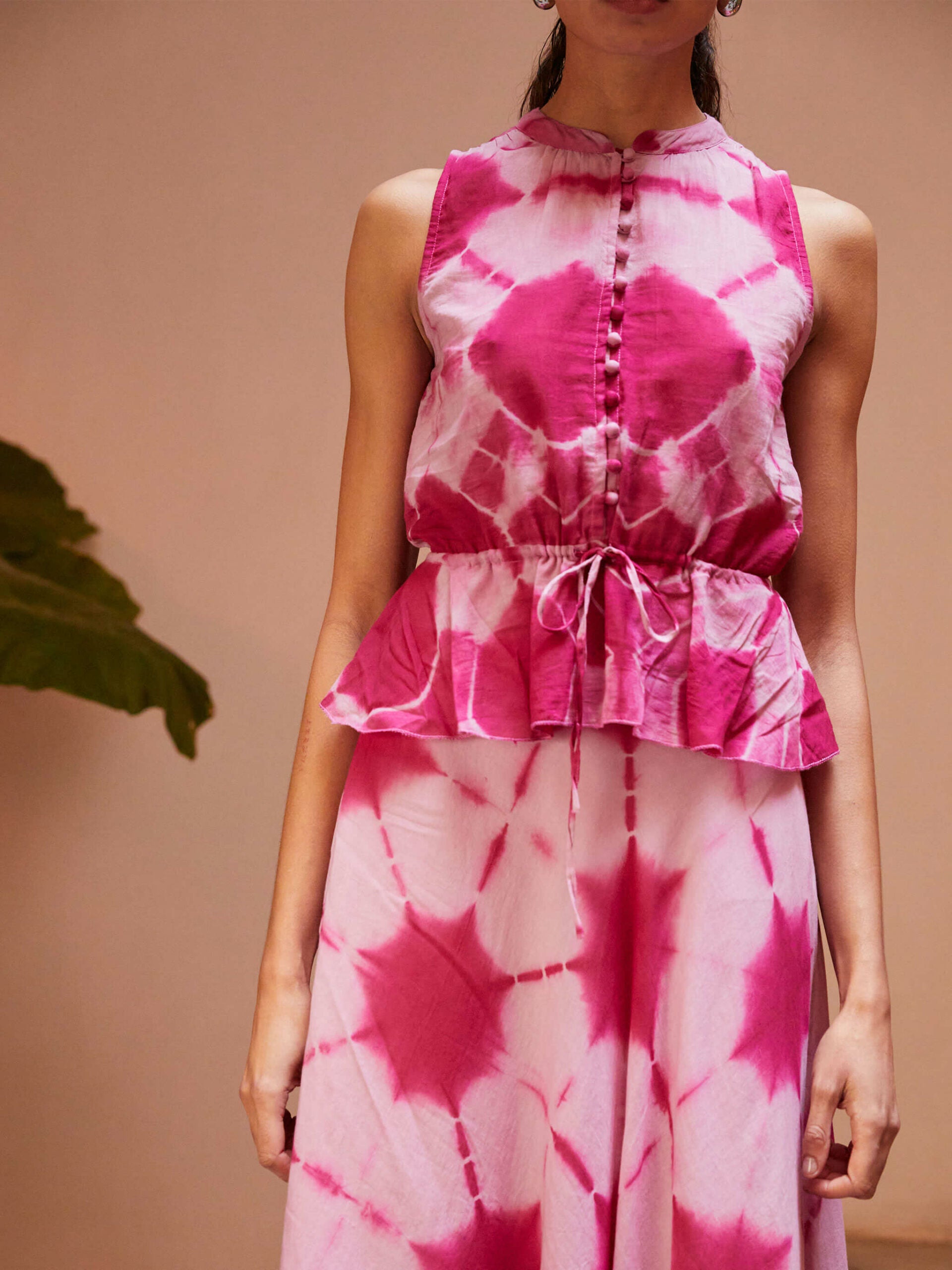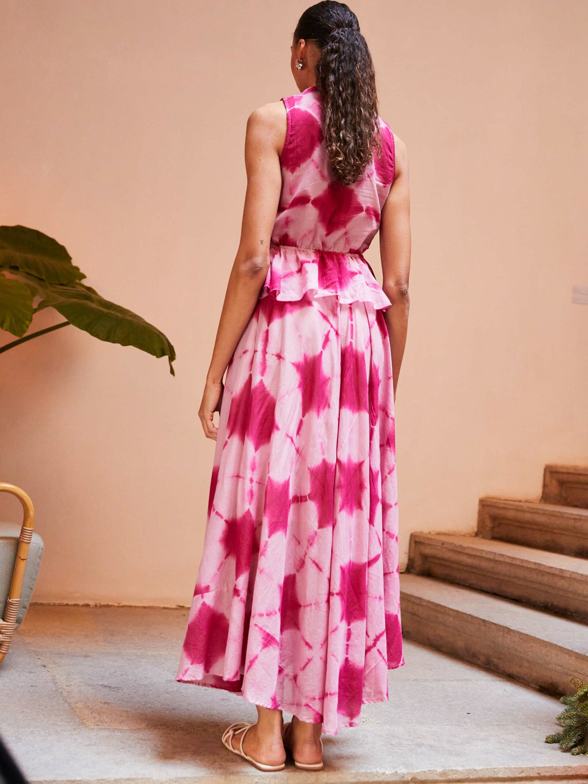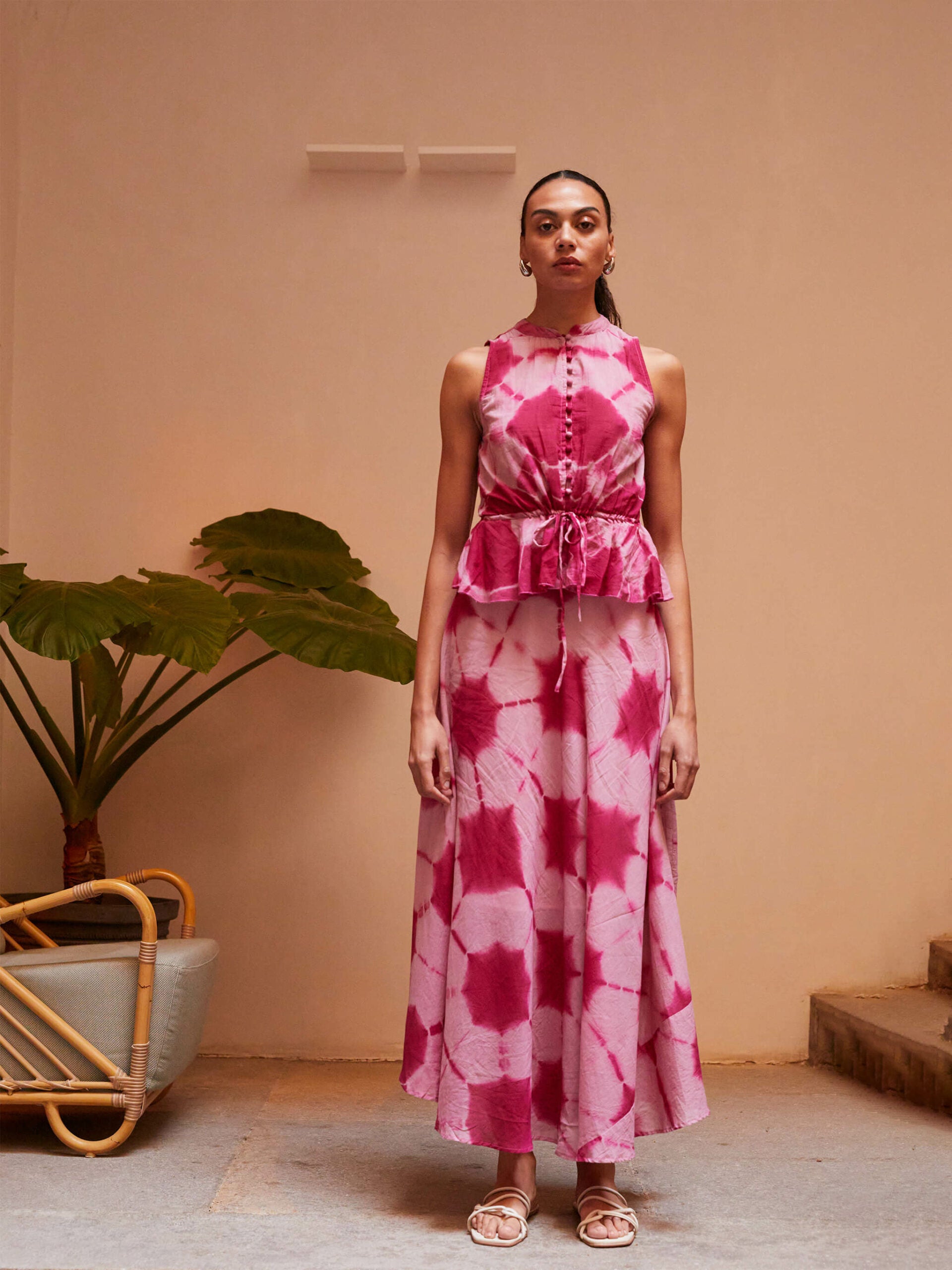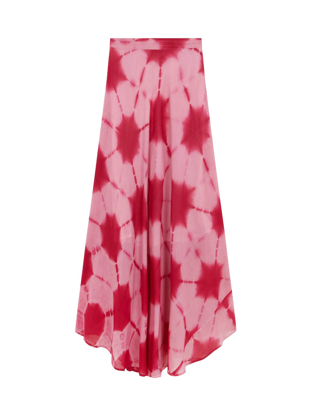 Long A-line skirt with an elasticated back waistband for a better fit. Hand-printed using the tie-dye technique in shades of pink.