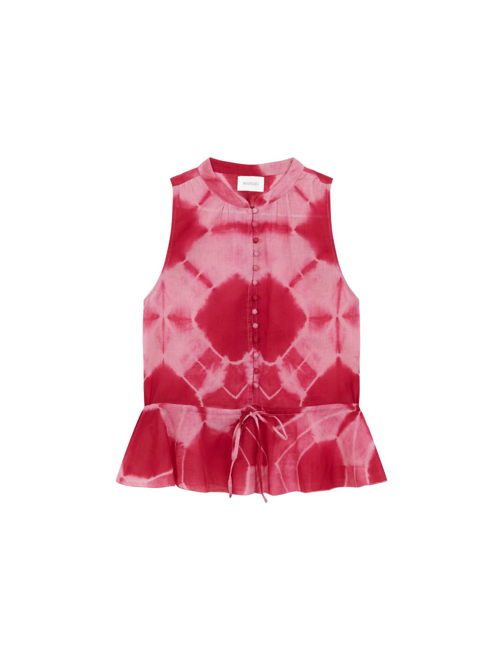Sleeveless top with mandarin collar and covered button closure at the front. Ruffle from the waist down with adjustable drawstring.