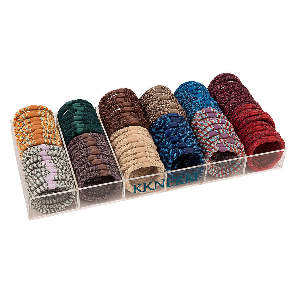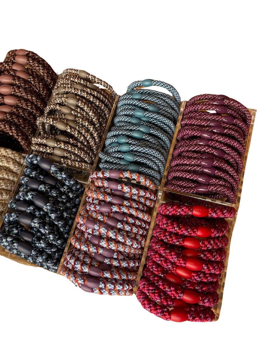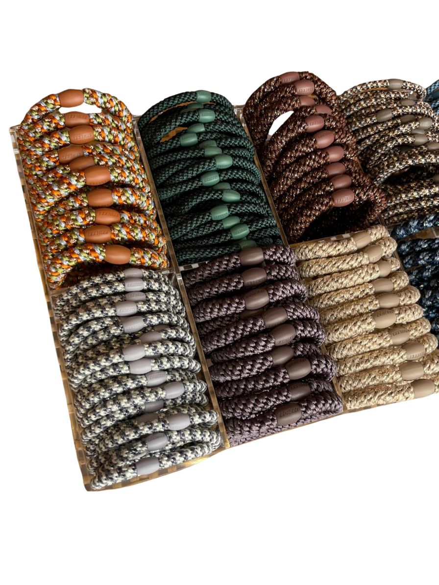Cada goma está tejida con más de 60 hilos elásticos entrelazados, lo que la hace resistente, suave al tacto y cuidadosa con tu cabello.