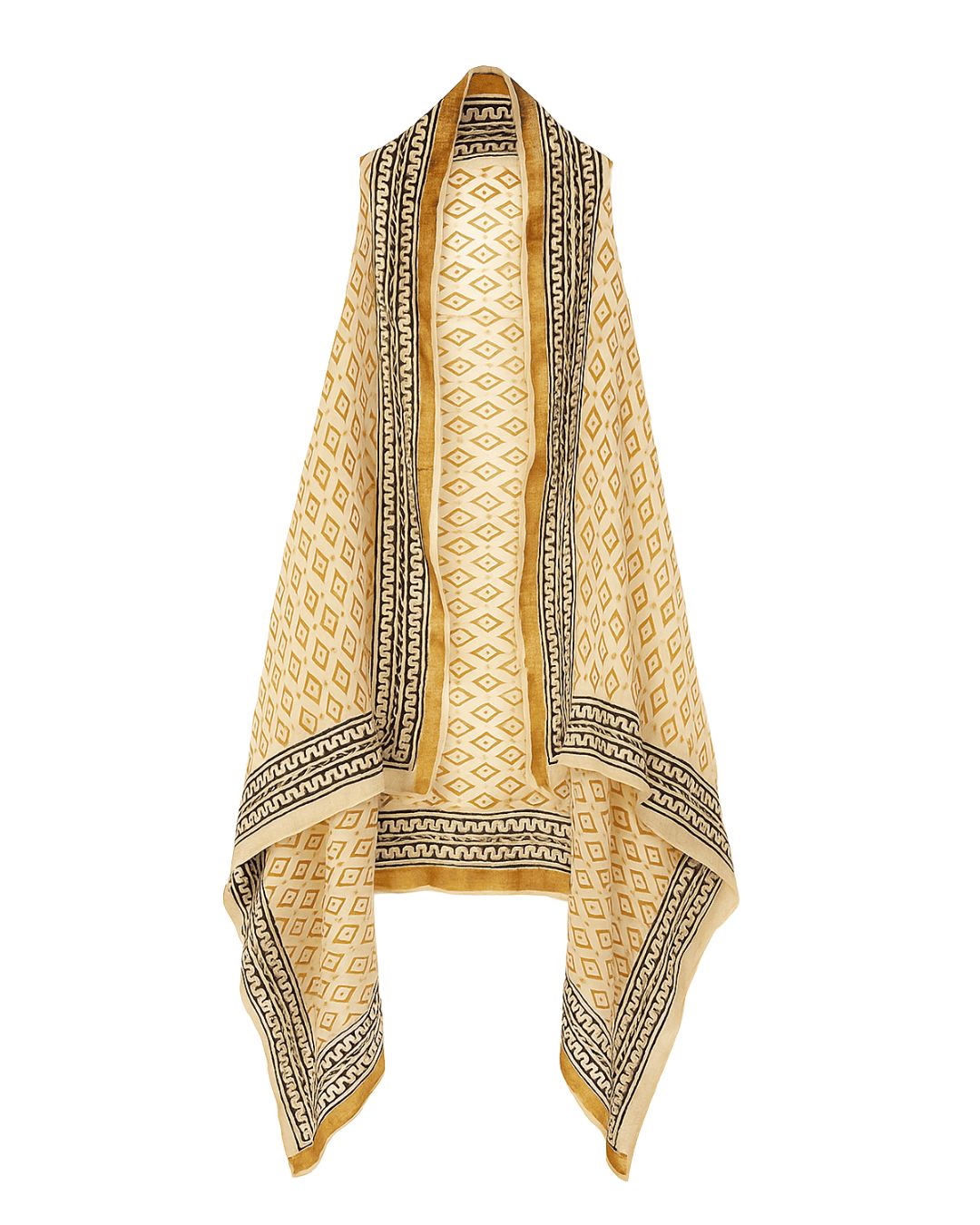Vestido kaftan abierto sin mangas y bajo asimétrico. Puede llevarse sobre bañador, a modo de vestido-pareo o sobre otras prendas como vestido-chaleco.