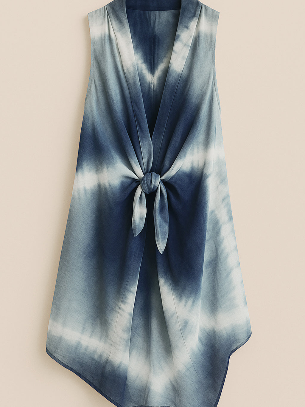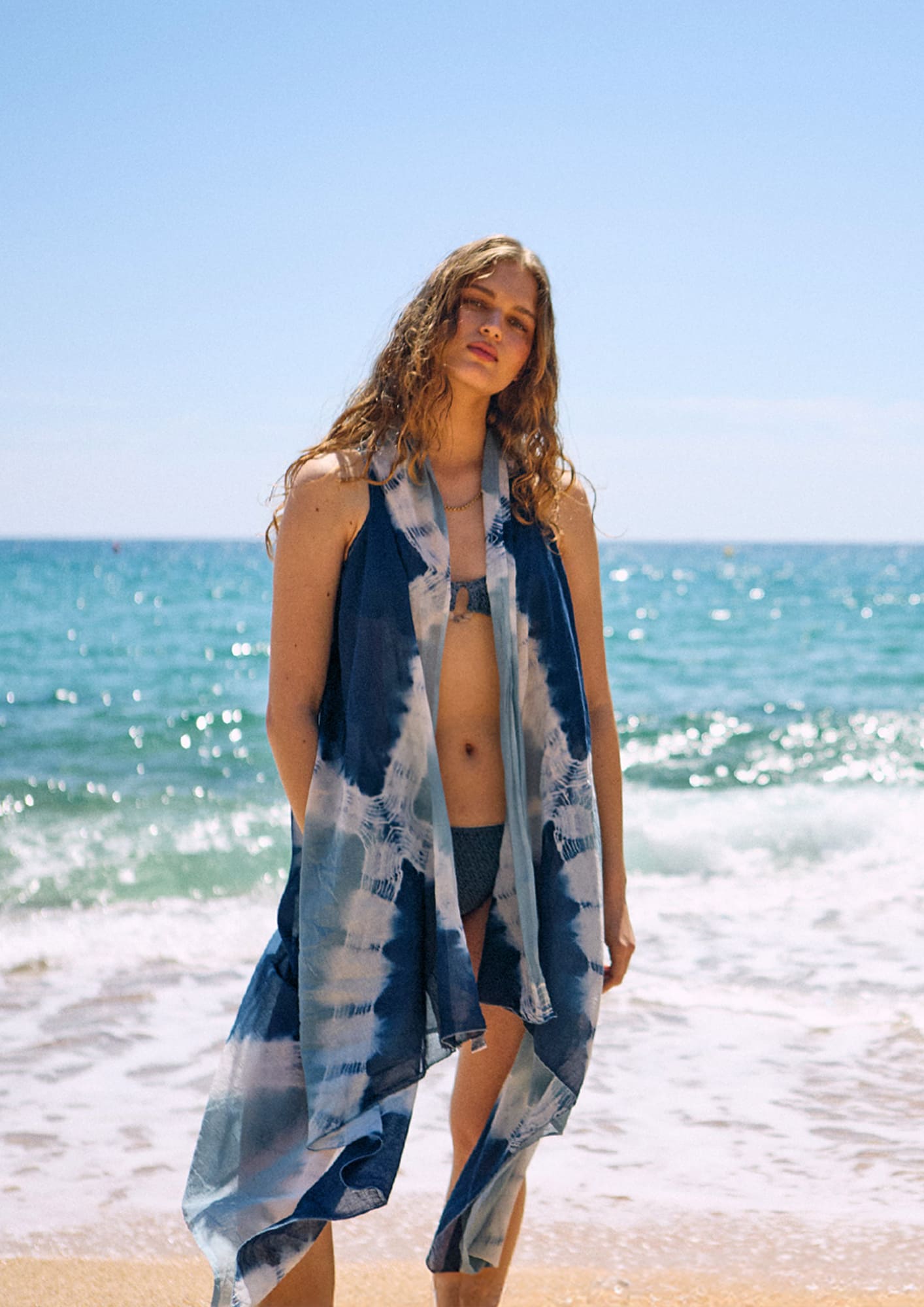 Vestido kaftan abierto sin mangas y bajo asimétrico. Puede llevarse sobre bañador, a modo de vestido-pareo o sobre otras prendas como vestido-chaleco.