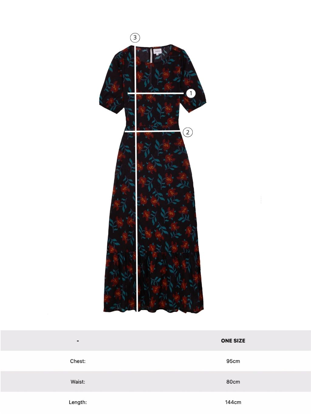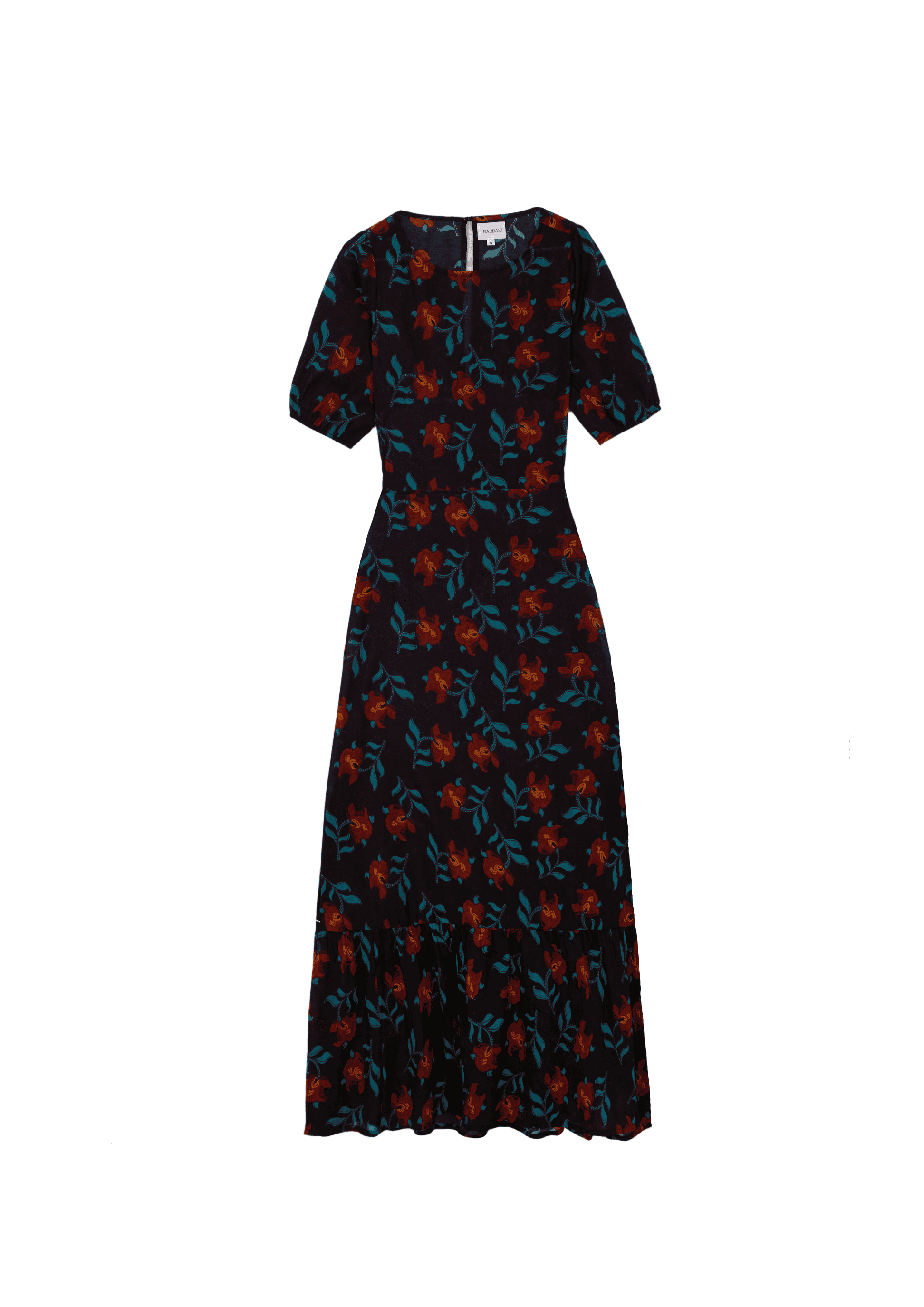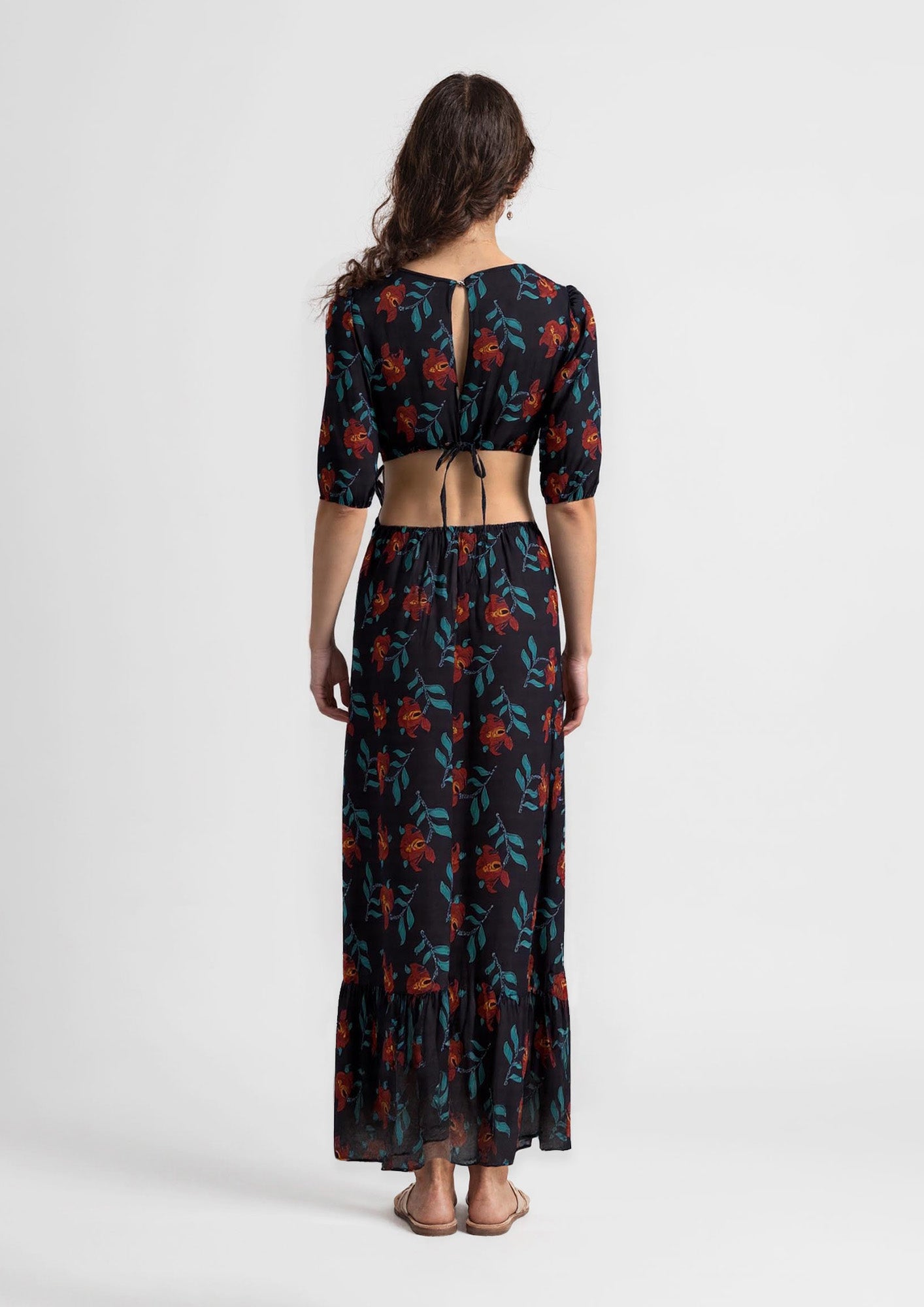 Vestido de manga corta ligeramente abullonada con abertura en la espalda. Print floral sobre fondo negro. Volante en el bajo.