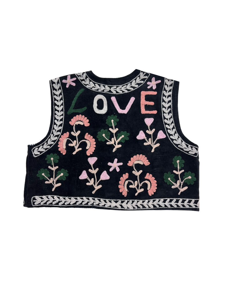 Chaleco en terciopelo color negro con bordados multicolor. Forro estampado en rayas azul marino y blanco.