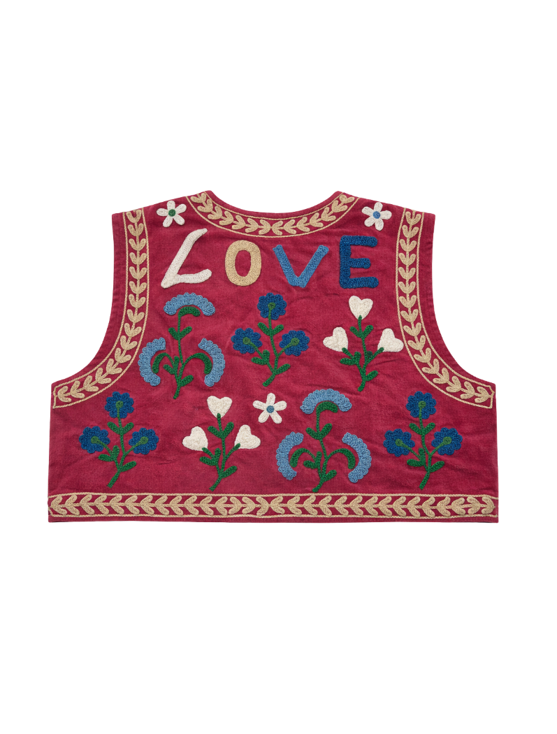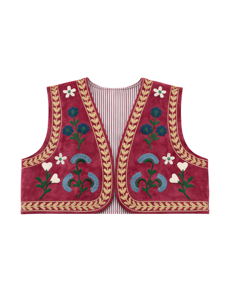 Chaleco en terciopelo color frambuesa medio con bordados multicolor. Forro estampado en rayas azul marino y blanco.