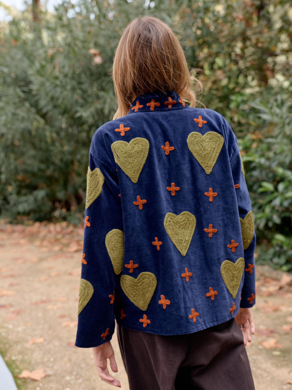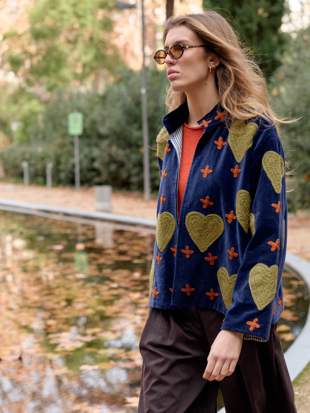 Chaqueta de terciopelo en color azul con bordados en color ocre y marrón. Bolsillos laterales, cuello mao, y forro estampado en rayas blancas y negras.