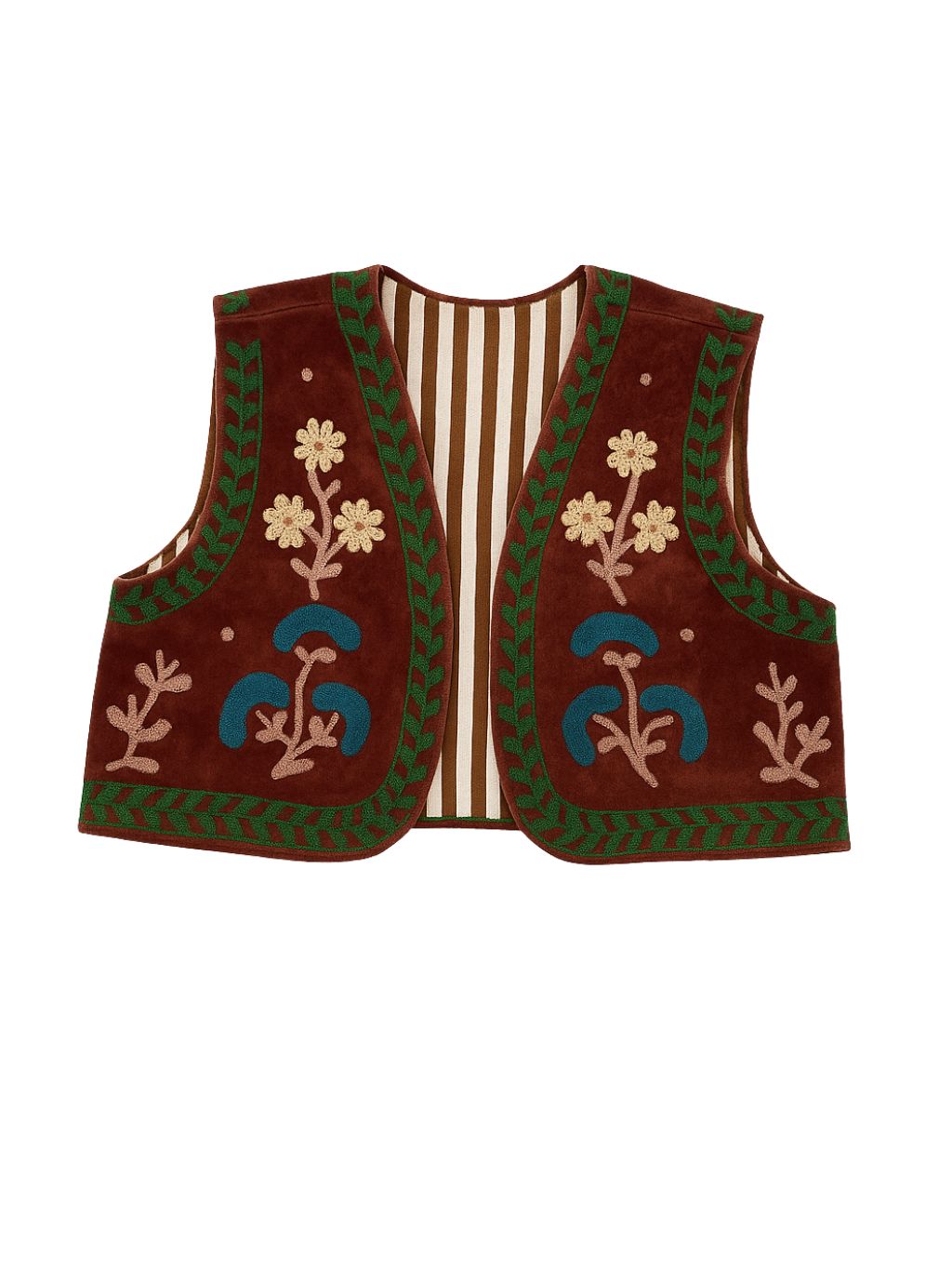 Chaleco en terciopelo color marrón con bordados multicolor. Forro estampado en rayas marrón y blanco.