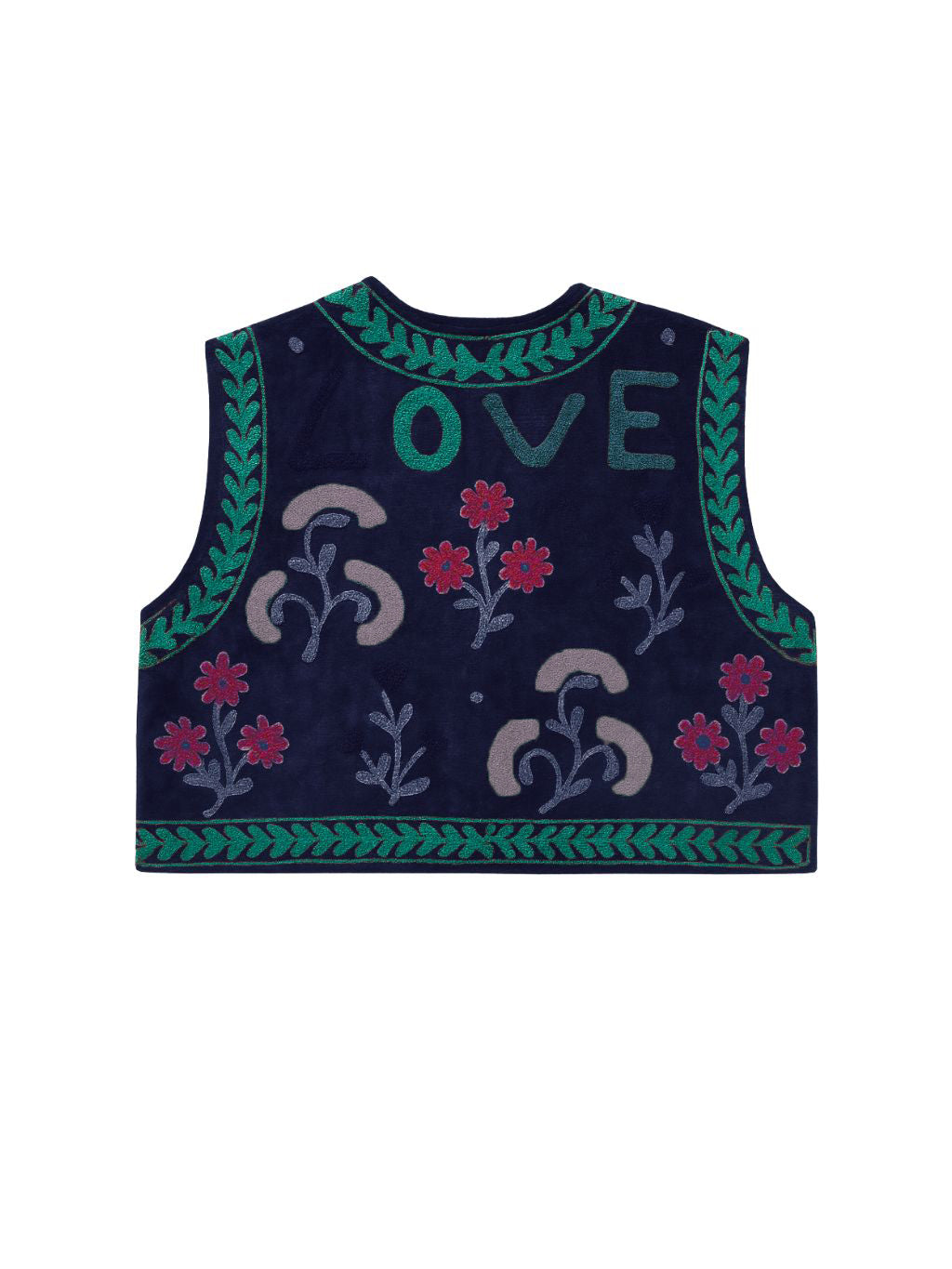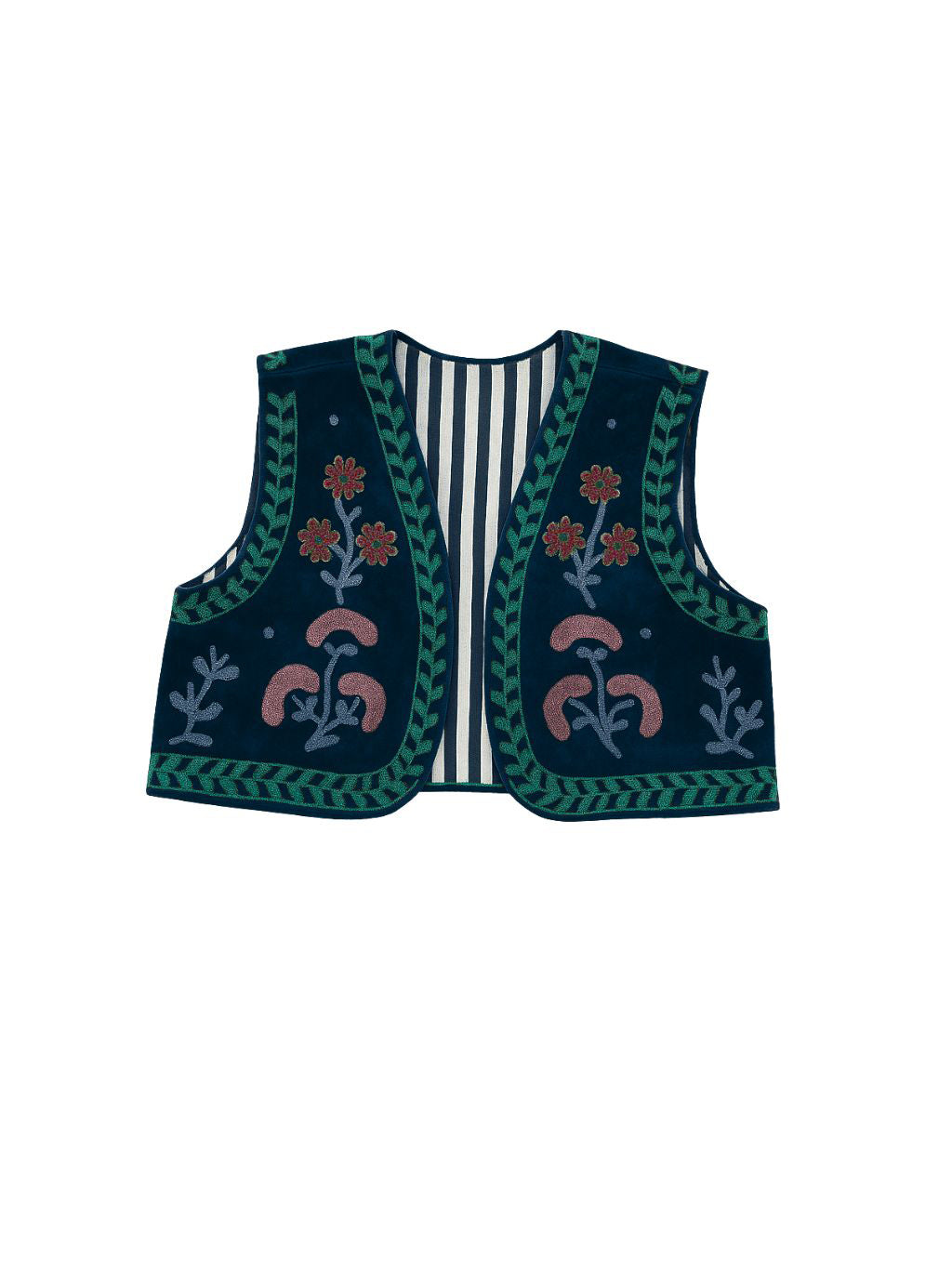 Chaleco en terciopelo color azul marino con bordados multicolor. Forro estampado en rayas azul marino y blanco.