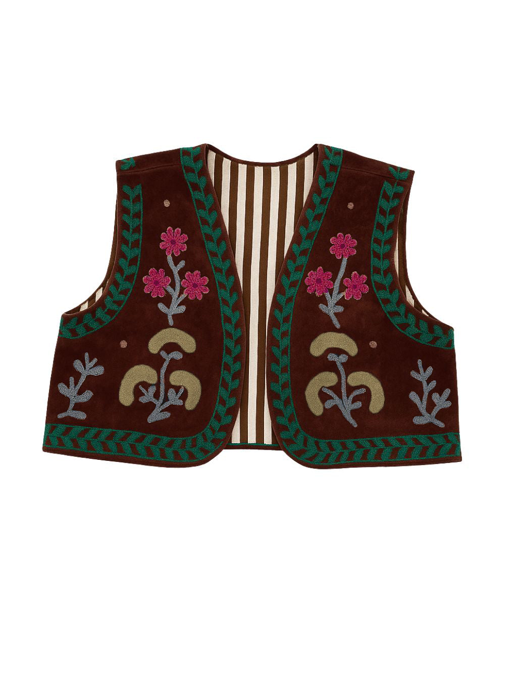 Chaleco en terciopelo color marrón chocolate con bordados multicolor. Forro estampado en rayas marrón y blanco.
