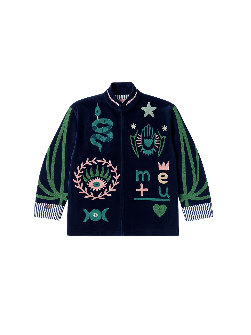 Chaqueta de terciopelo en color azul marino con bordados multicolor. Bolsillos laterales, cuello mao, y forro estampado en rayas y flores.