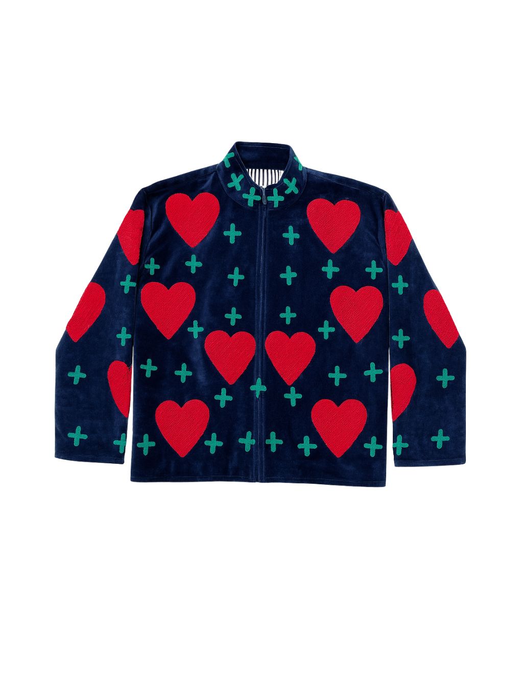 Chaqueta de terciopelo en color azul con bordados en color frambuesa y turquesa. Bolsillos laterales, cuello mao, y forro estampado en rayas blancas y marino.