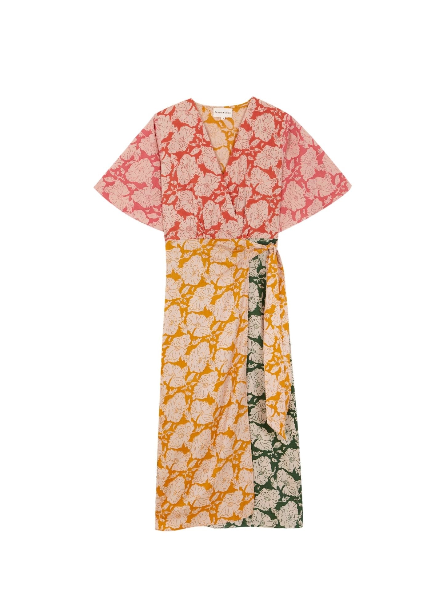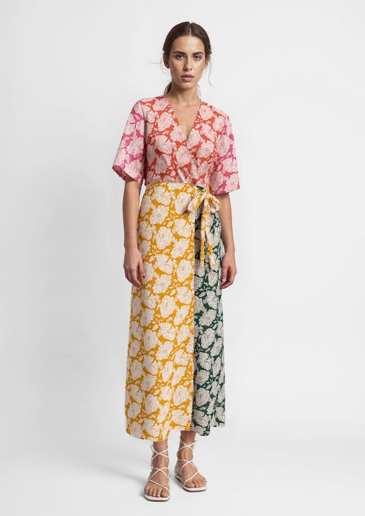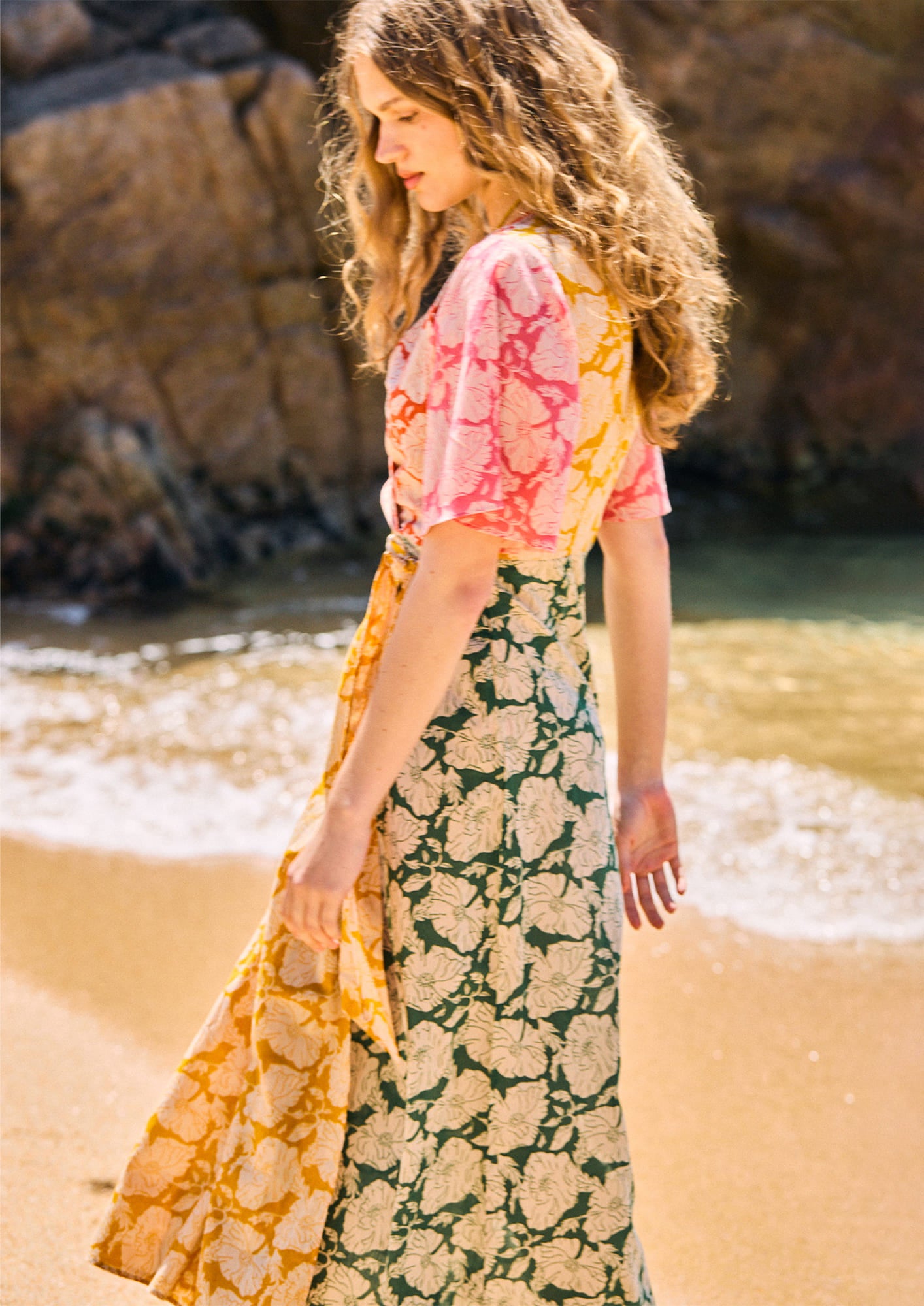 Vestido midi con un diseño de bloques de color en con estampado floral en distintos tonos. Escote en forma de «V» y corte cruzado. La cintura se ajusta con un lazo lateral para acentuar la silueta. Manga corta y amplia.